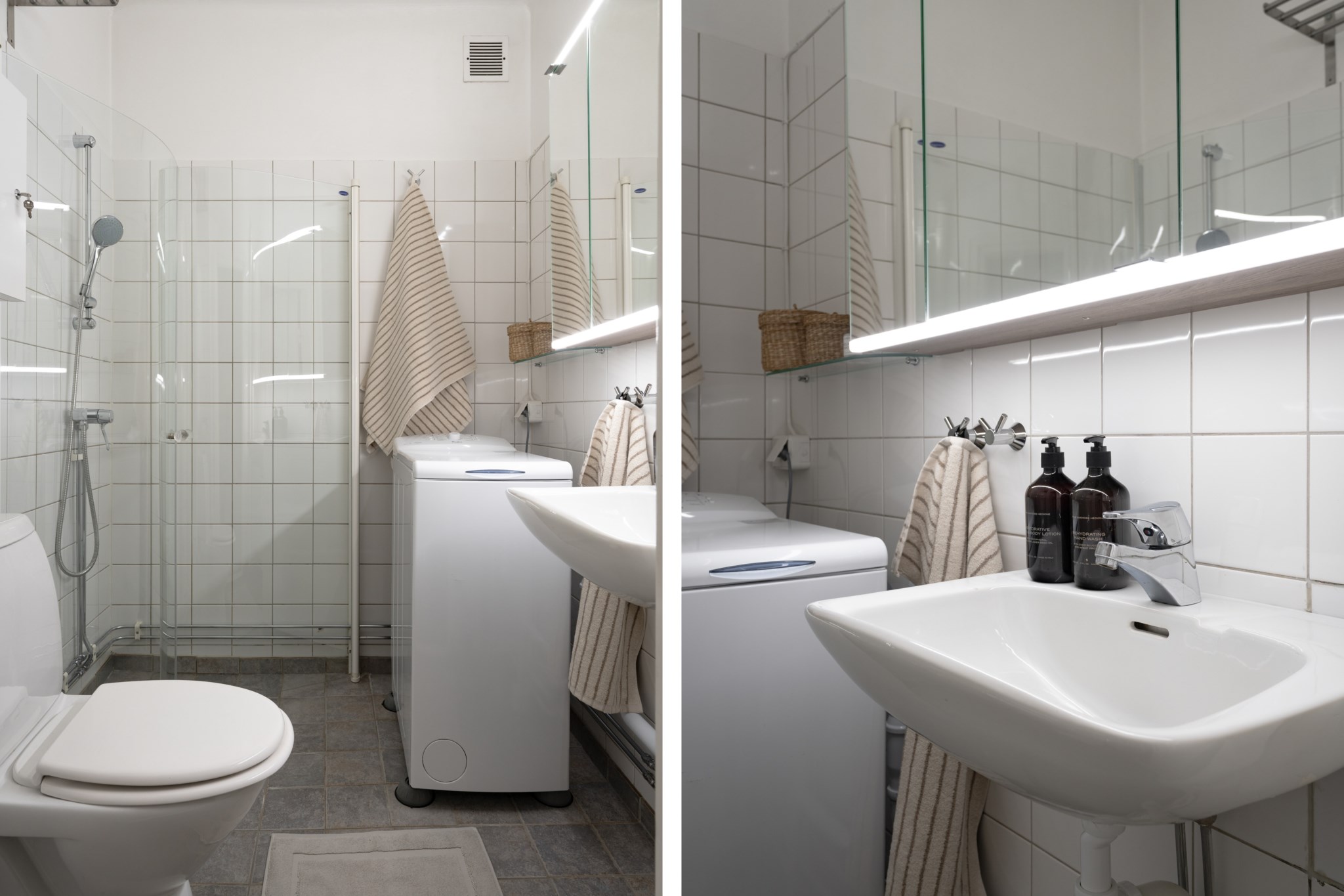 Rymligt badrum med kakel i vitt och klinker i grått. Badrummet är utrustat med WC, handfat, spegelskåp med belysning, samt dusch med glasvägg. Extra bekvämligheter genom en tvättmaskin.
