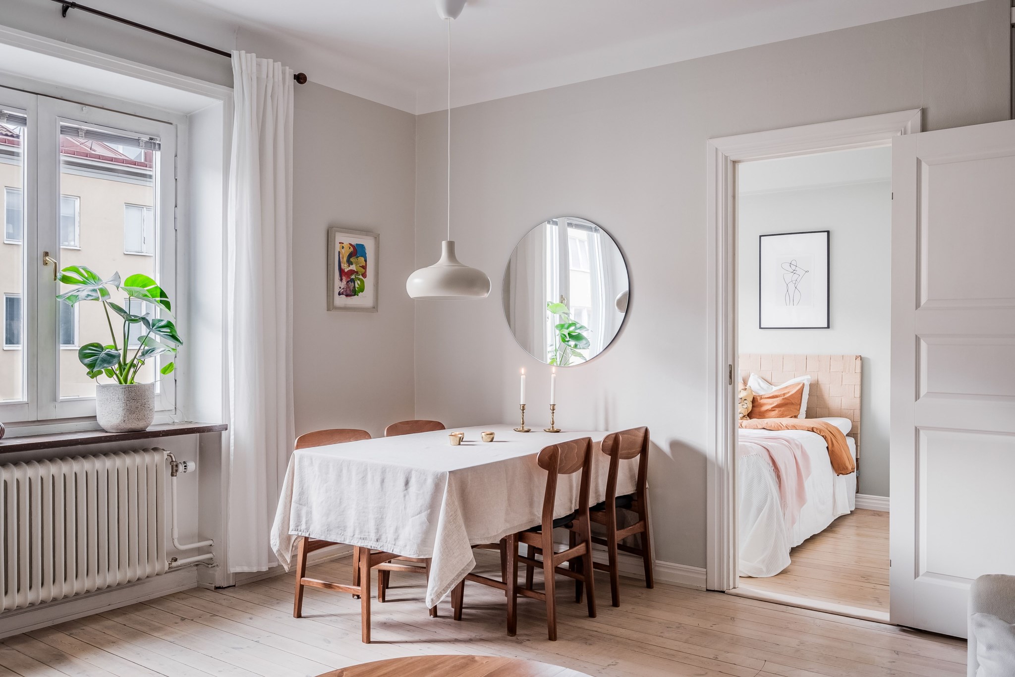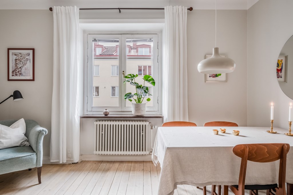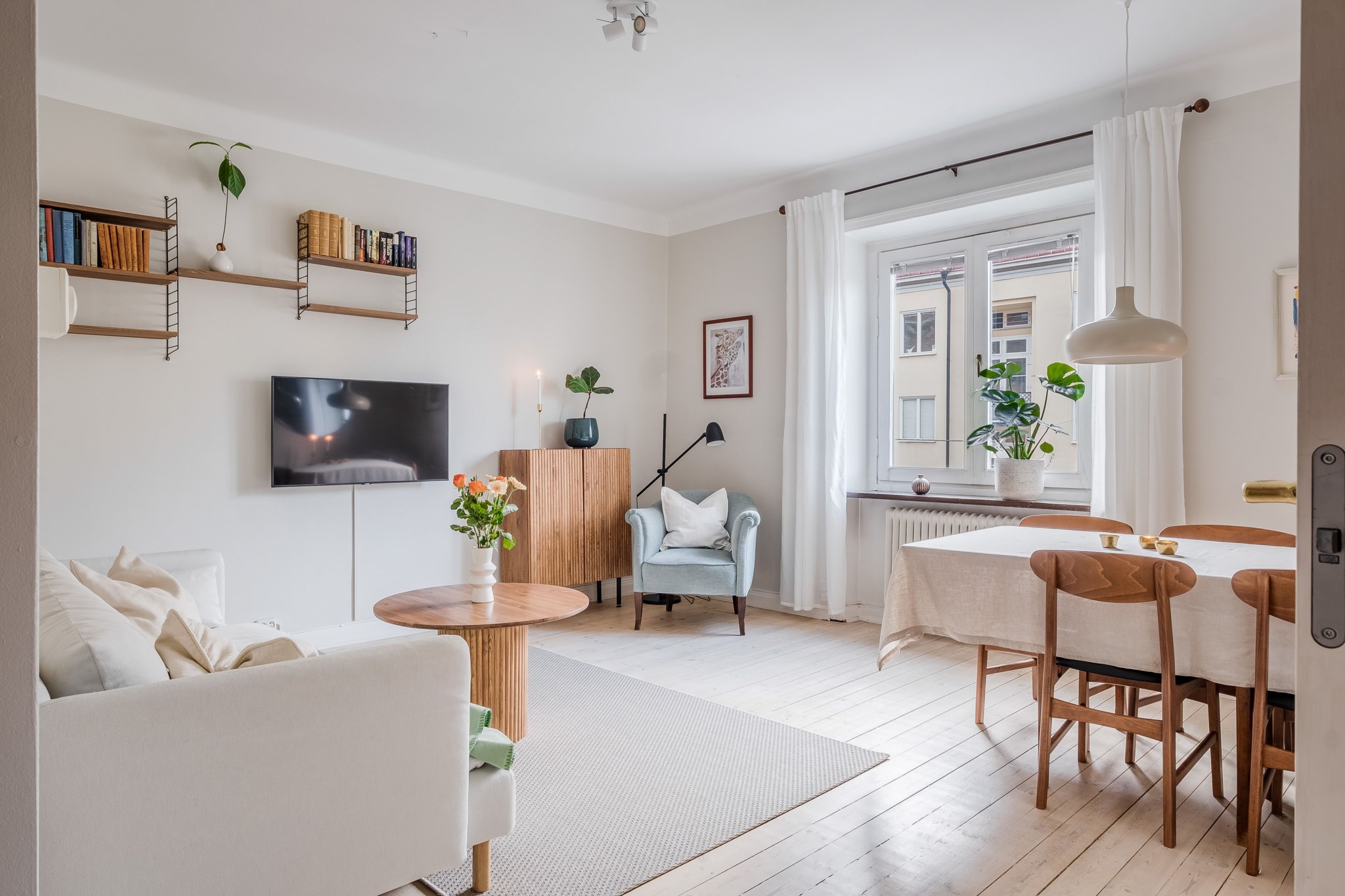 Detta hem präglas av stora fönster, vitlaserade furugolv och generös takhöjd som skapar en rymlig och luftig känsla. Den öppna planlösningen mellan kök och vardagsrum ger en härlig social yta. Vardagsrummet är lätt att möblera och har plats för både soffgrupp och matplats. Köket är modernt och funktionellt med gott om förvaring och inkluderar en diskmaskin. Sovrummet erbjuder en lugn atmosfär med utrymme för en större säng. Det fräscha, helkaklade badrummet ger ett stilrent intryck och är utrustat med tvättmaskin. Dessutom finns gott om förvaringsutrymme i en rymlig klädkammare samt två tillhörande förråd.