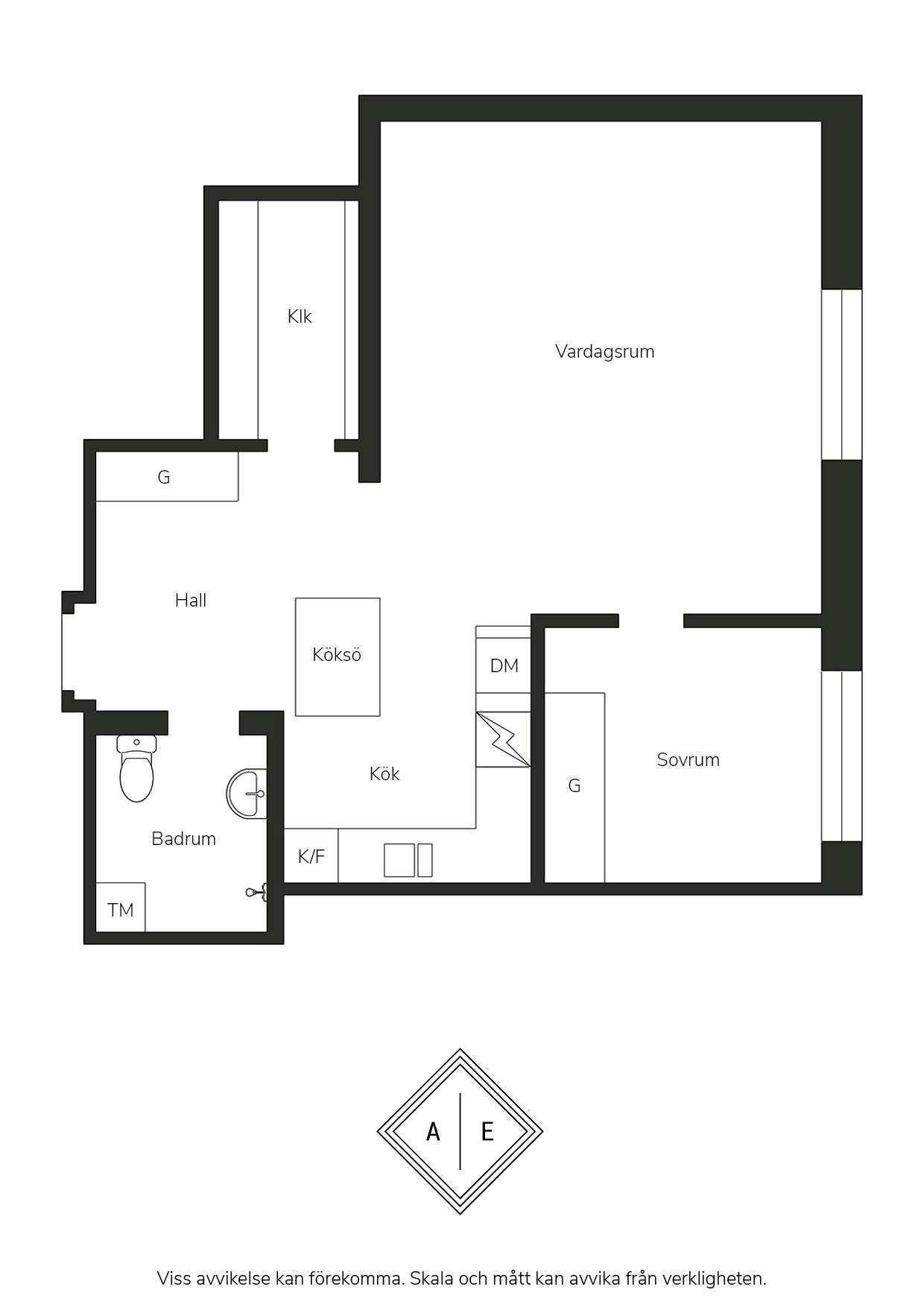 44,9 kvm och 1 rok enligt förenings information, disponeras som en 2 rok.