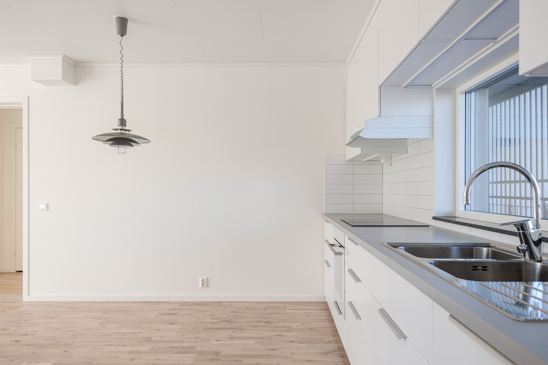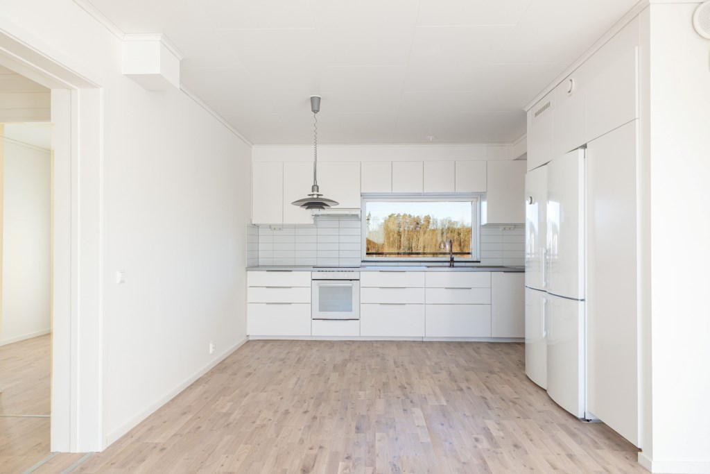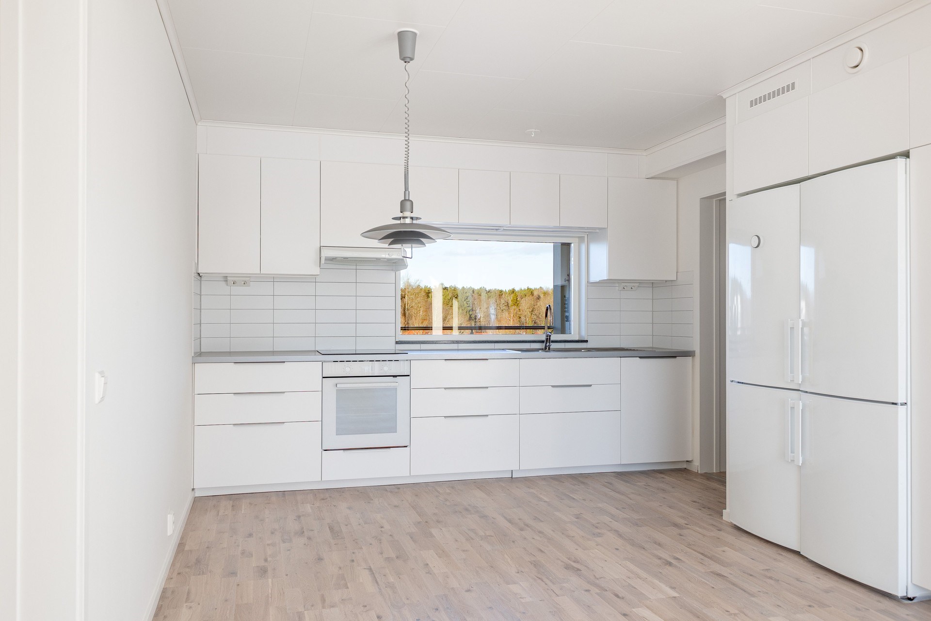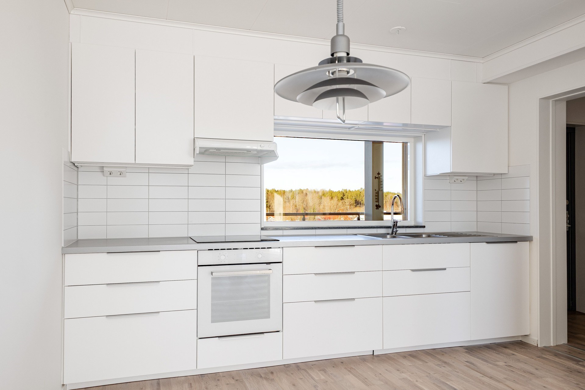 Modernt och lättarbetat kök. Kök med ljusa stilrena köksluckor som kombineras med ett vitt kakel ovan arbetsyta. Den maskinella utrustningen består av kyl, frys, ugn, spishäll, micro och diskmaskin. Väggarna är målade och golvet belagt med parkettgolv. Fönster vid diskoho med fri utsikt.