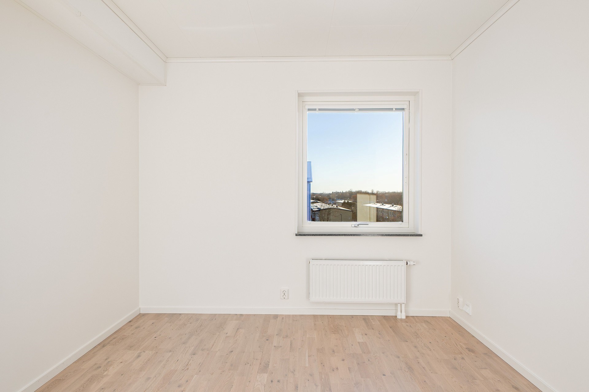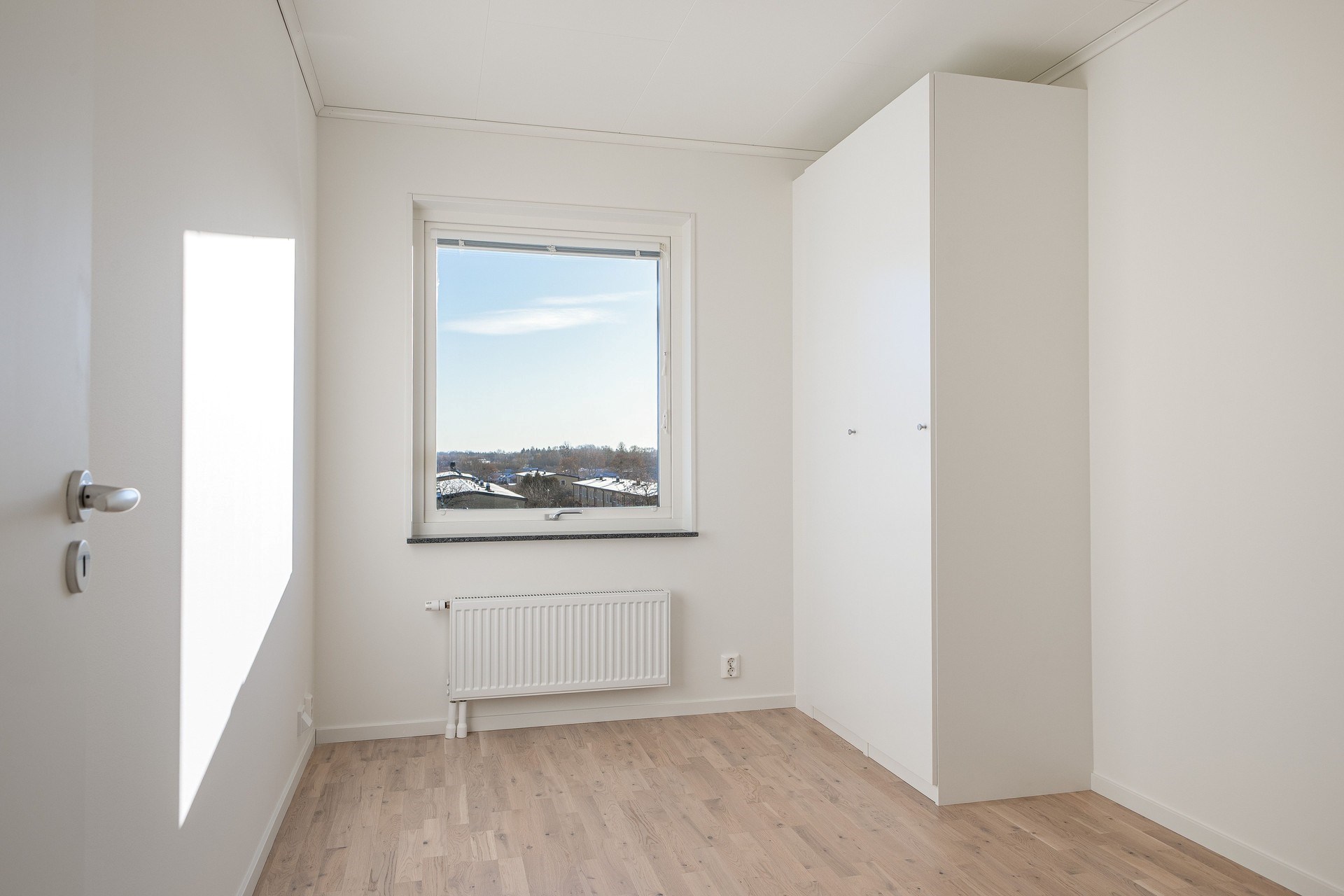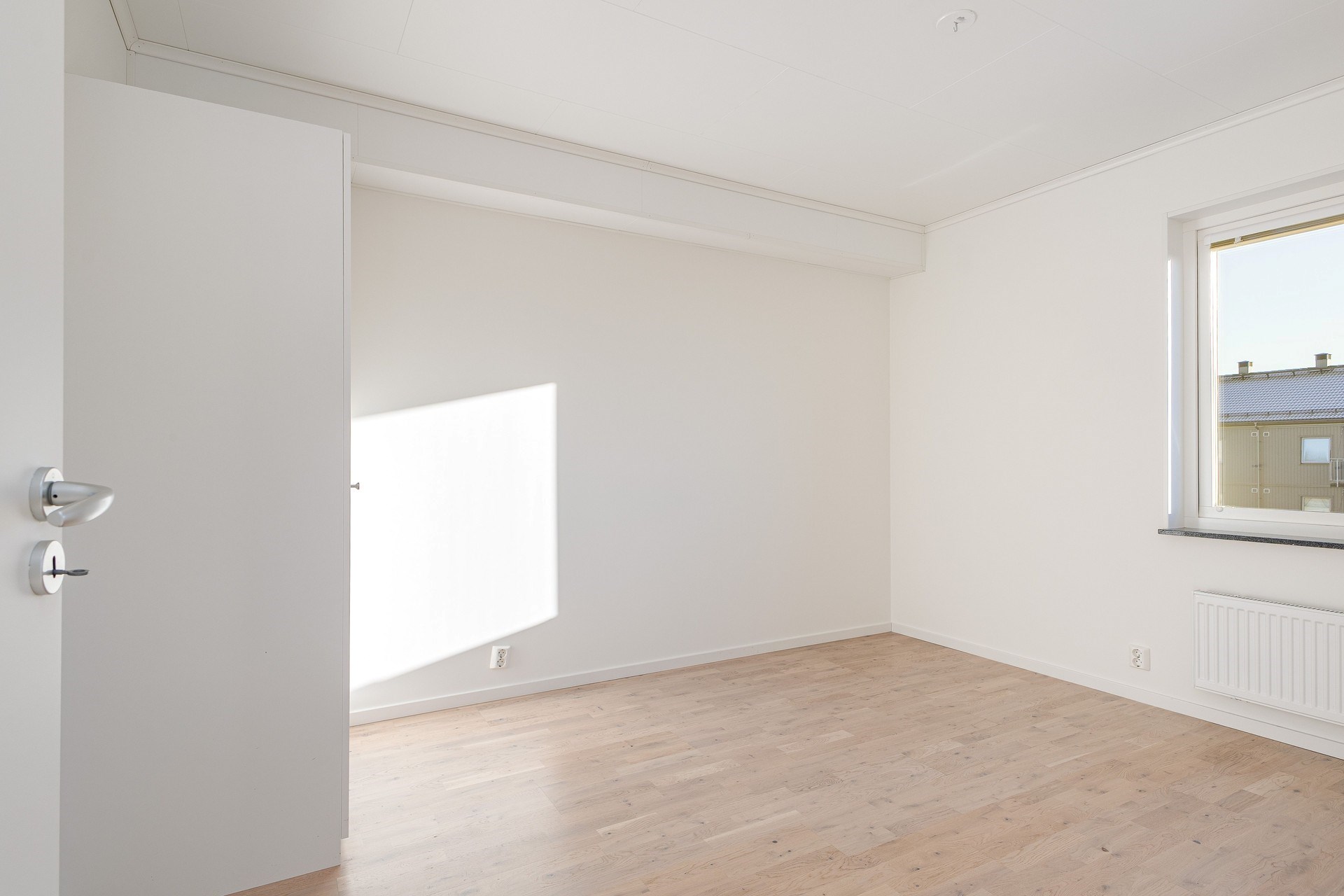 Sovrum med målade väggar och parkettgolv. Gott om plats för säng och sängbord. Ljus från fönster utan insyn.