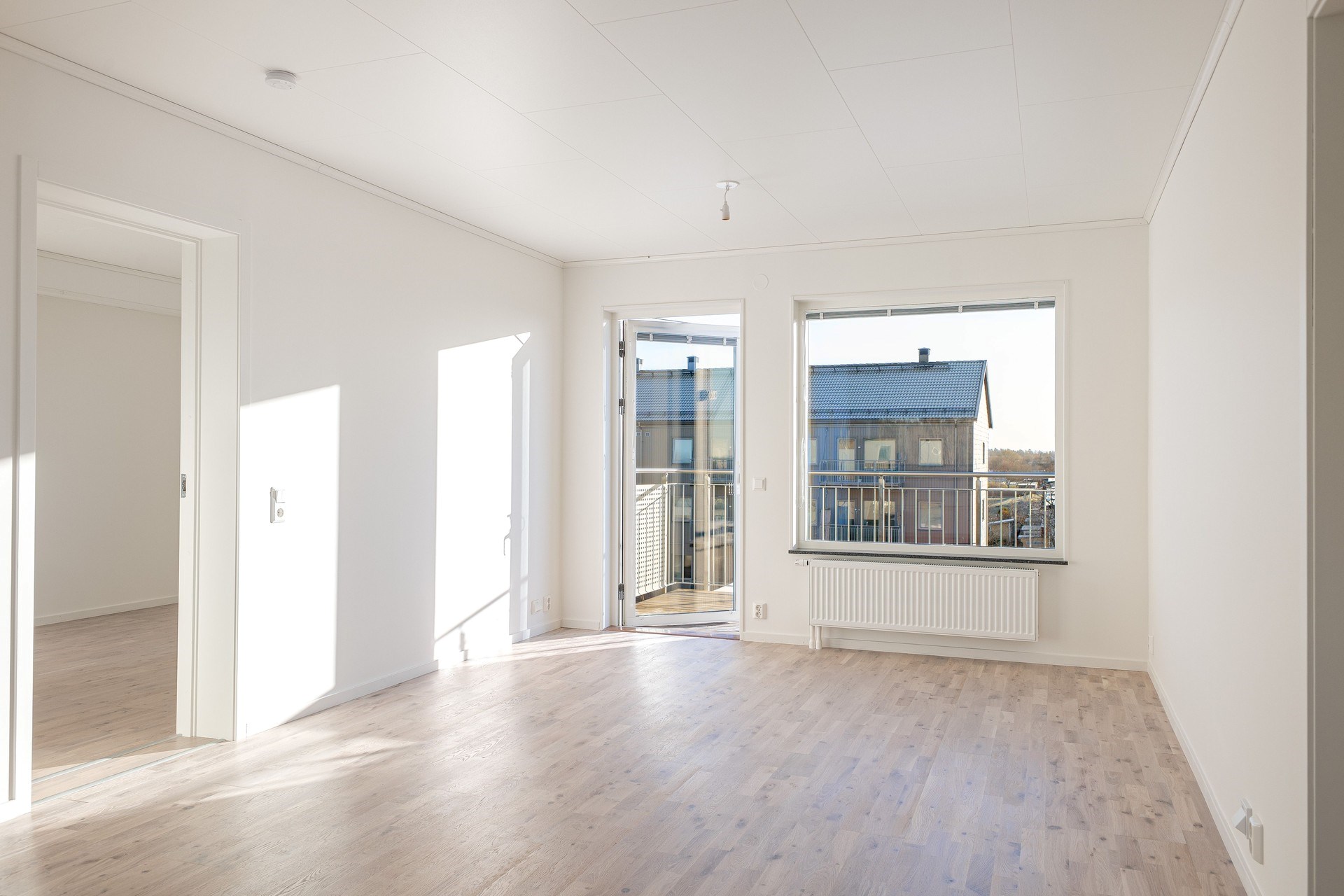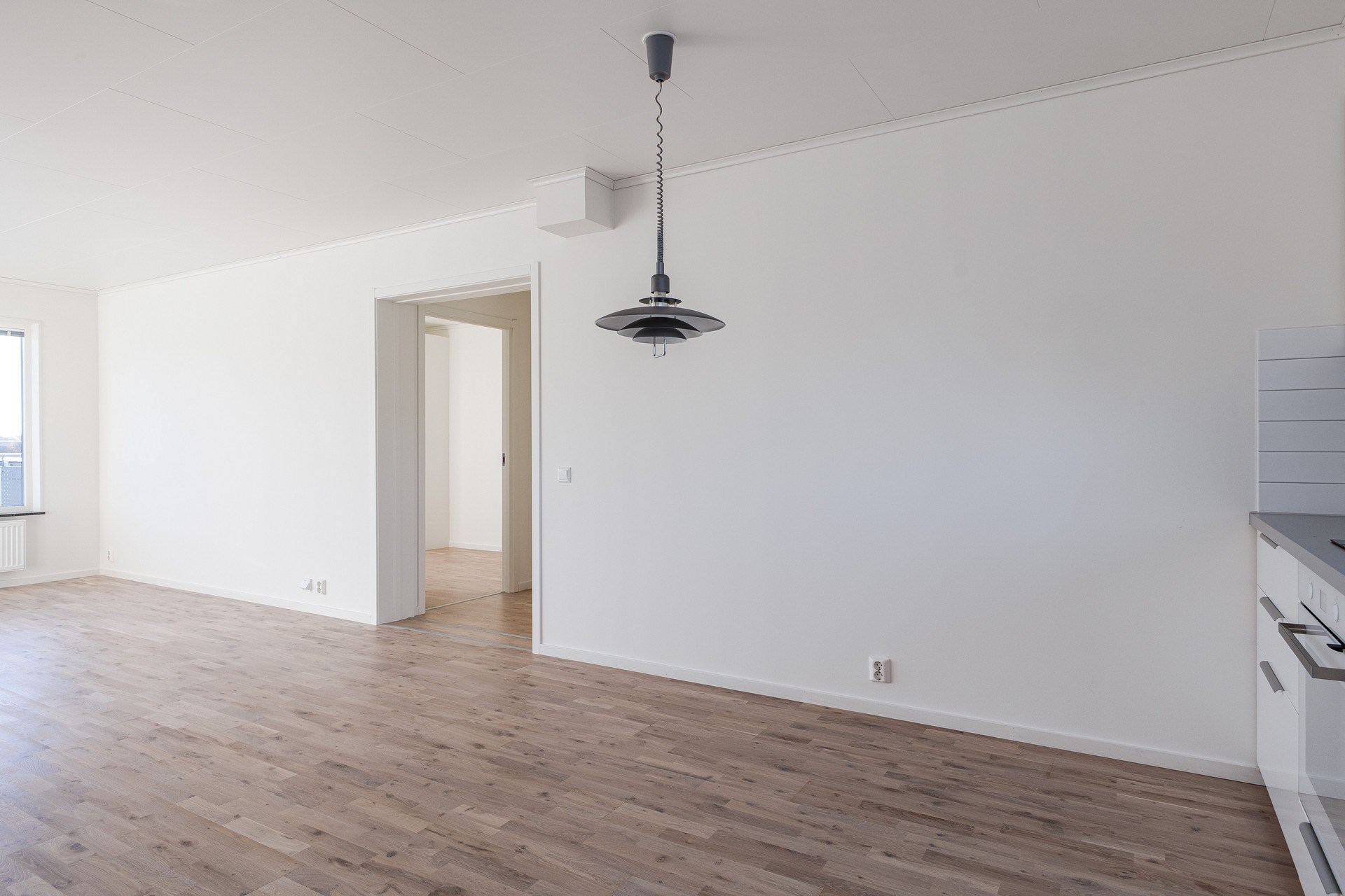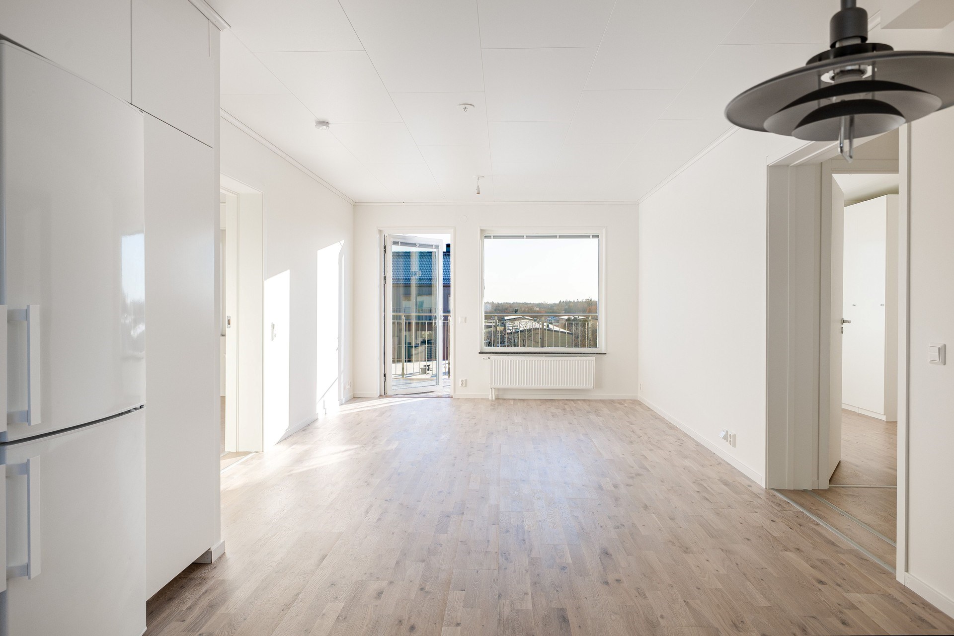 Vardagsrum med öppen planlösning mot kök, plats till stor sällskapsdel med soffa, bord och fåtölj utan att trängas. Härifrån nås den härliga balkongen – en perfekt plats att njuta av solen och den fria utsikten. Hela bostaden har nyrenoverade ytskikt som ger känslan att ni är första ägare. Stor hiss och små och smidiga trösklar gör bostaden passande till både familjen och köpare med behov av bra framkomlighet.