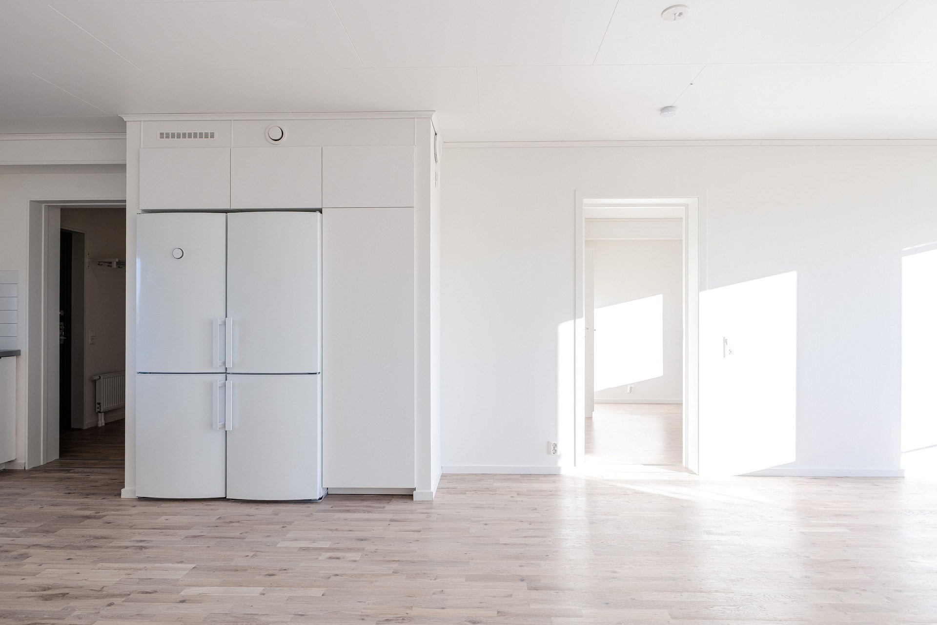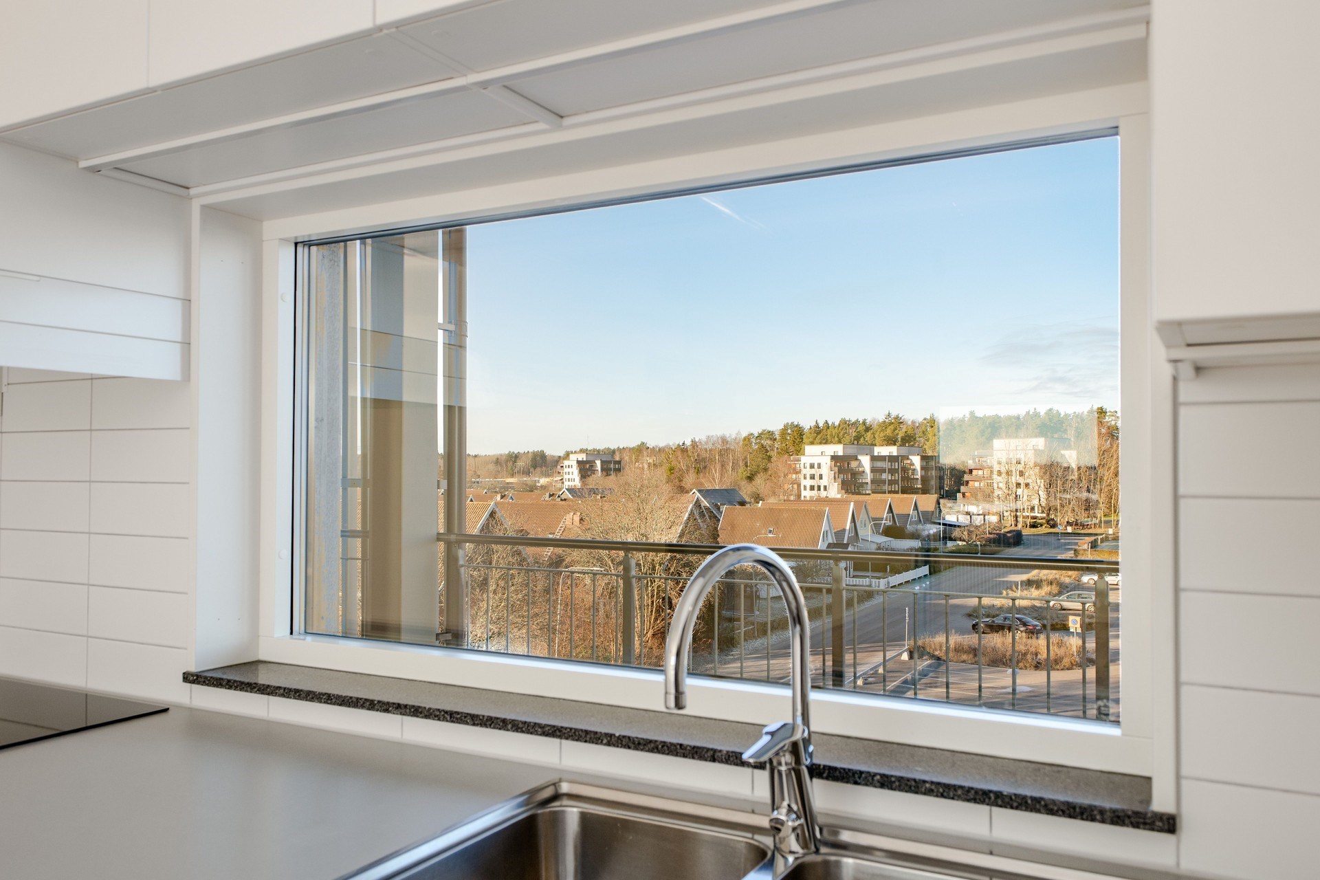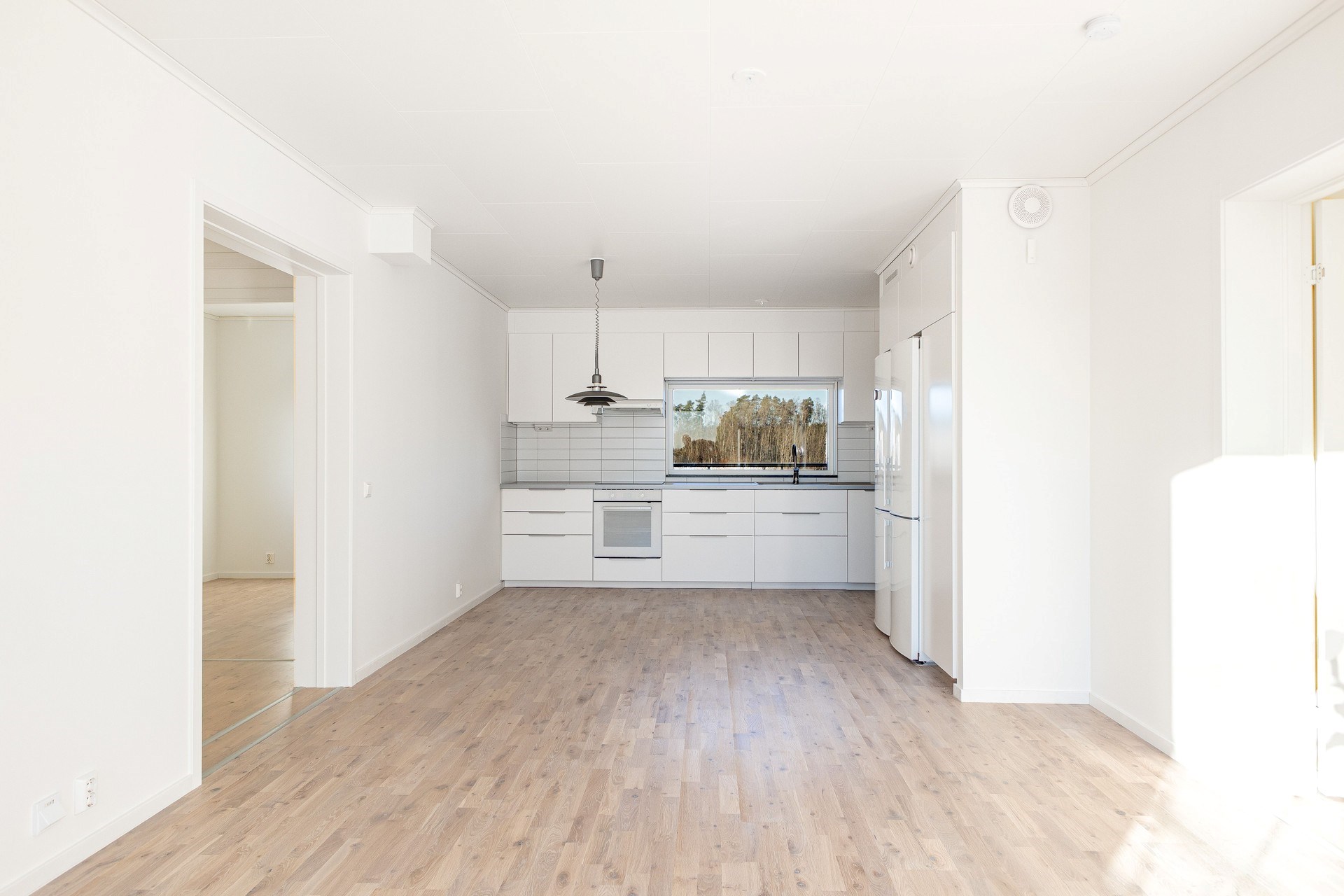Vardagsrum med öppen planlösning mot kök, plats till stor sällskapsdel med soffa, bord och fåtölj utan att trängas. Härifrån nås den härliga balkongen – en perfekt plats att njuta av solen och den fria utsikten. Hela bostaden har nyrenoverade ytskikt som ger känslan att ni är första ägare. Stor hiss och små och smidiga trösklar gör bostaden passande till både familjen och köpare med behov av bra framkomlighet.