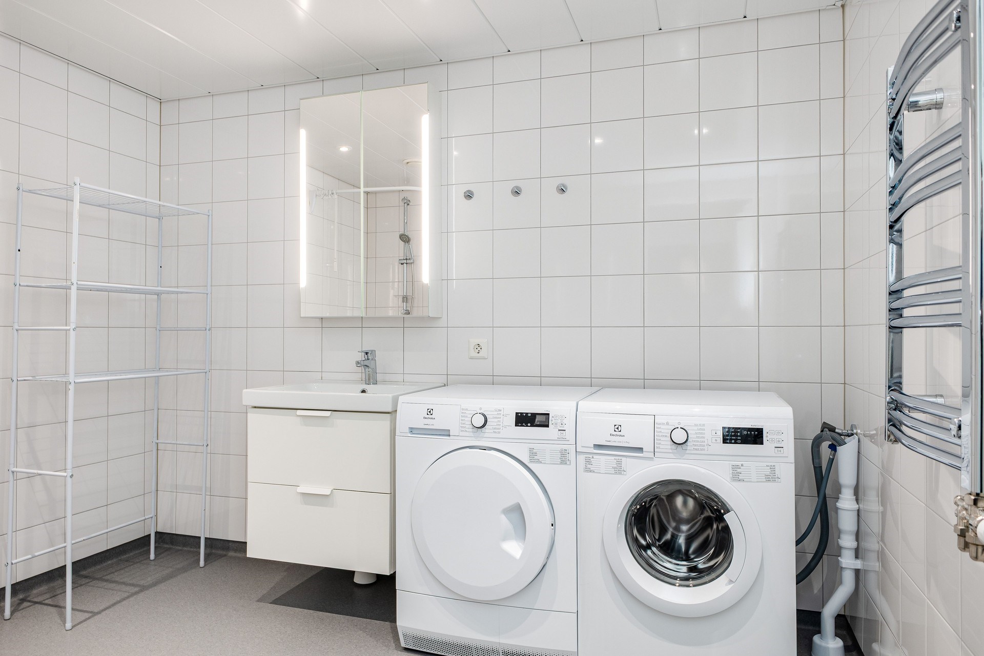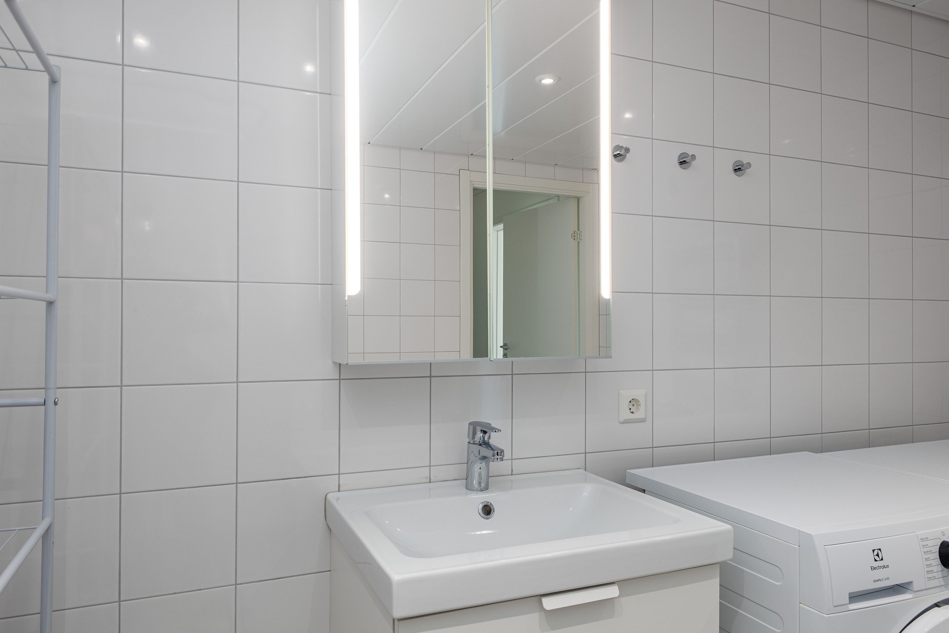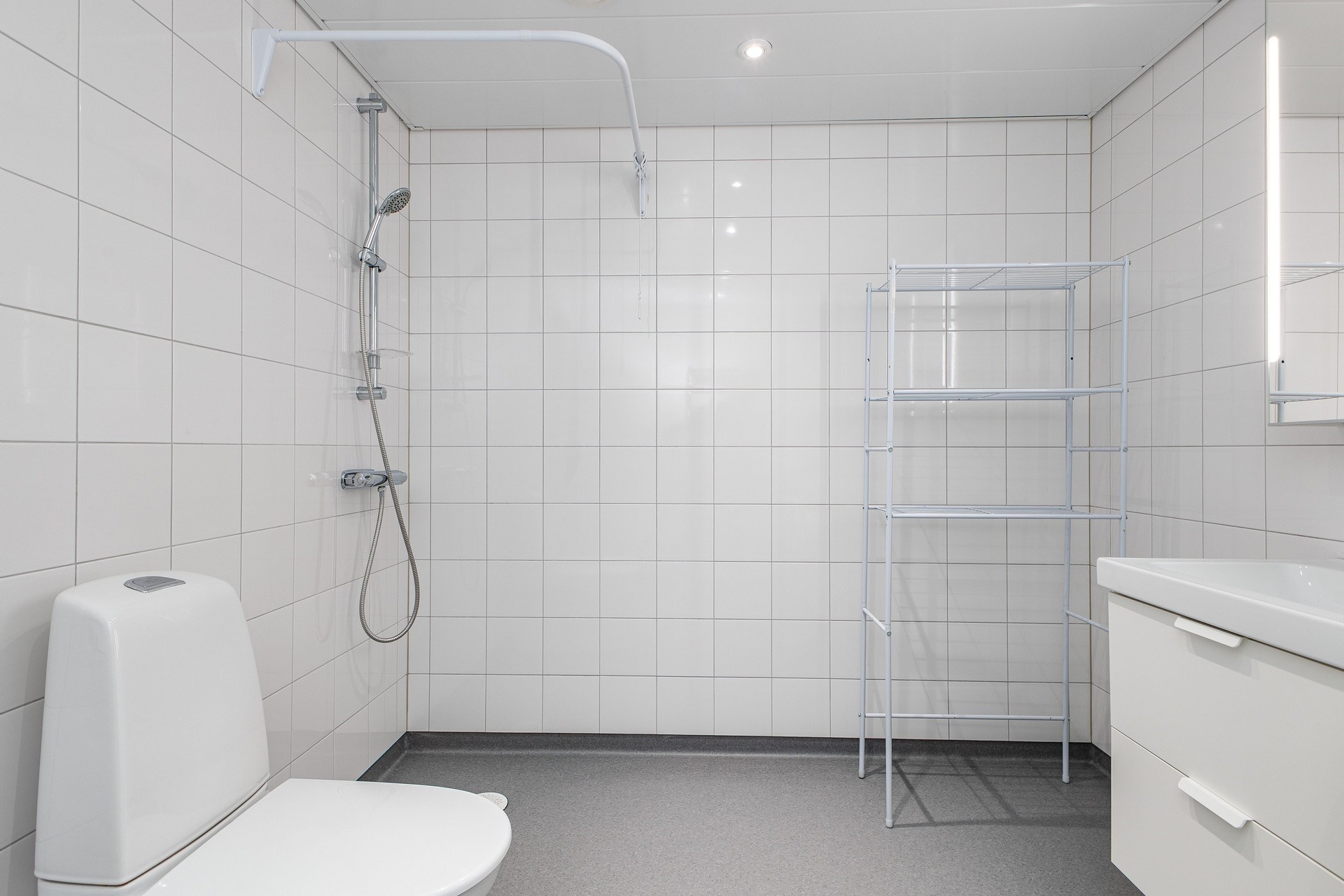 Helkaklat badrum med ljust kakel på väggarna och plastmatta på golv. Badrummet är utrustat med WC, kommod, spegel, tvättmaskin, torktumlare, handdukstork och dusch.