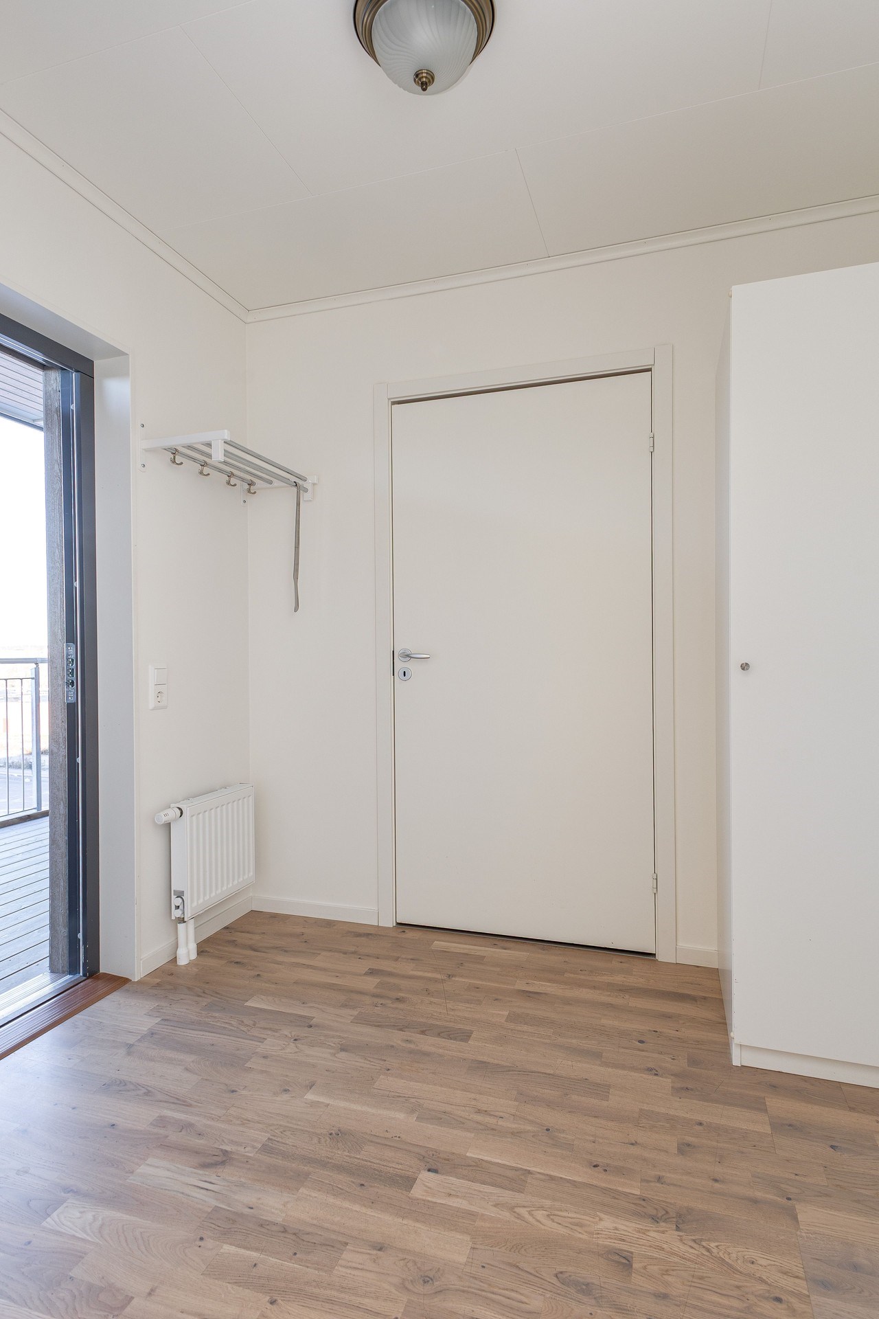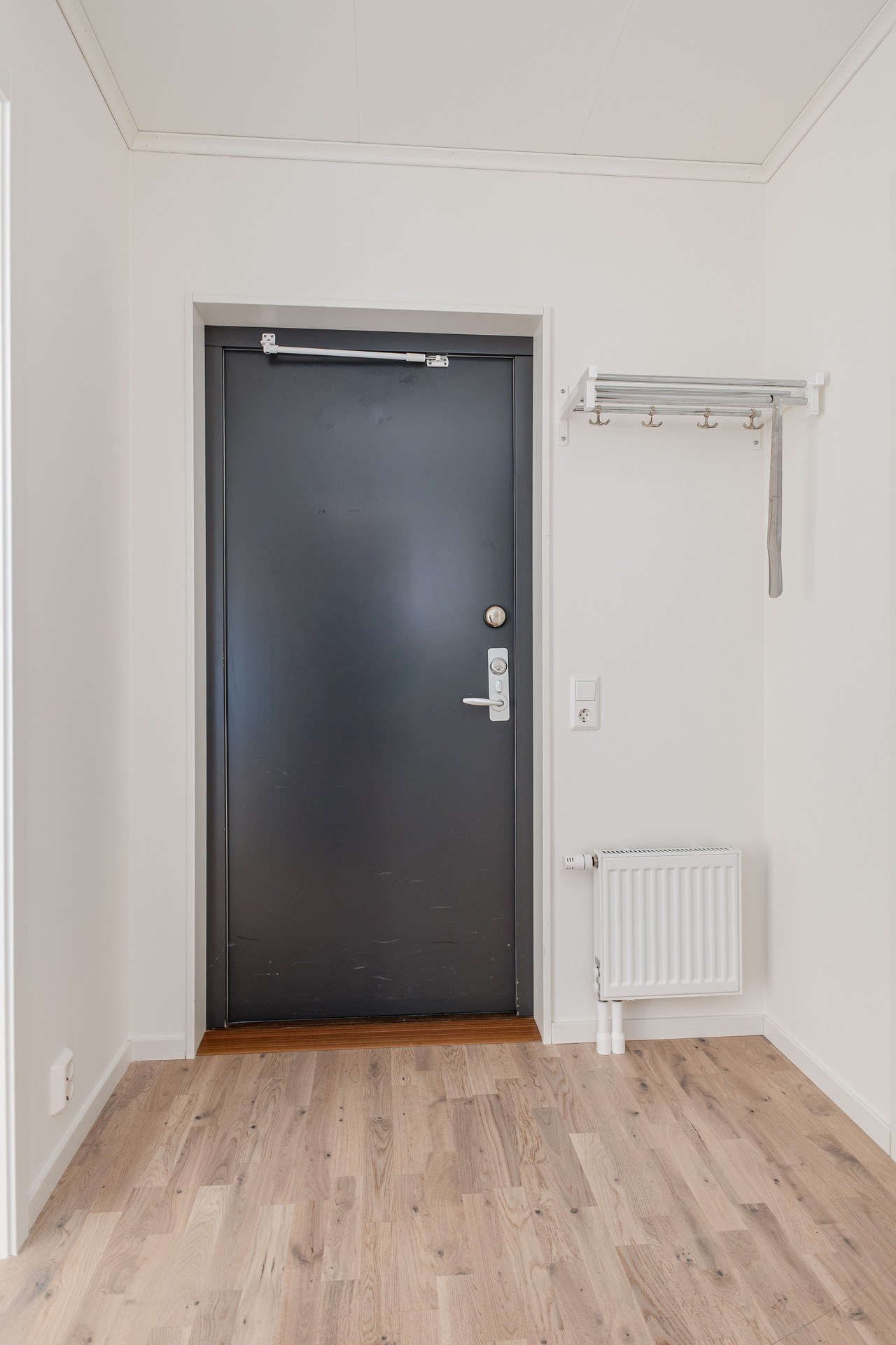 Välkomnande hall med ljust målade väggar och parkettgolv. Hallen erbjuder plats till avhängningsmöjligheter för ytterkläder, skor precis intill ytterdörren och ytterligare förvaring i angränsande klädkammare.