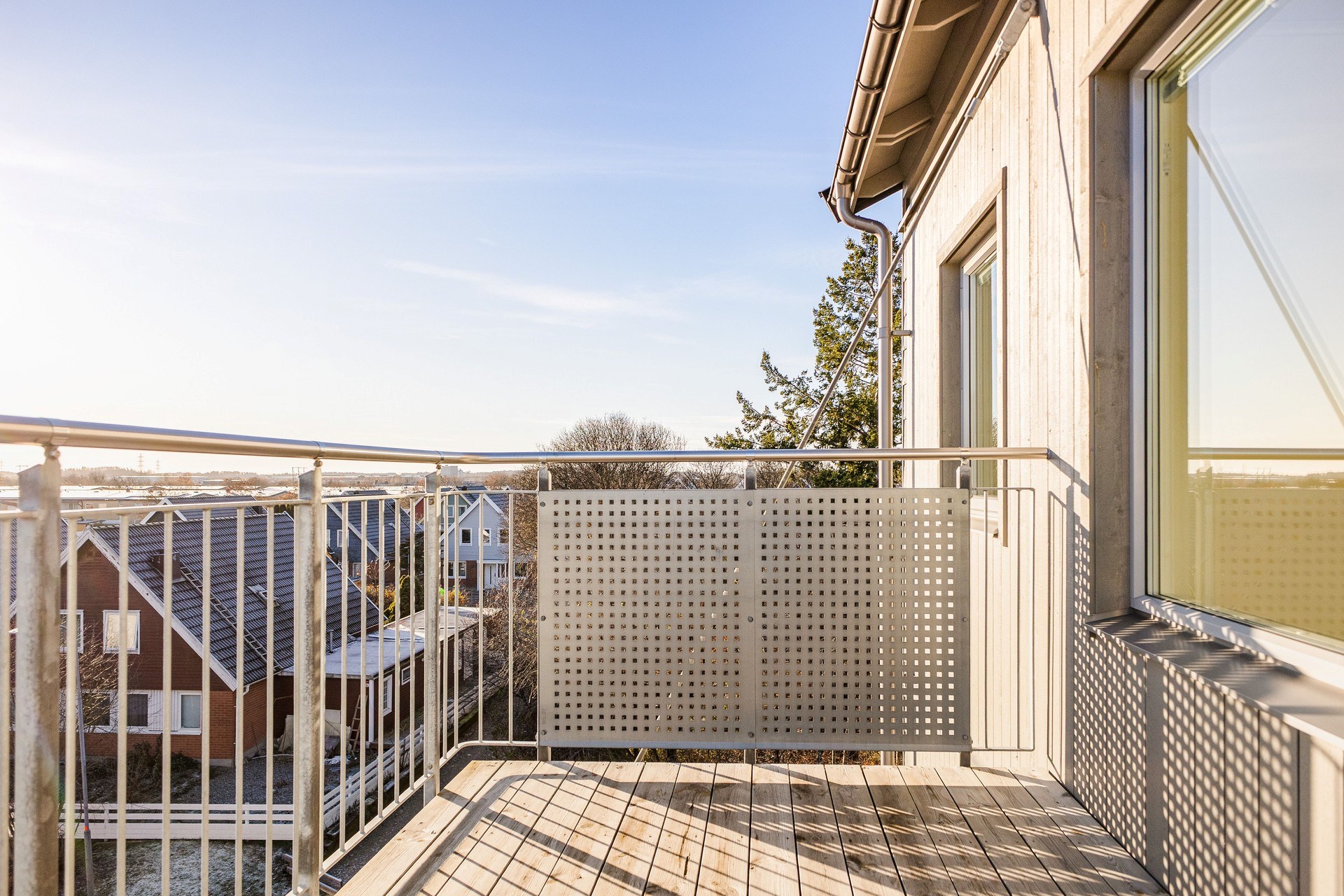 Stor balkong i söderläge med fri utsikt. Gott om plats till bord och stolar.