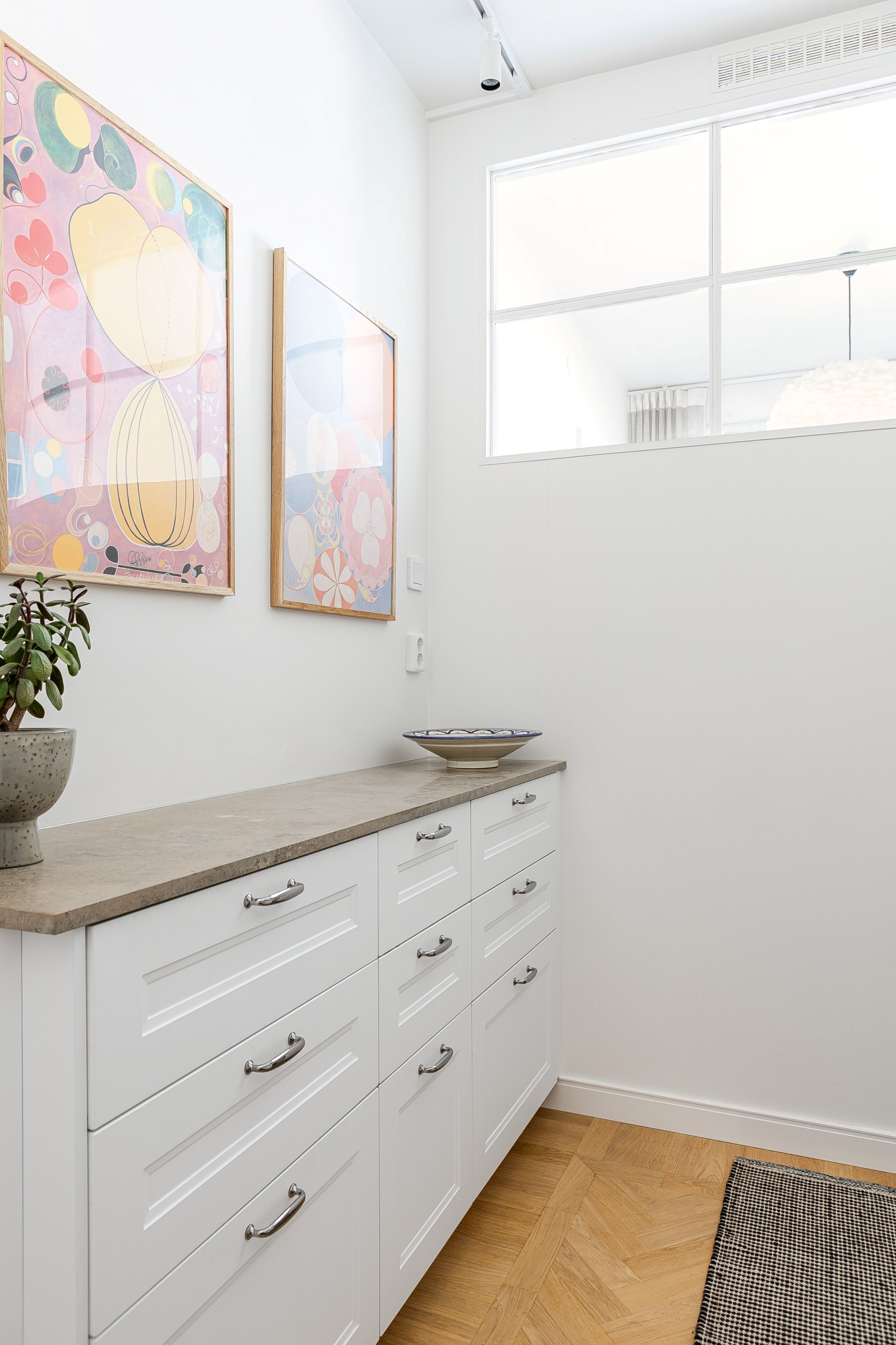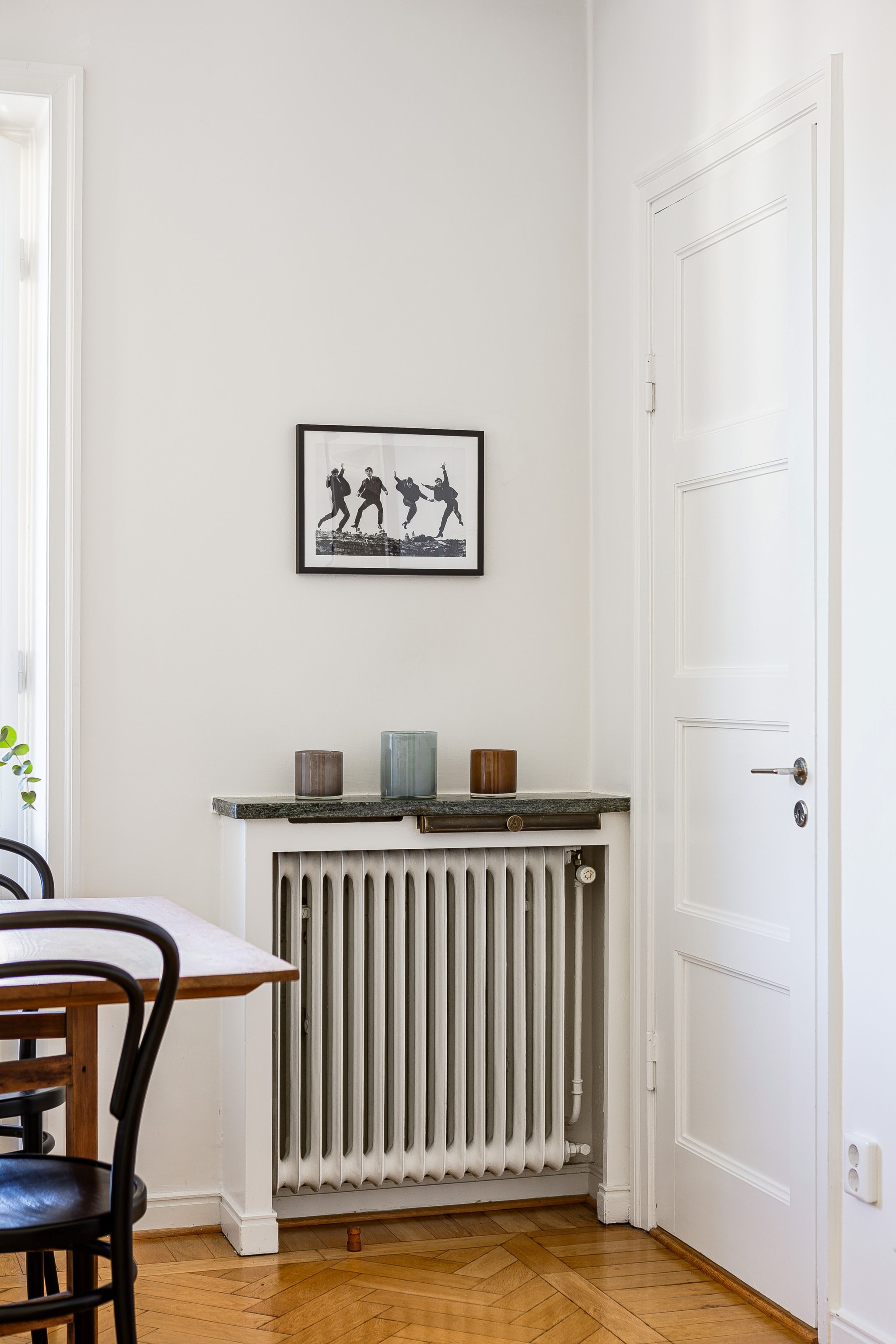 Bostaden kombinerar modern komfort med tidlös elegans. Fiskbensparkett, generös takhöjd och stora fönsterpartier ger ett fantastiskt ljusinsläpp härlig genomgående rymd i hela bostaden.