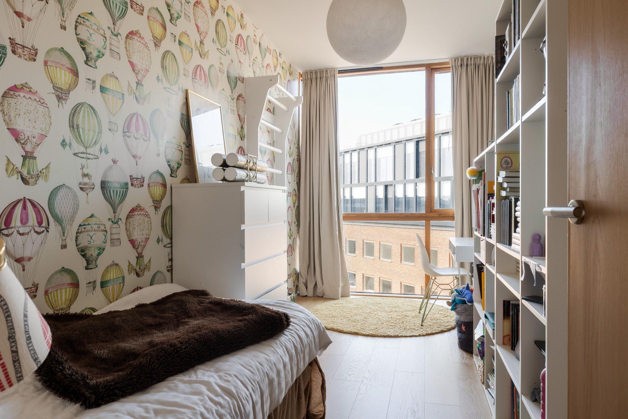 Sovrum med plats för mindre säng och övrigt möblemang efter behov. Tapetserade väggar och parkettgolv.