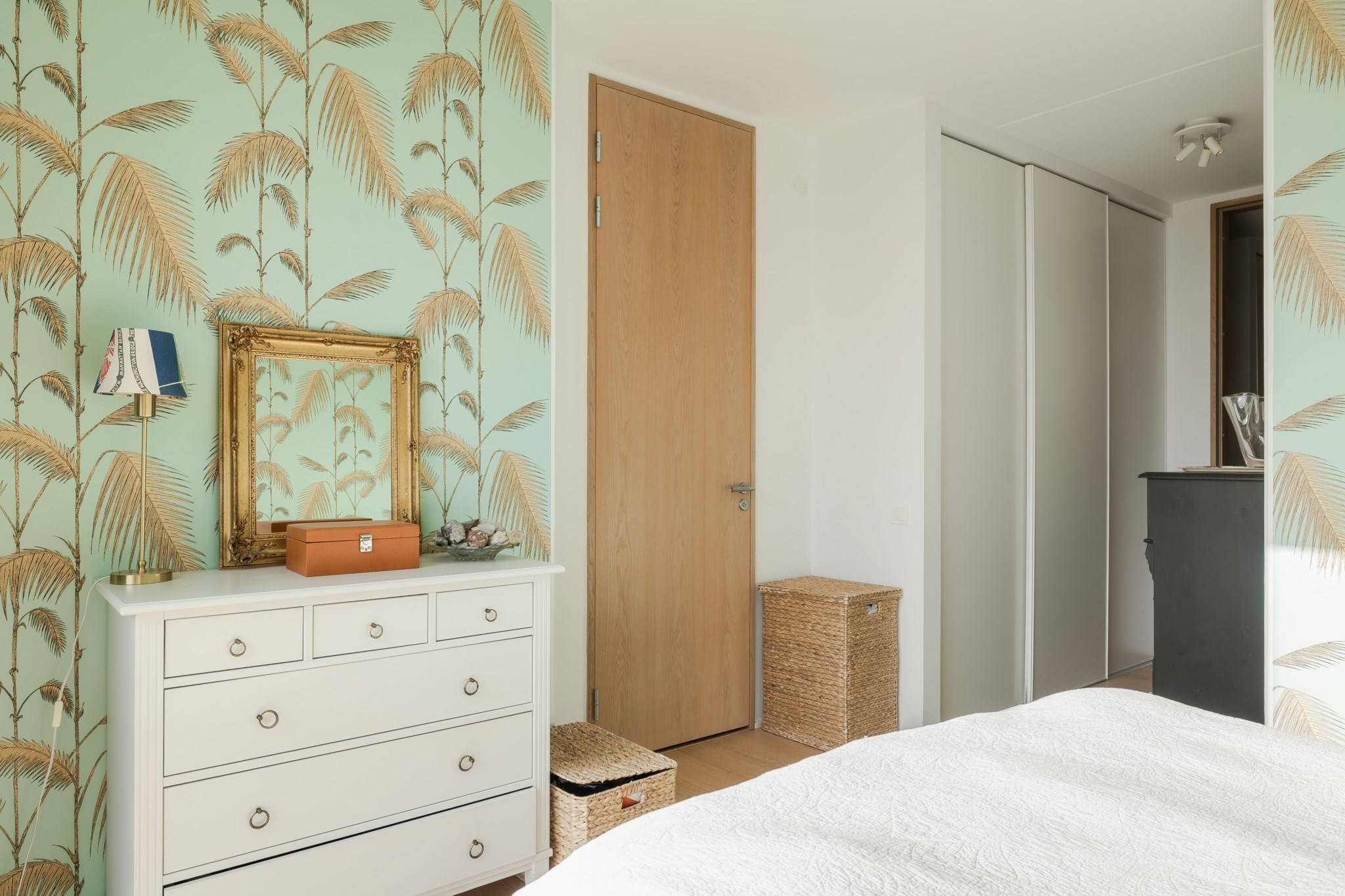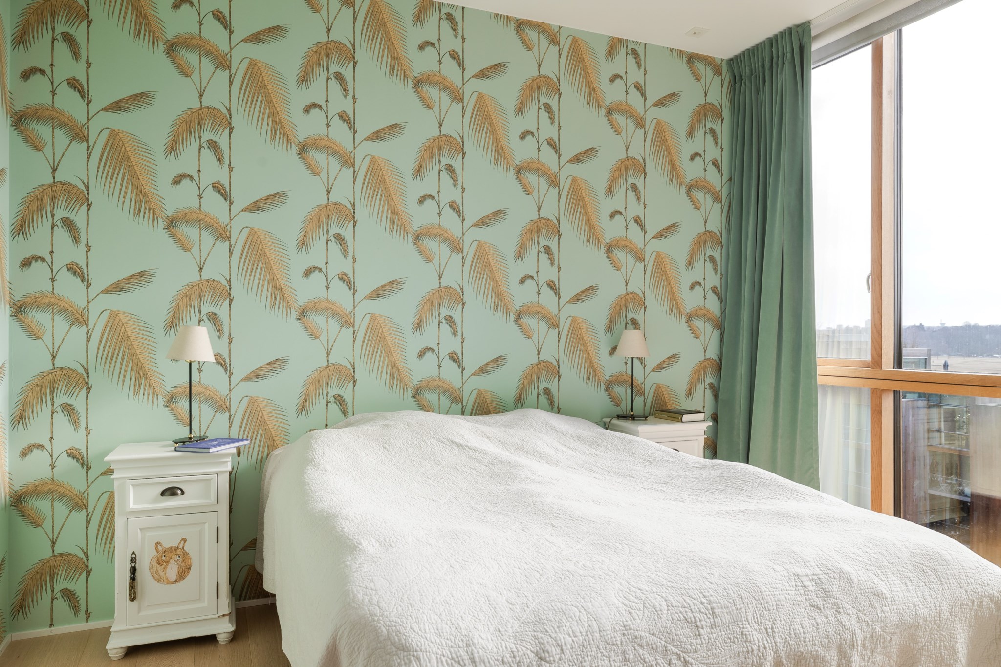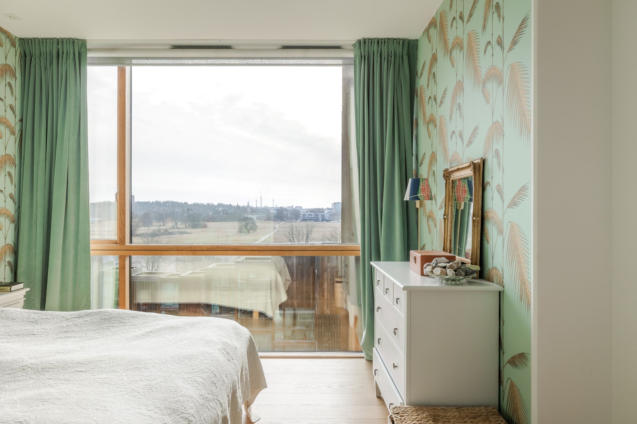 Master bedroom med stort fönsterparti som ger ett generöst ljusinsläpp. Panoramautsikt i sydlig riktning med utsikt över Gärdet, Djurgården och Södermalm. Plats för dubbelsäng med tillhörande sängbord. God förvaring i garderob bakom skjutdörrar med möjlighet att komplettera med ytterligare förvaringsmöbler vid behov. Direkt access till eget badrum. Ljusa ytskikt kombinerat med tapetserade väggar och parkettgolv.