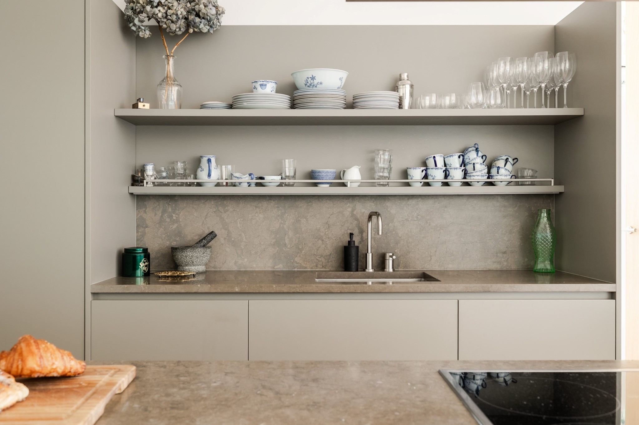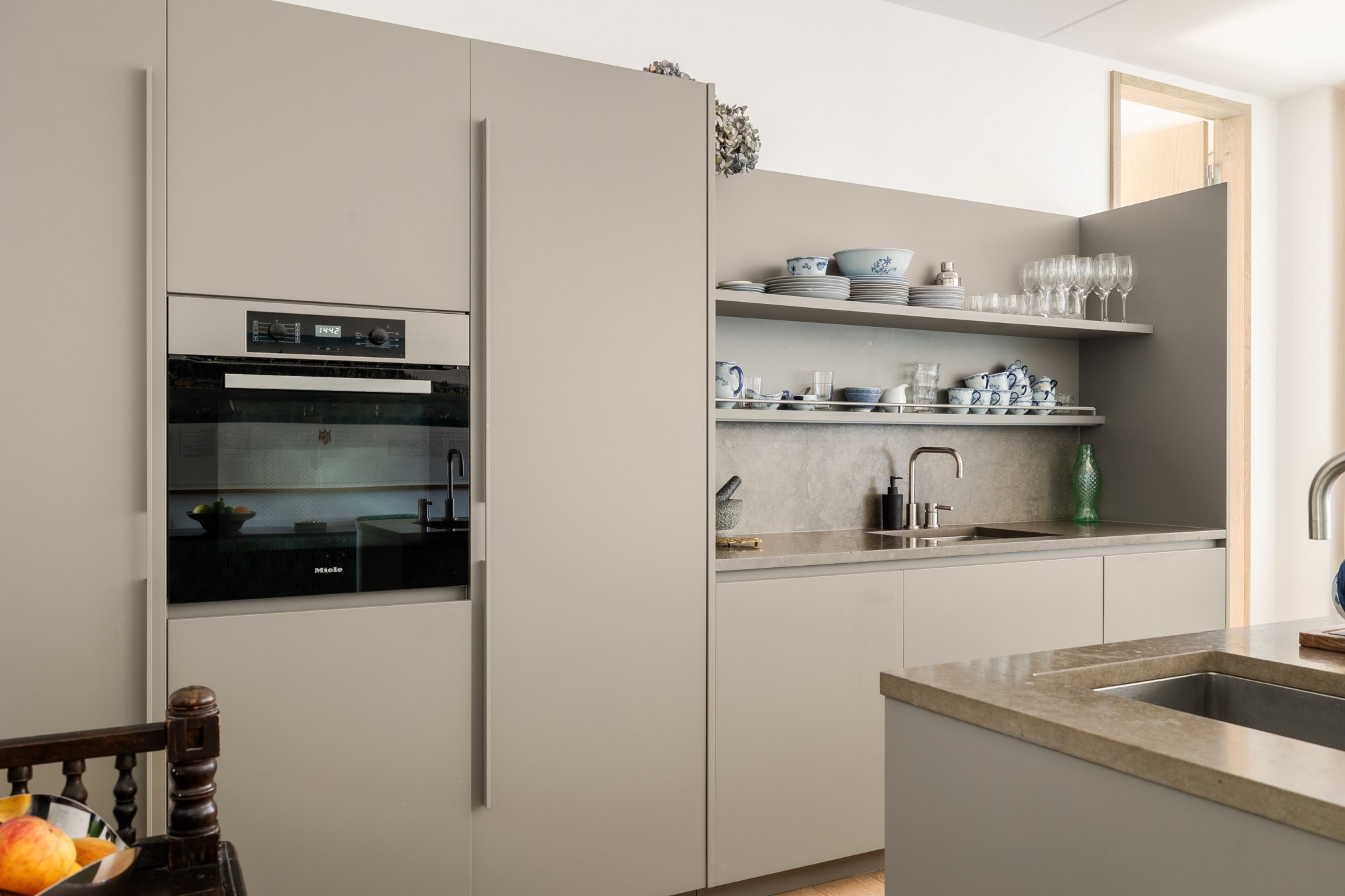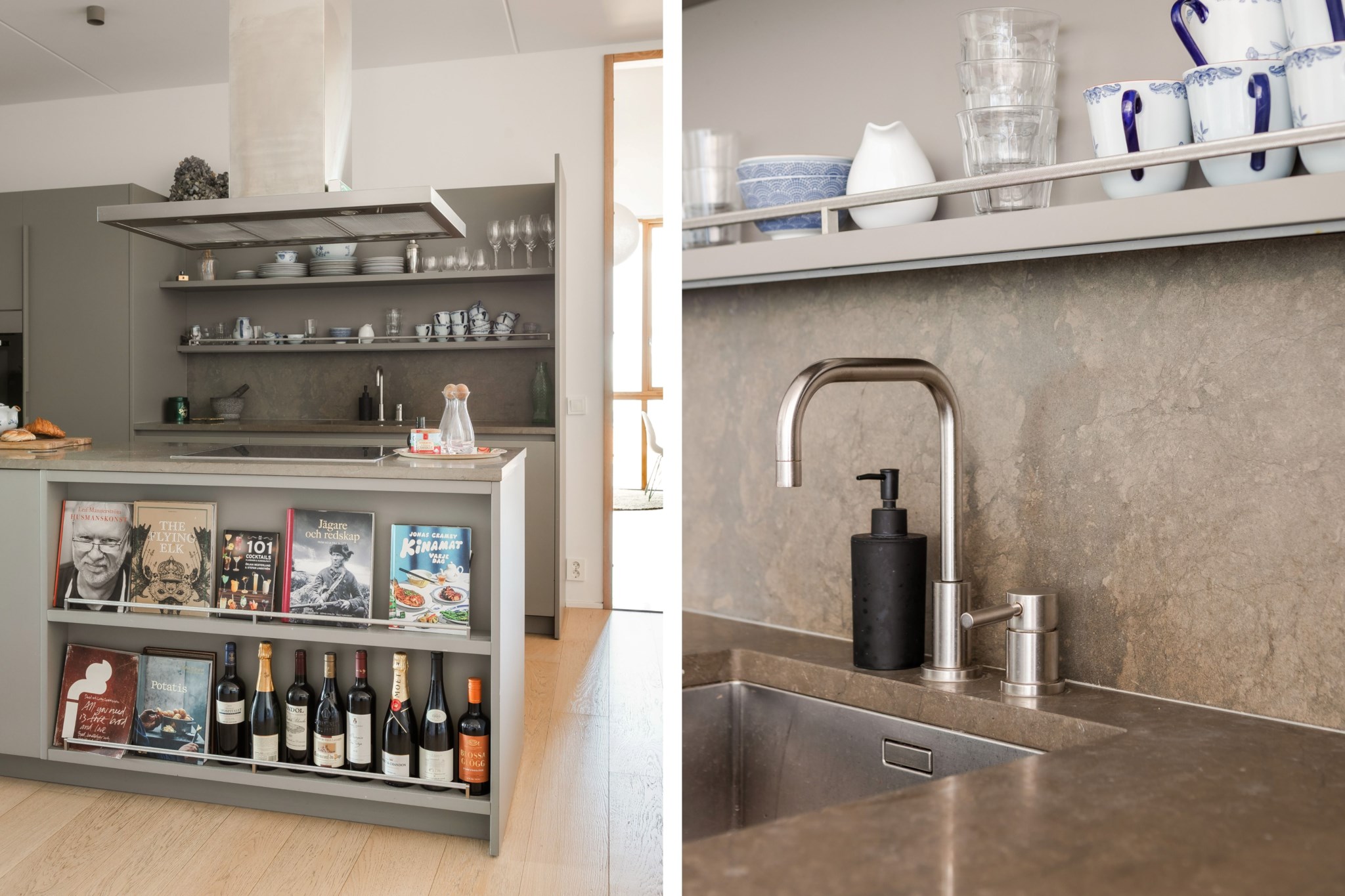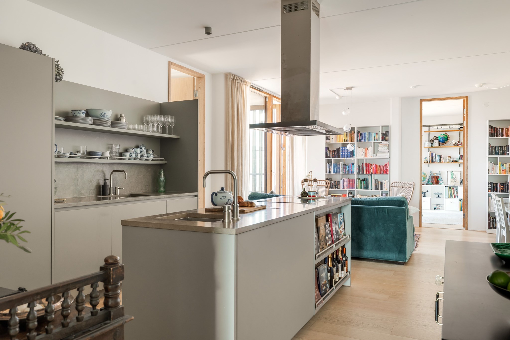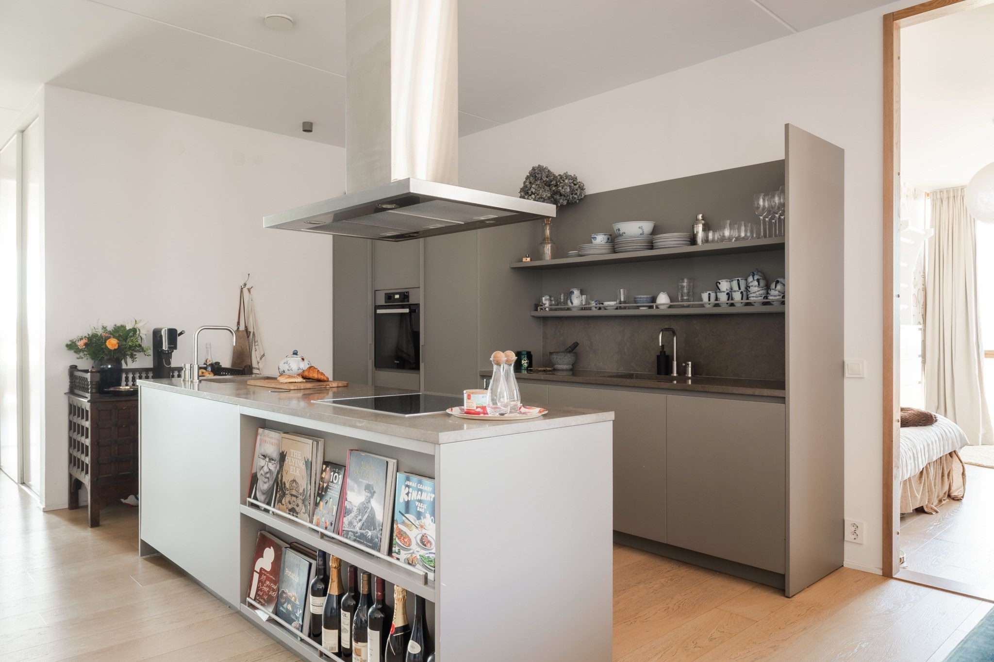 Modernt kök med fina materialval och medvetna kulörval. Grå köksluckor kombineras med en marmorerad bänkskiva som även löper upp som stänkskydd. Köksö utrustad med spis och fläkt samt övrig maskinell utrustning i form av kyl, frys och diskmaskin. Öppen planlösning mot vardagsrum skapar en social och sammanhängande yta. Ljusmålade ytskikt och parkettgolv.