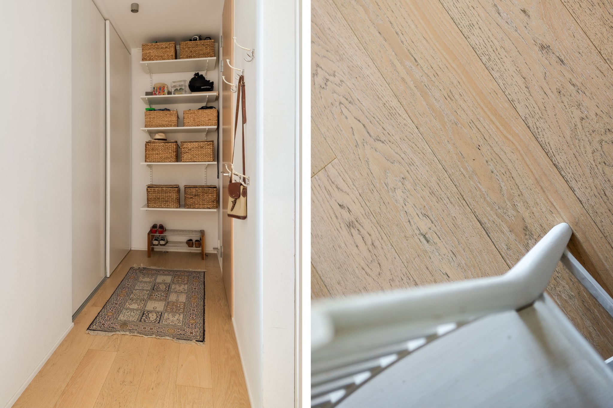 Välkomnande hall centralt placerad i bostaden med plats för avhängning samt förvaring i garderob med skjutdörrar. Ljusmålade ytskikt och parkettgolv.