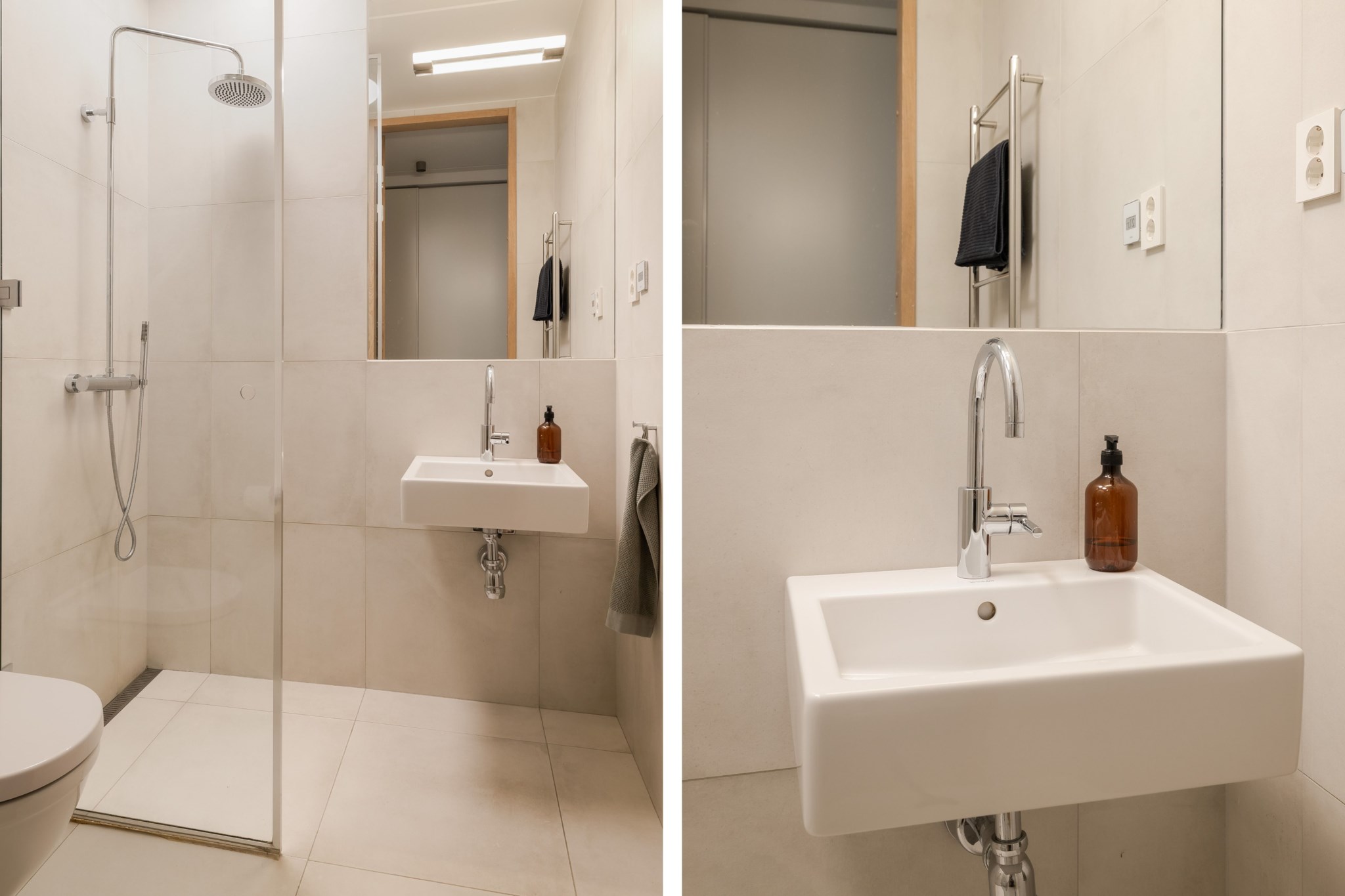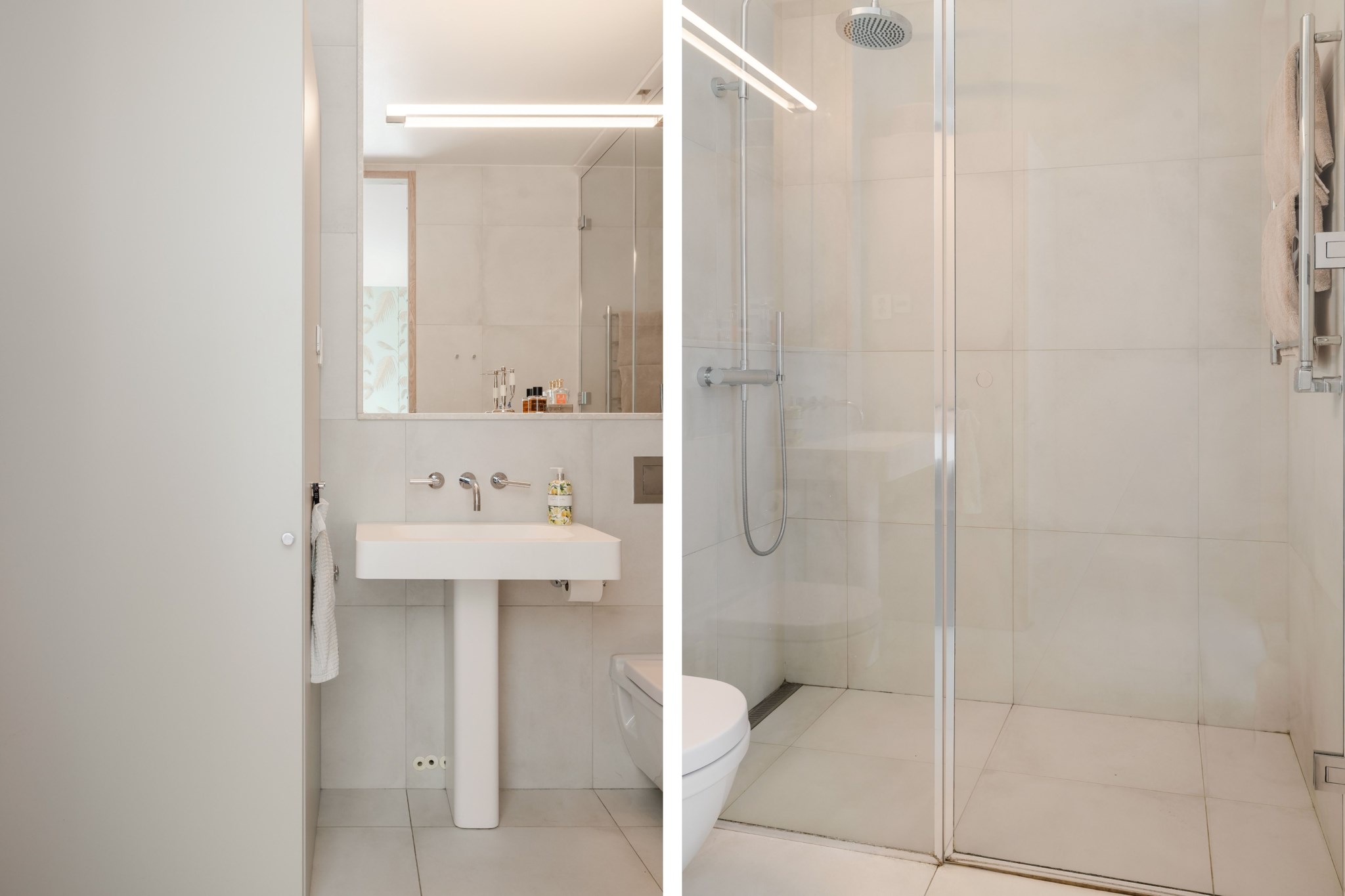 Ljust helkaklat badrum inrett med wc, handfat, stor spegel och tvättpelare. Duschhörna utrustad med takdusch, handdukstork samt duschvägg i klarglas.