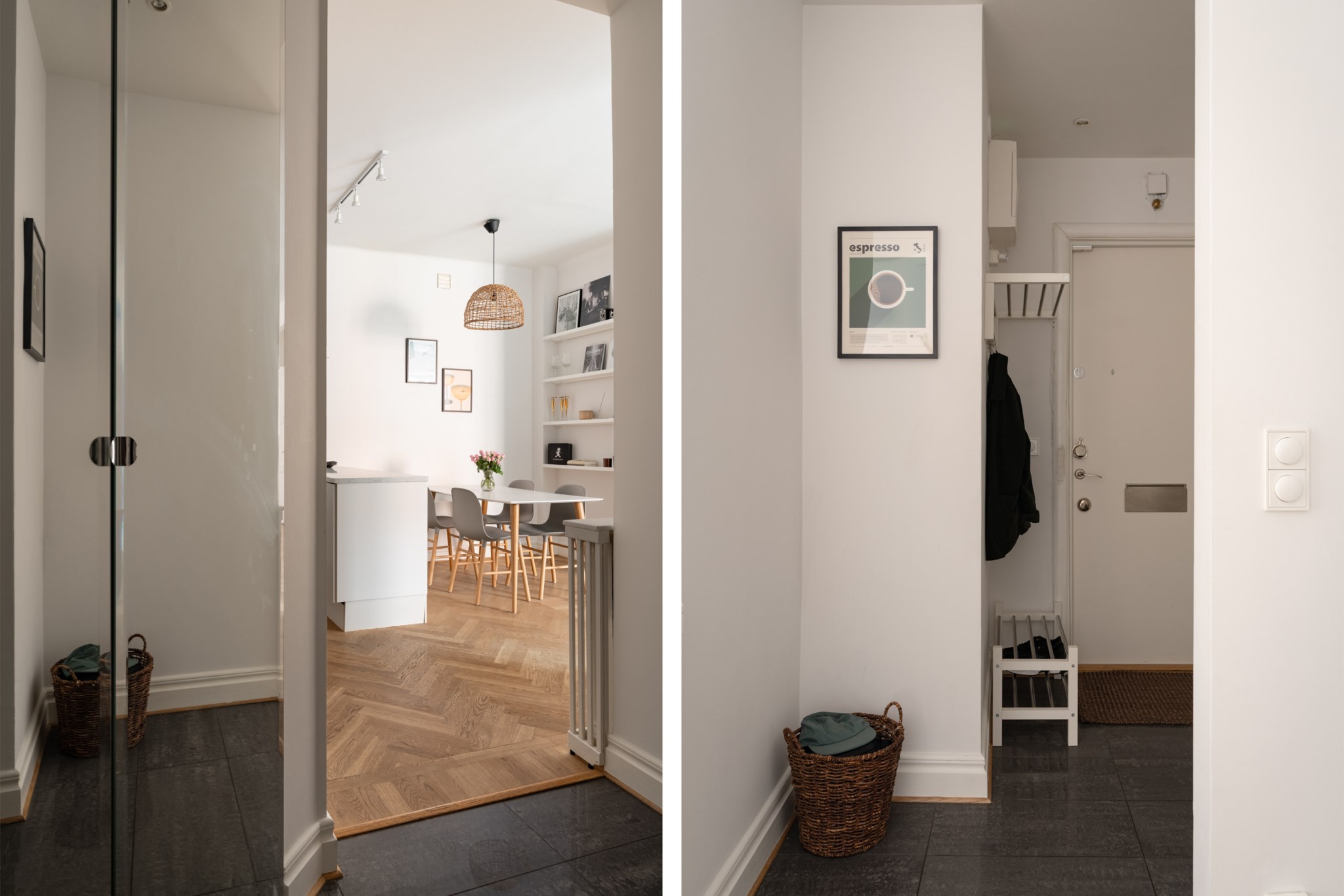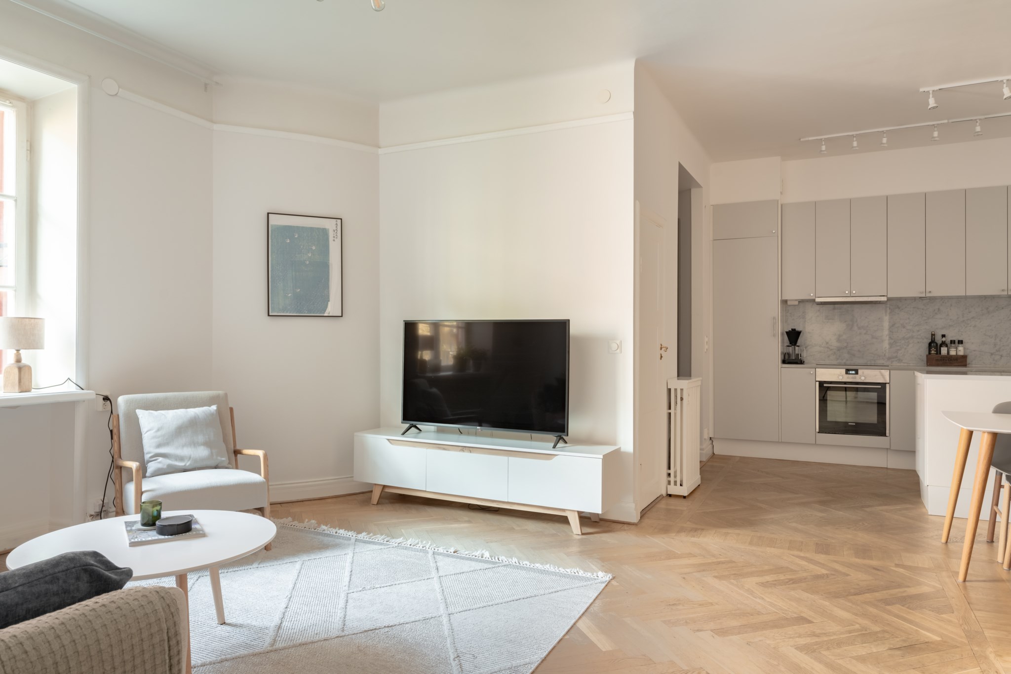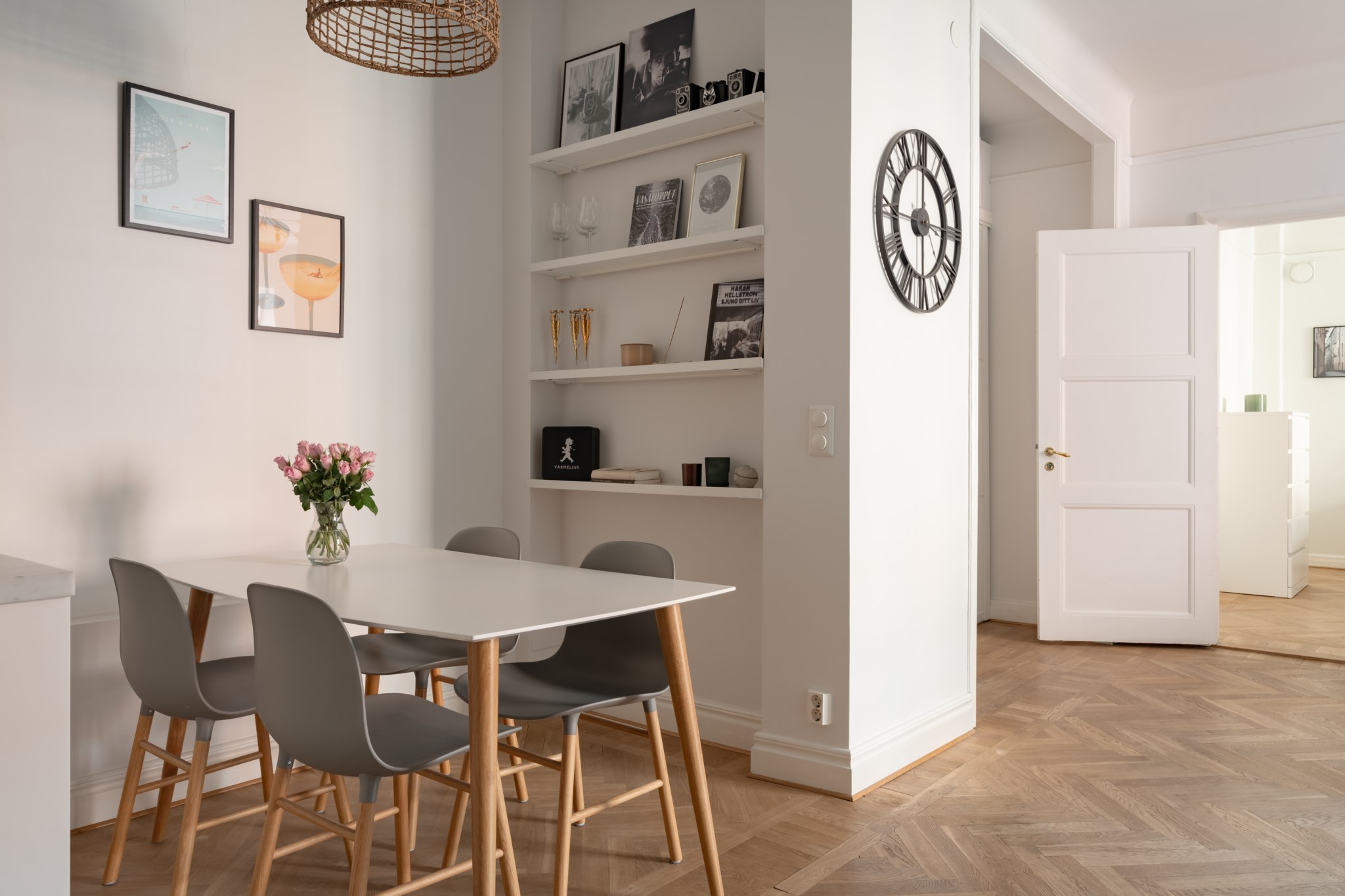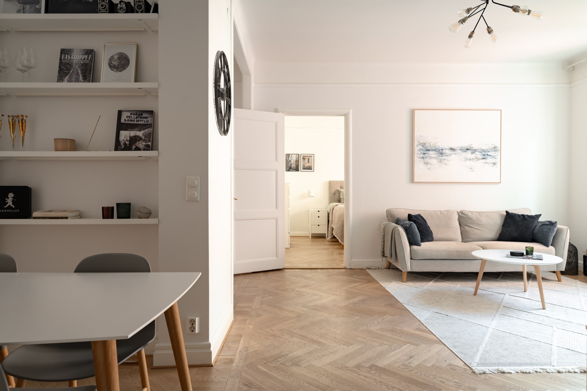 Ljusa väggar och fiskbensparkett.