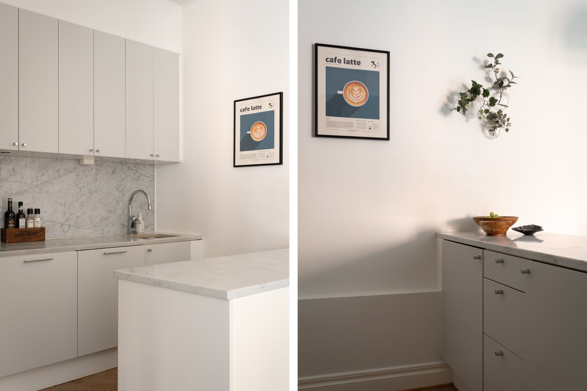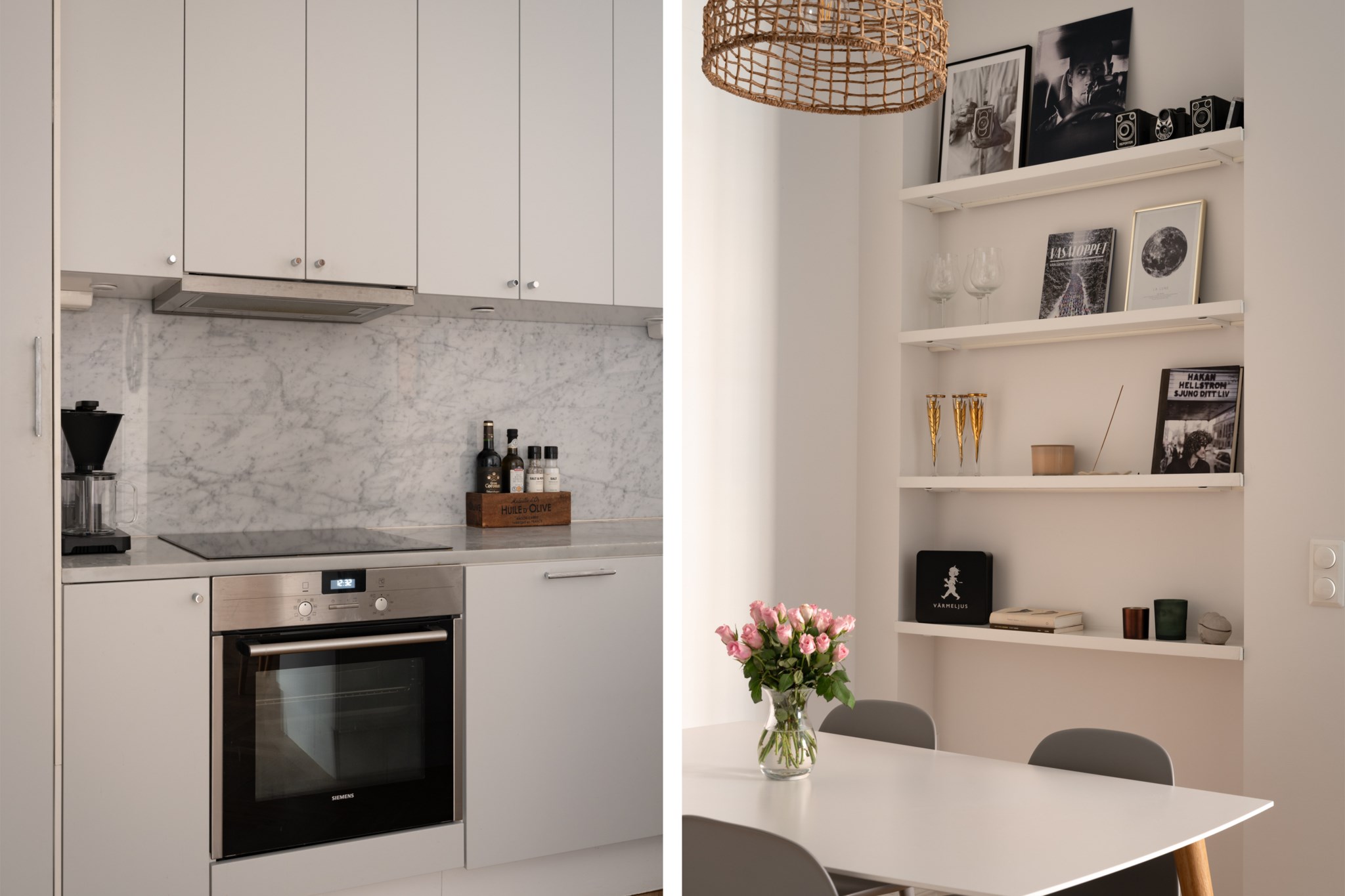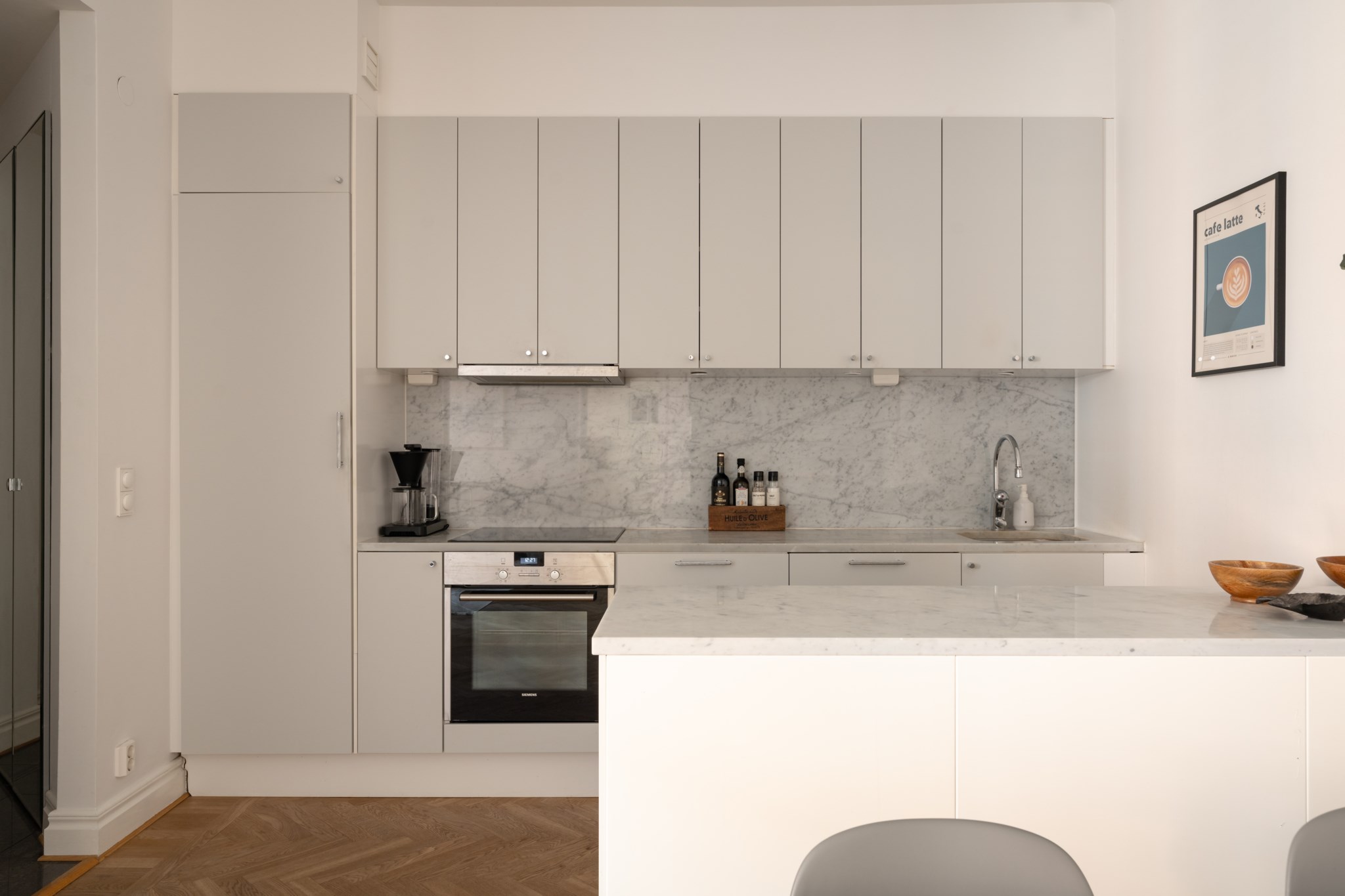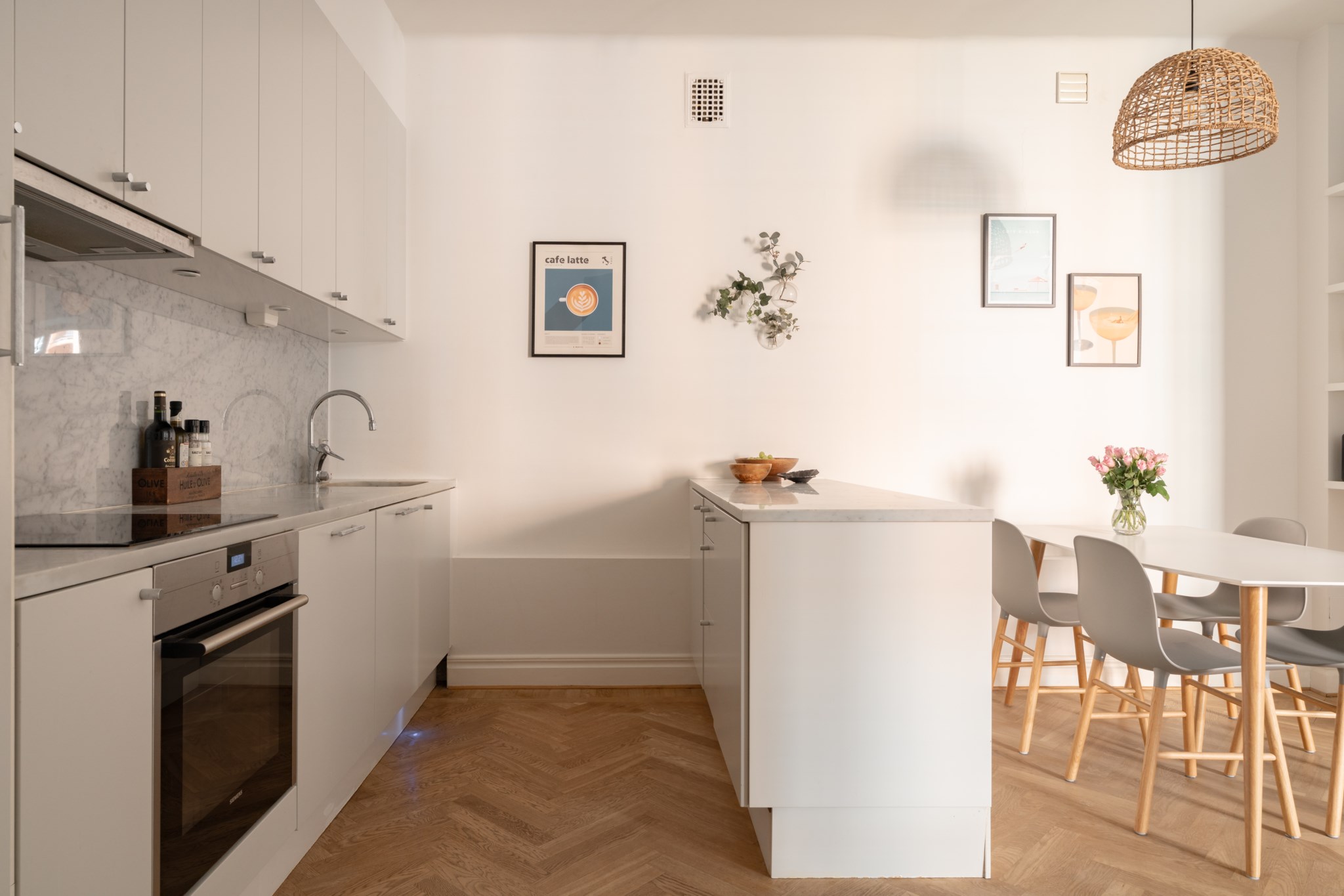 Ljusa väggar och fiskbensparkett.
