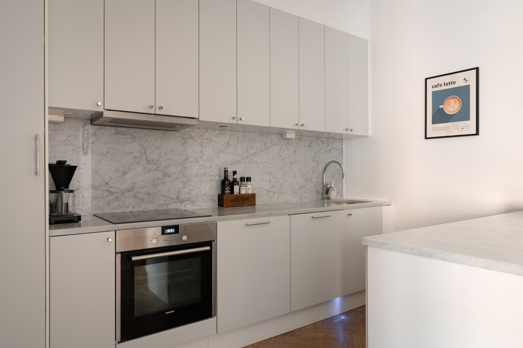 I öppen och social planlösning mot vardagsrummet återfinns bostadens eleganta kök.