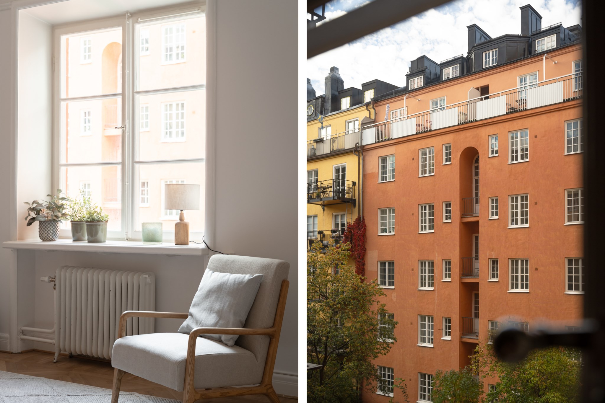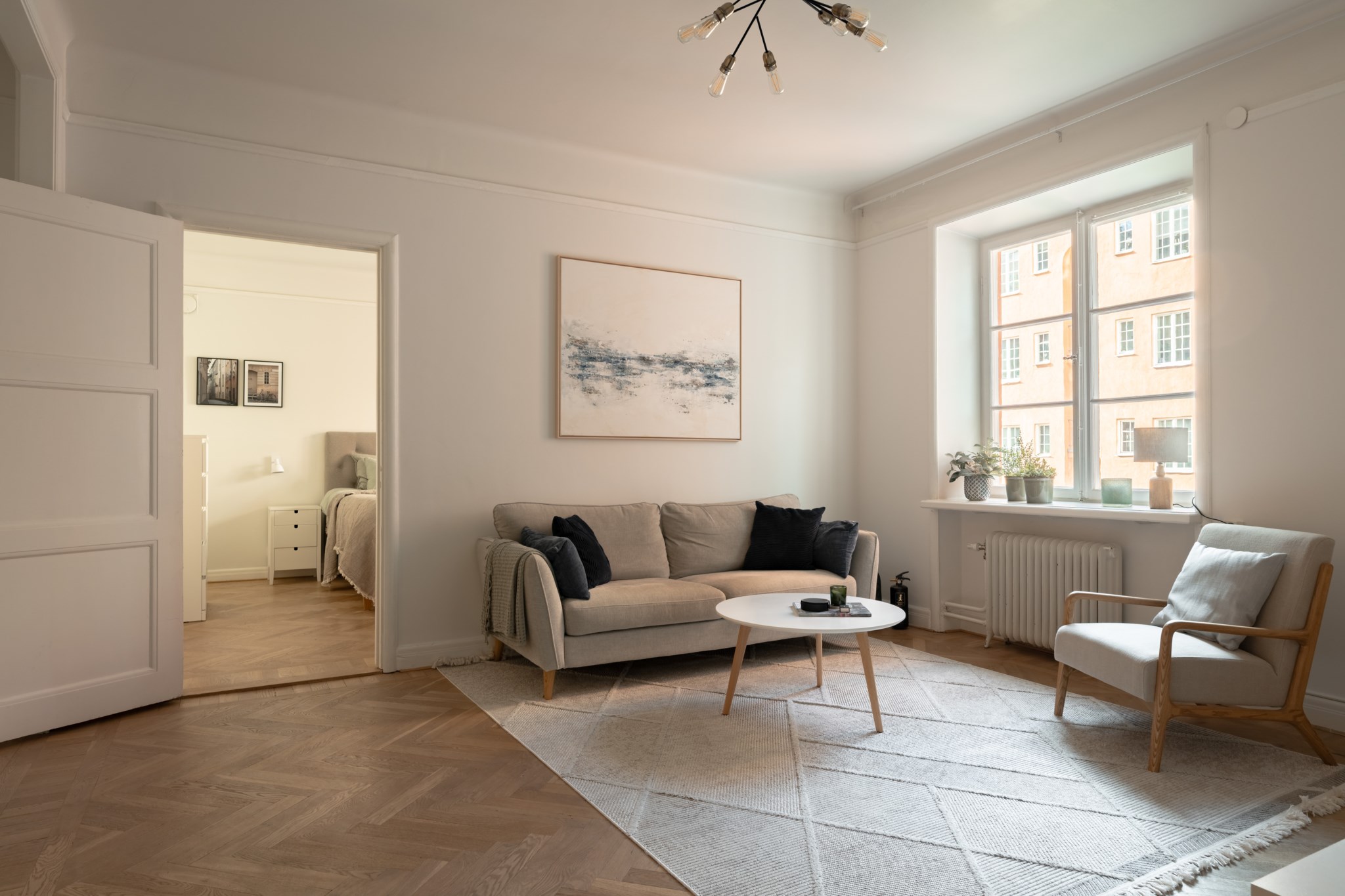 Ljusa väggar och ekparkett.
