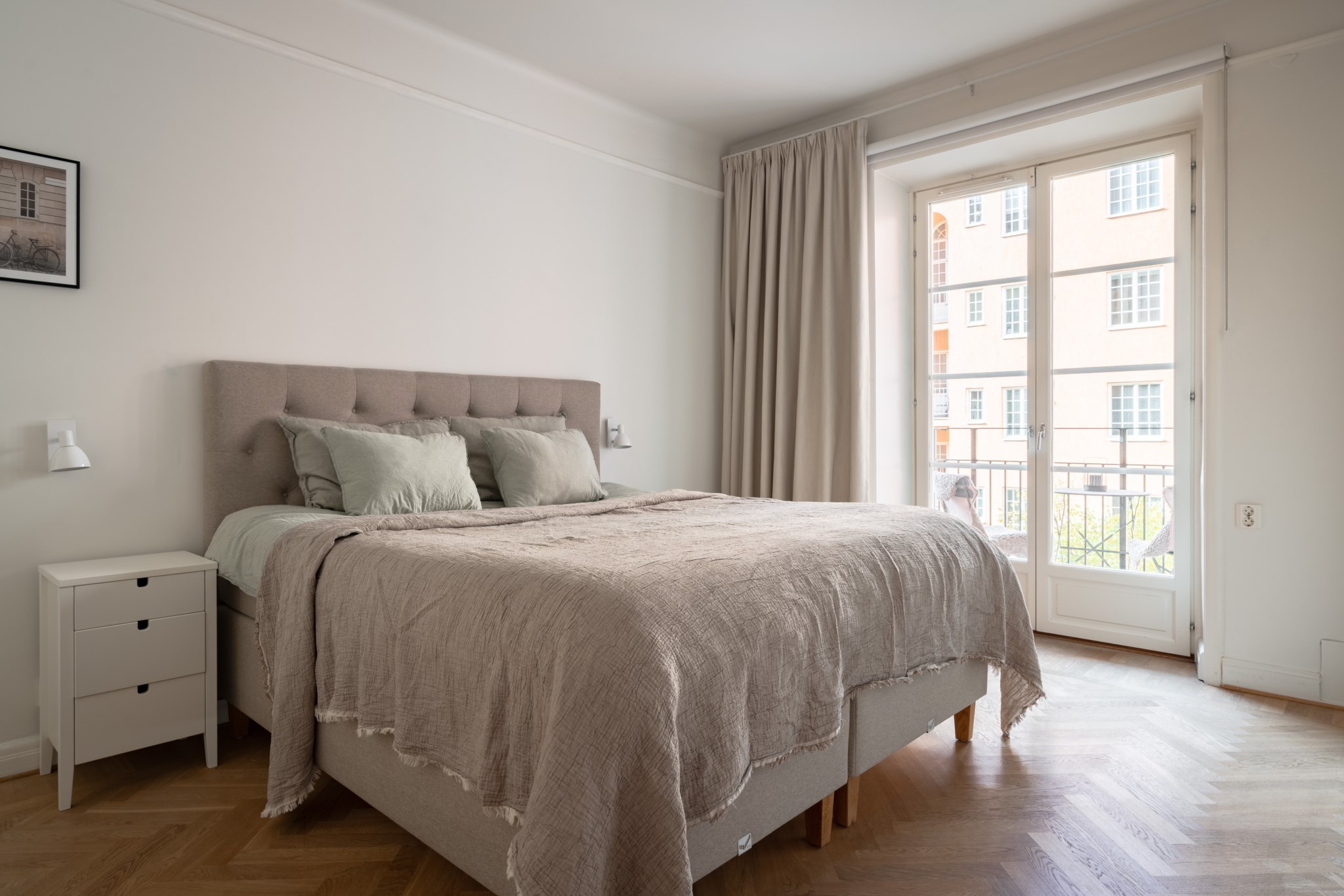 Harmoniskt sovrum med naturligt ljusinsläpp samt access till bostadens härliga balkong. Här finns given plats för sängmöbel och annan önskvärd inredning.