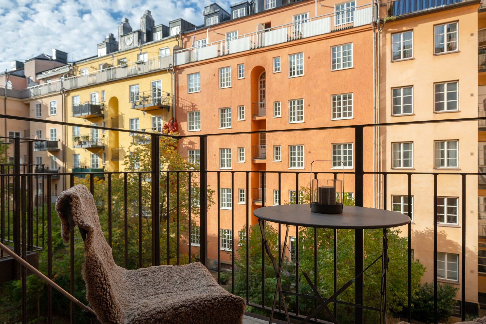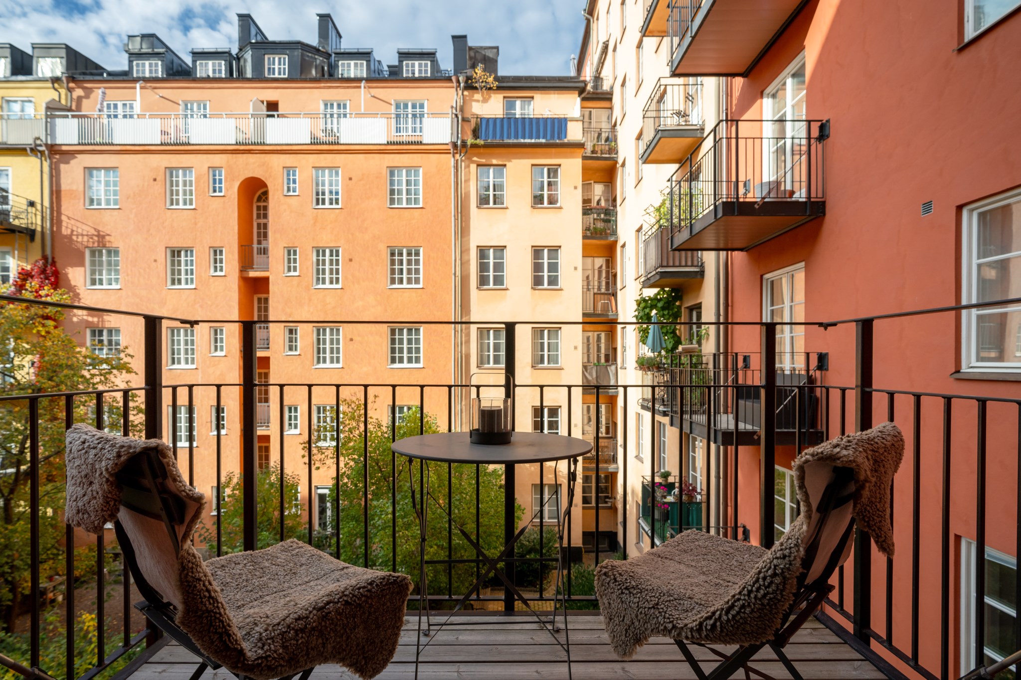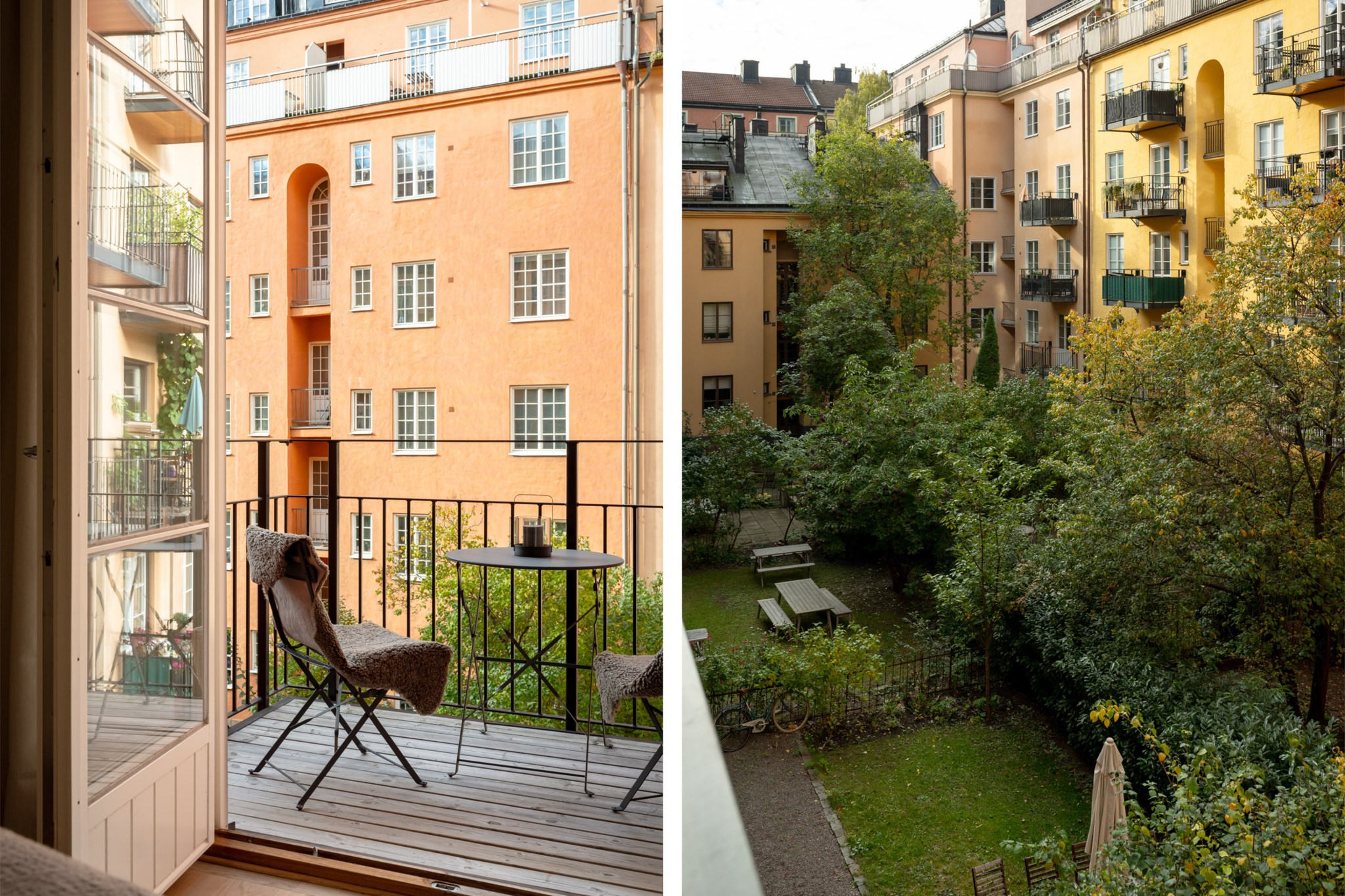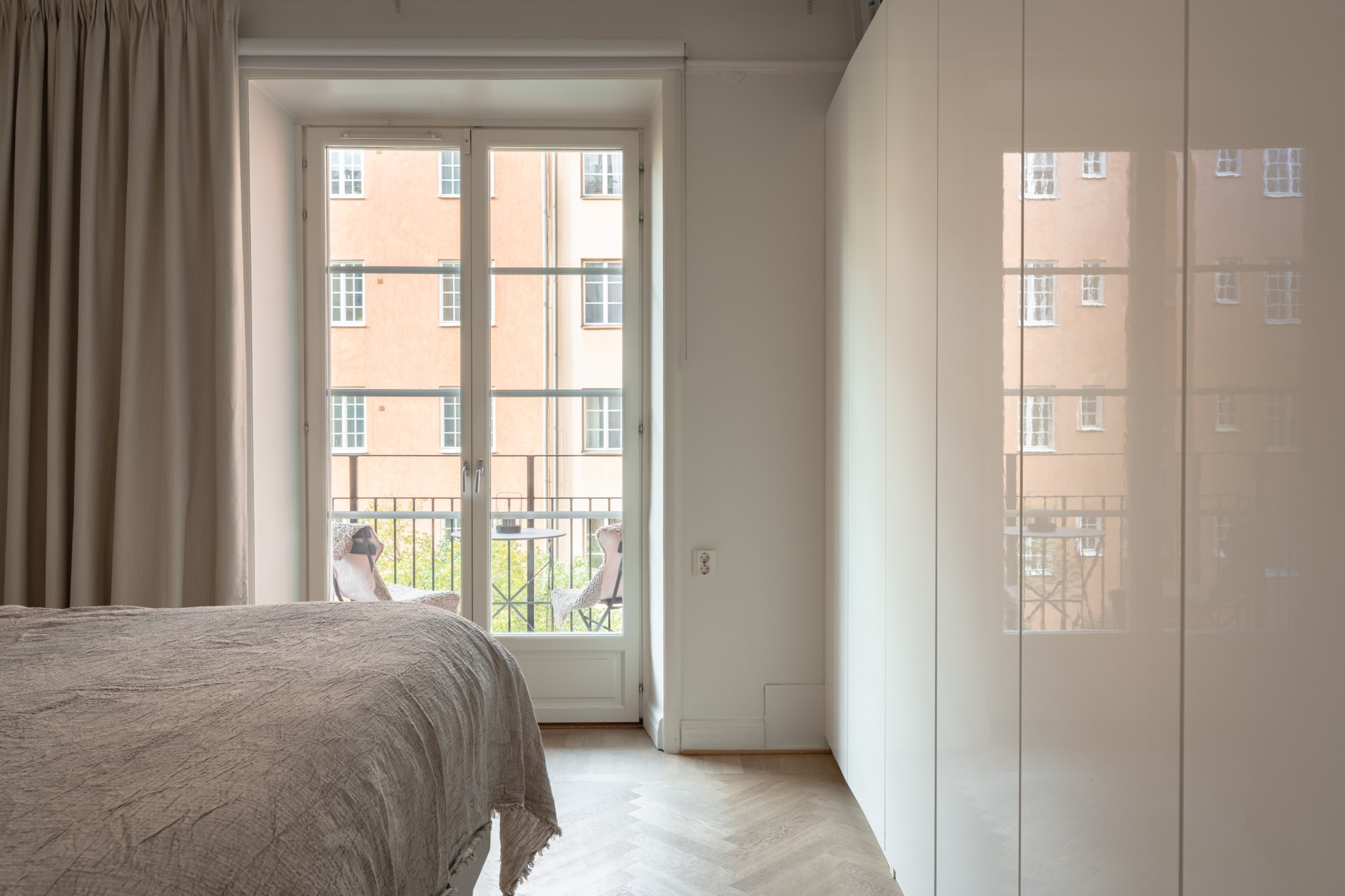 Möjligheten att ställa upp pardörrarna mot balkongen förlänger känslan av rummet och förenar ute med inne under de varmare årstiderna.BALKONG
