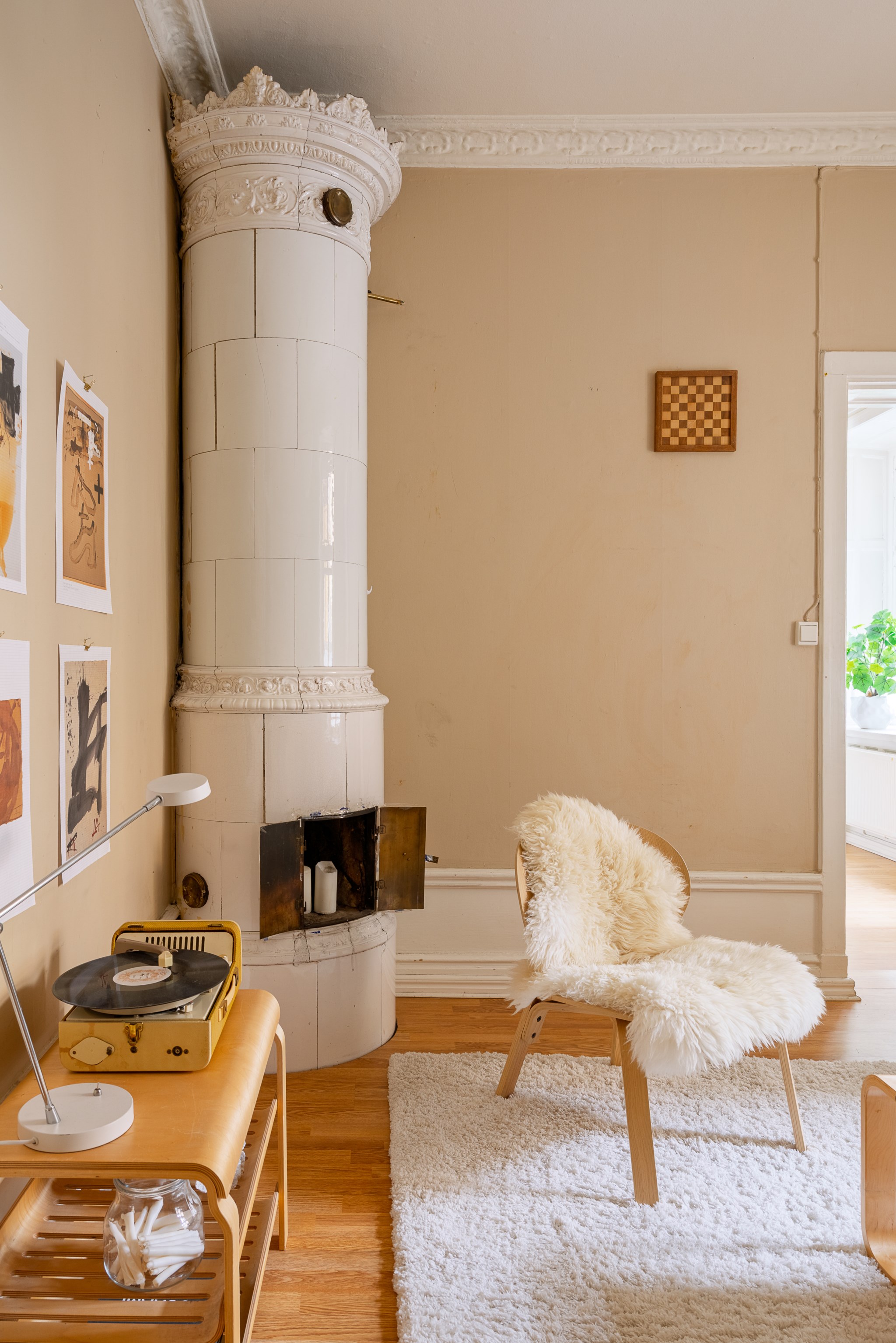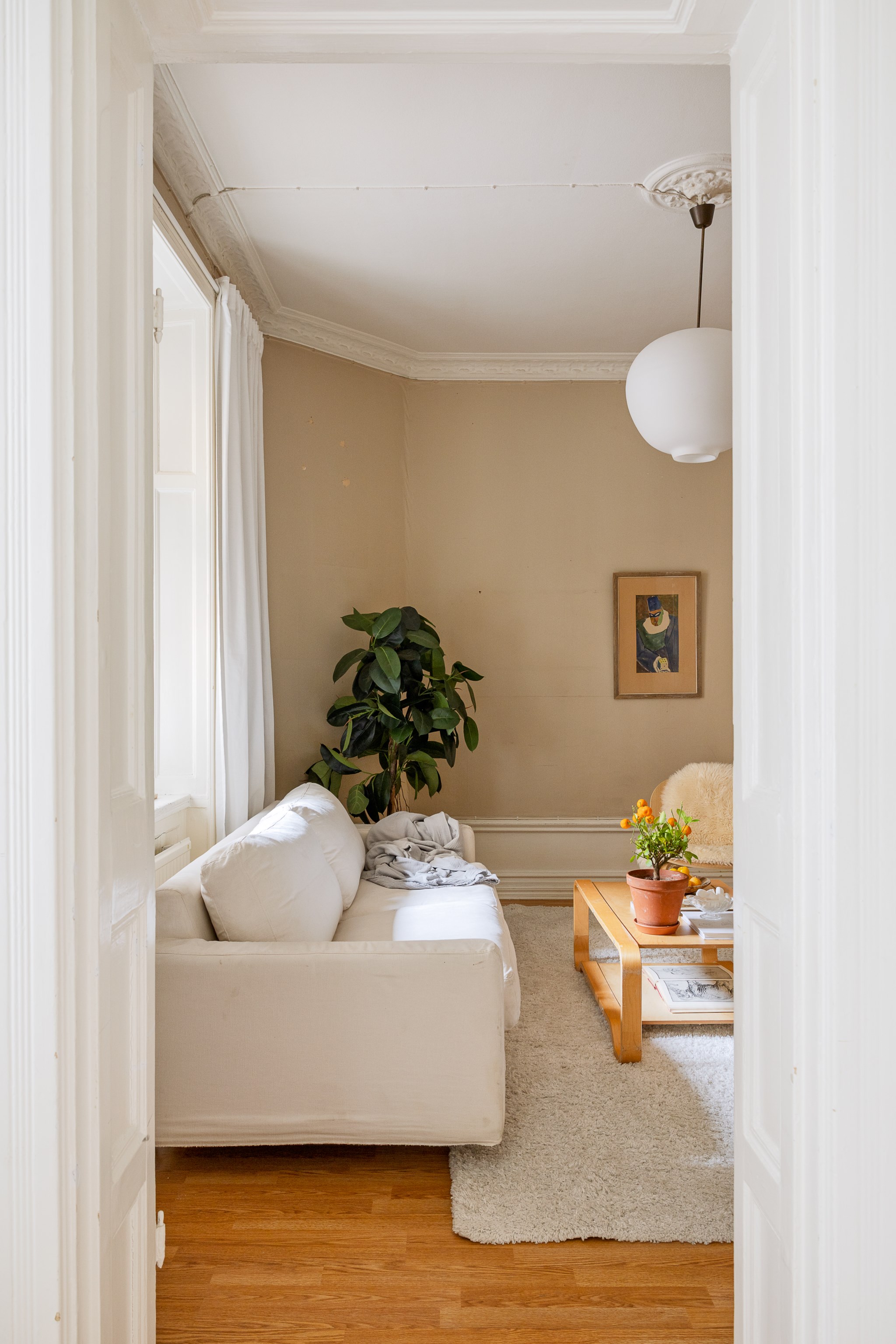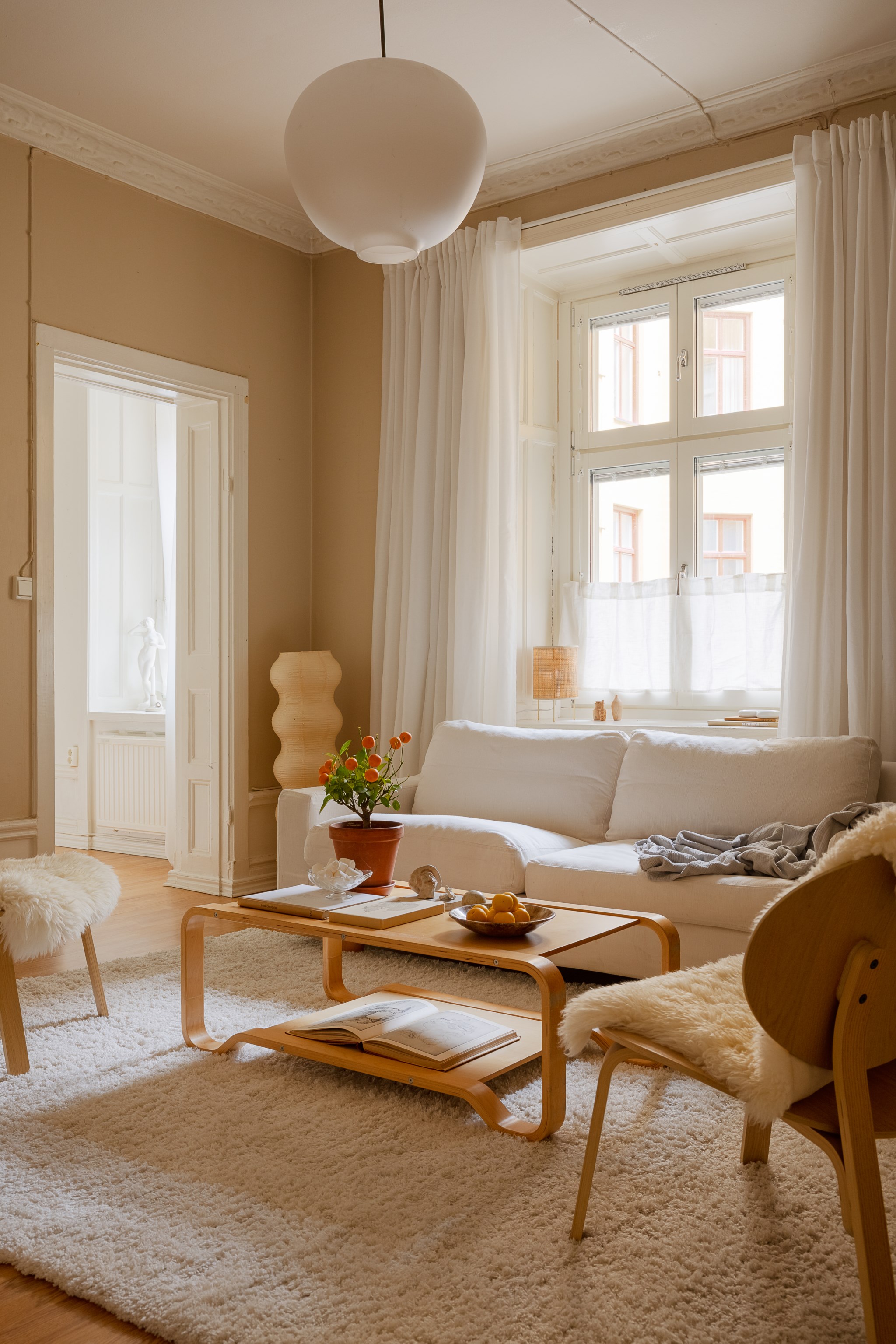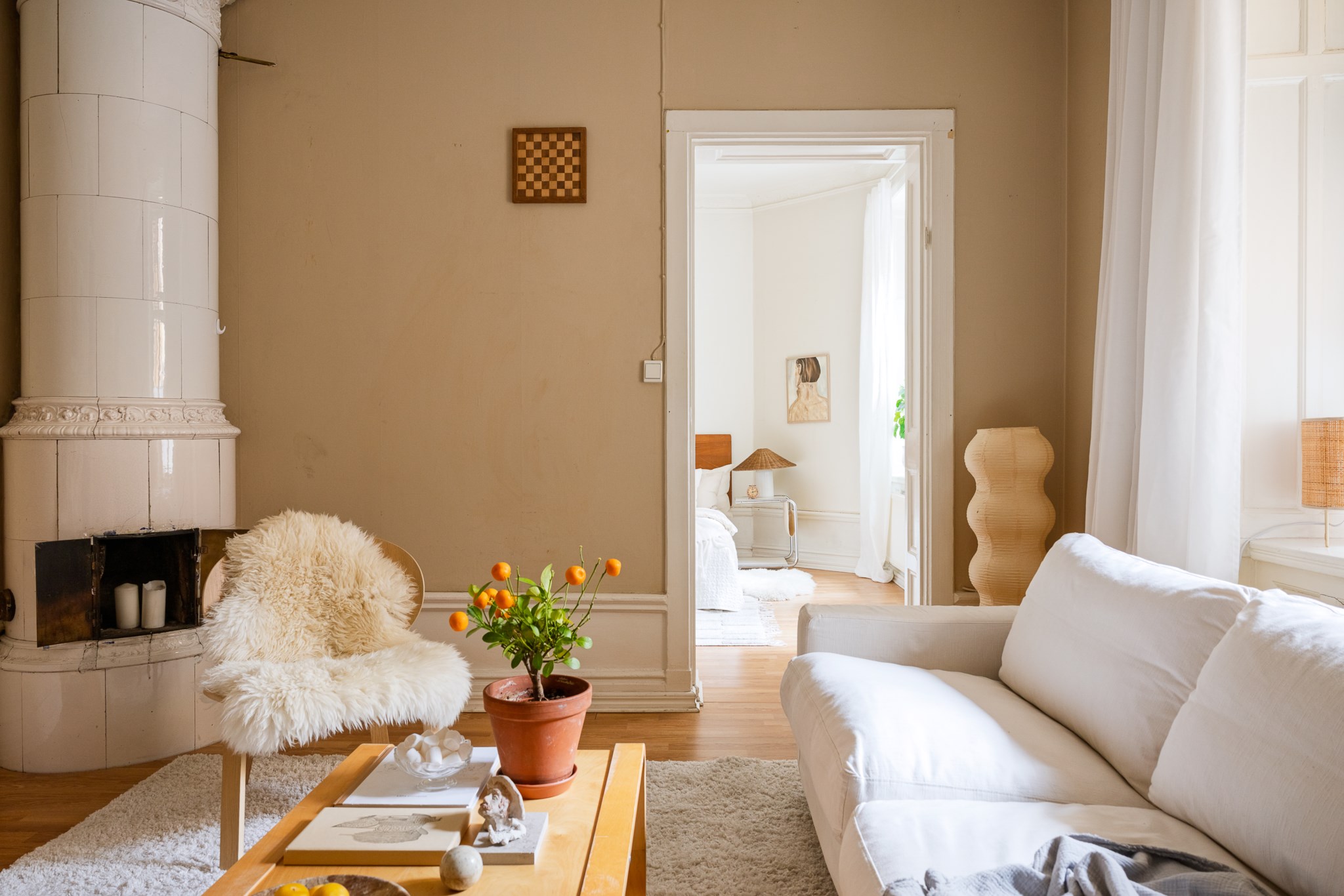 Ljust och harmoniskt vardagsrum med beige väggar, högt i tak och vackra originaldetaljer. En vit kakelugn blir rummets naturliga blickfång och skapar karaktär. Stora fönster med ljusa gardiner släpper in rikligt med dagsljus. Rummet rymmer soffgrupp och sittplatser på mjuk matta, och har en varm, ombonad känsla med trägolv och stilrena möbler.