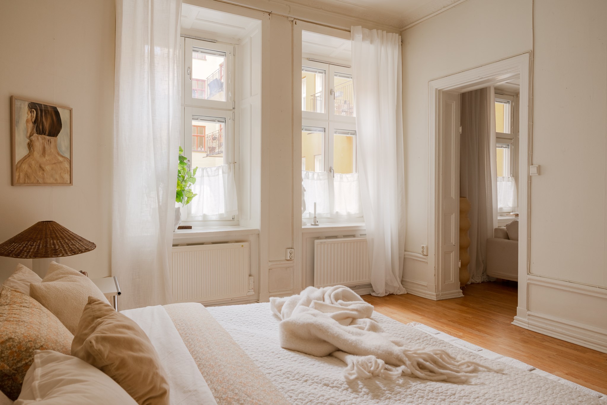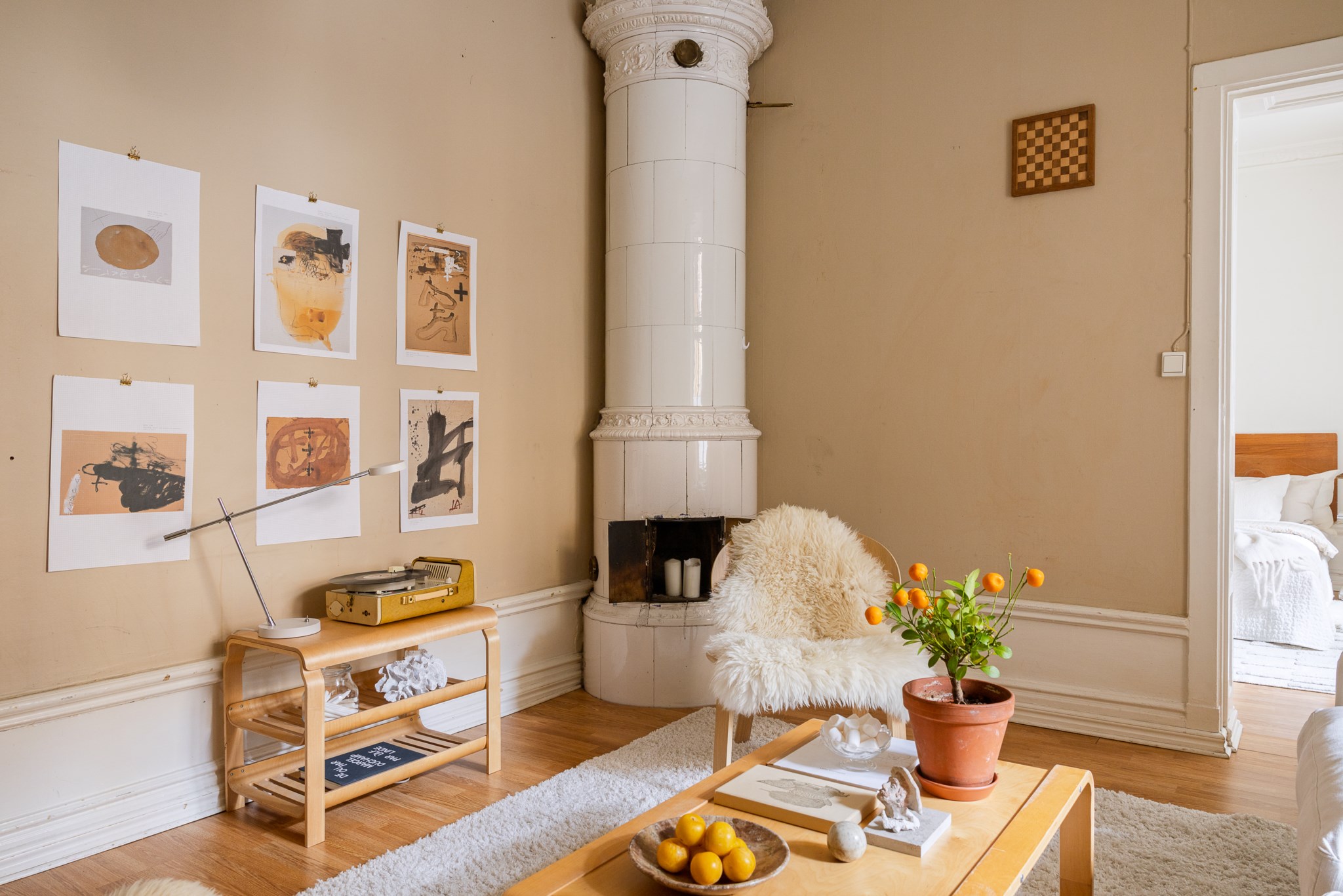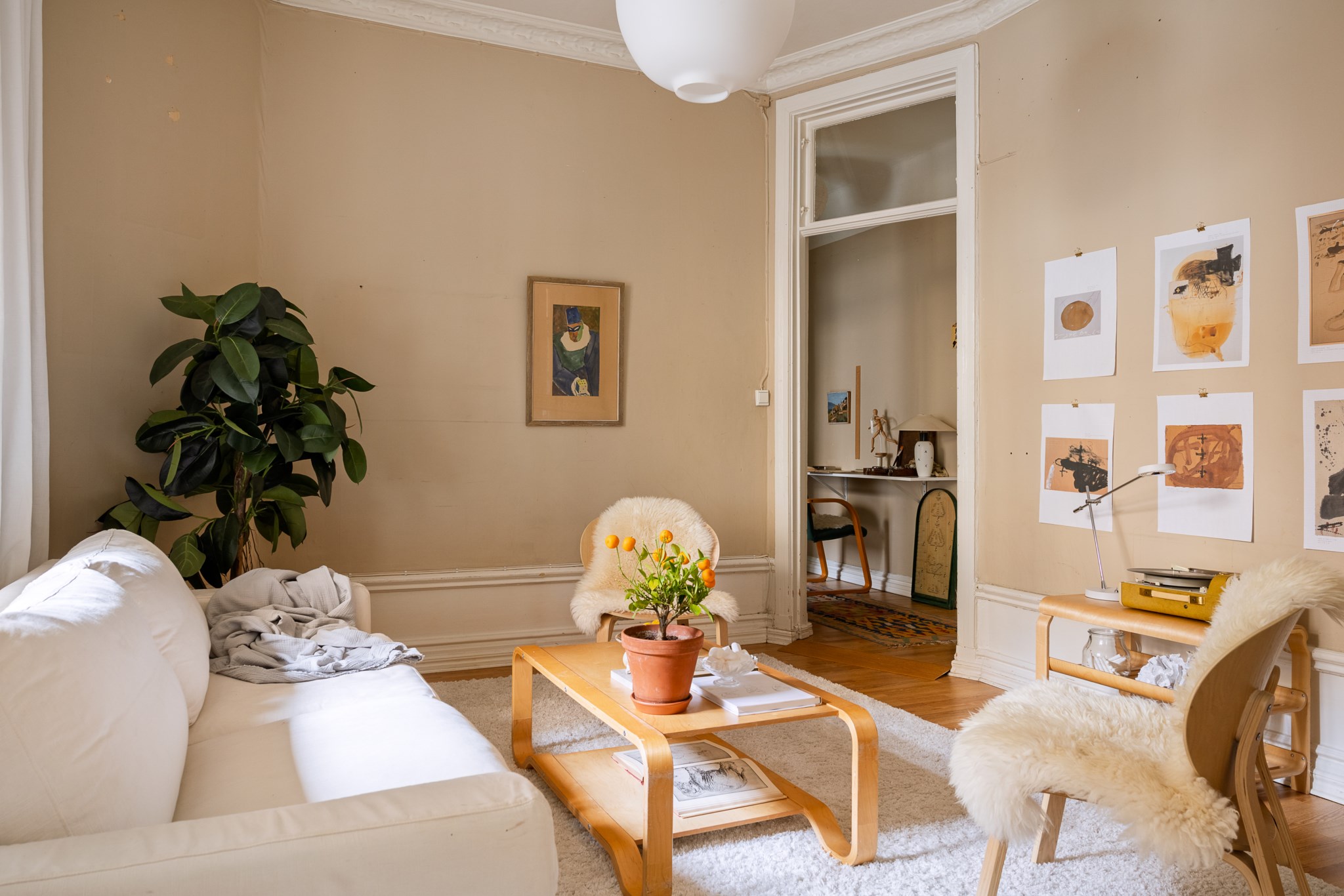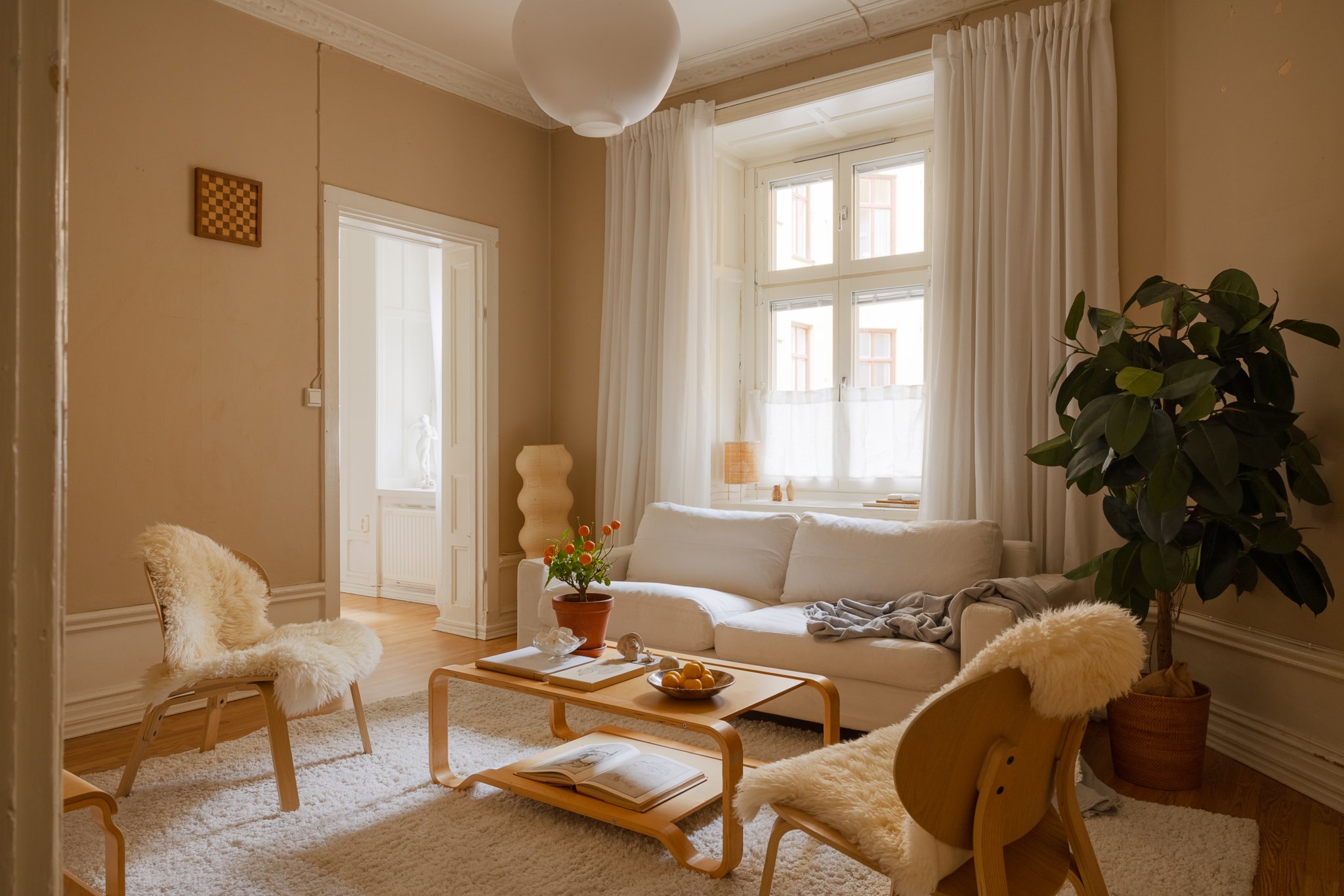 Ljust och harmoniskt vardagsrum med beige väggar, högt i tak och vackra originaldetaljer. En vit kakelugn blir rummets naturliga blickfång och skapar karaktär. Stora fönster med ljusa gardiner släpper in rikligt med dagsljus. Rummet rymmer soffgrupp och sittplatser på mjuk matta, och har en varm, ombonad känsla med trägolv och stilrena möbler.