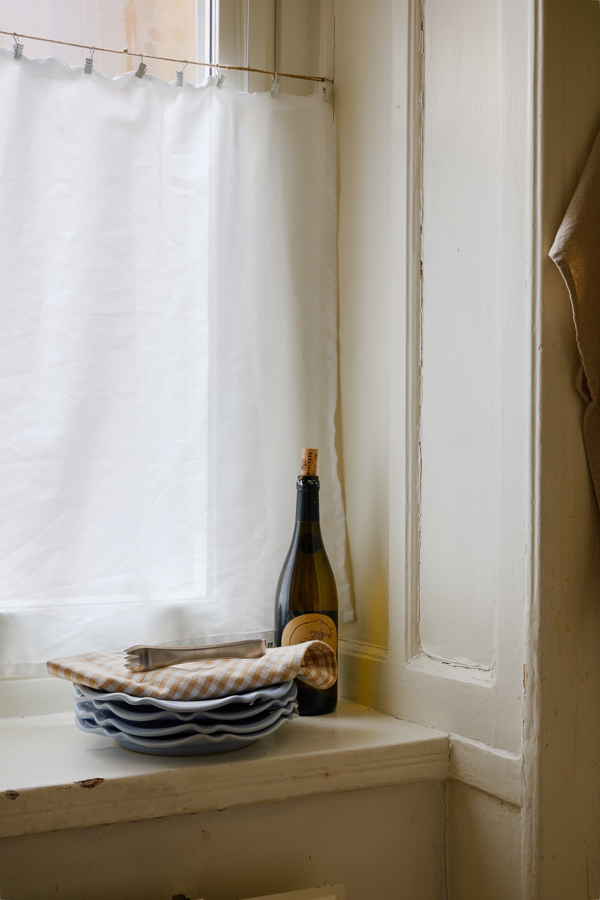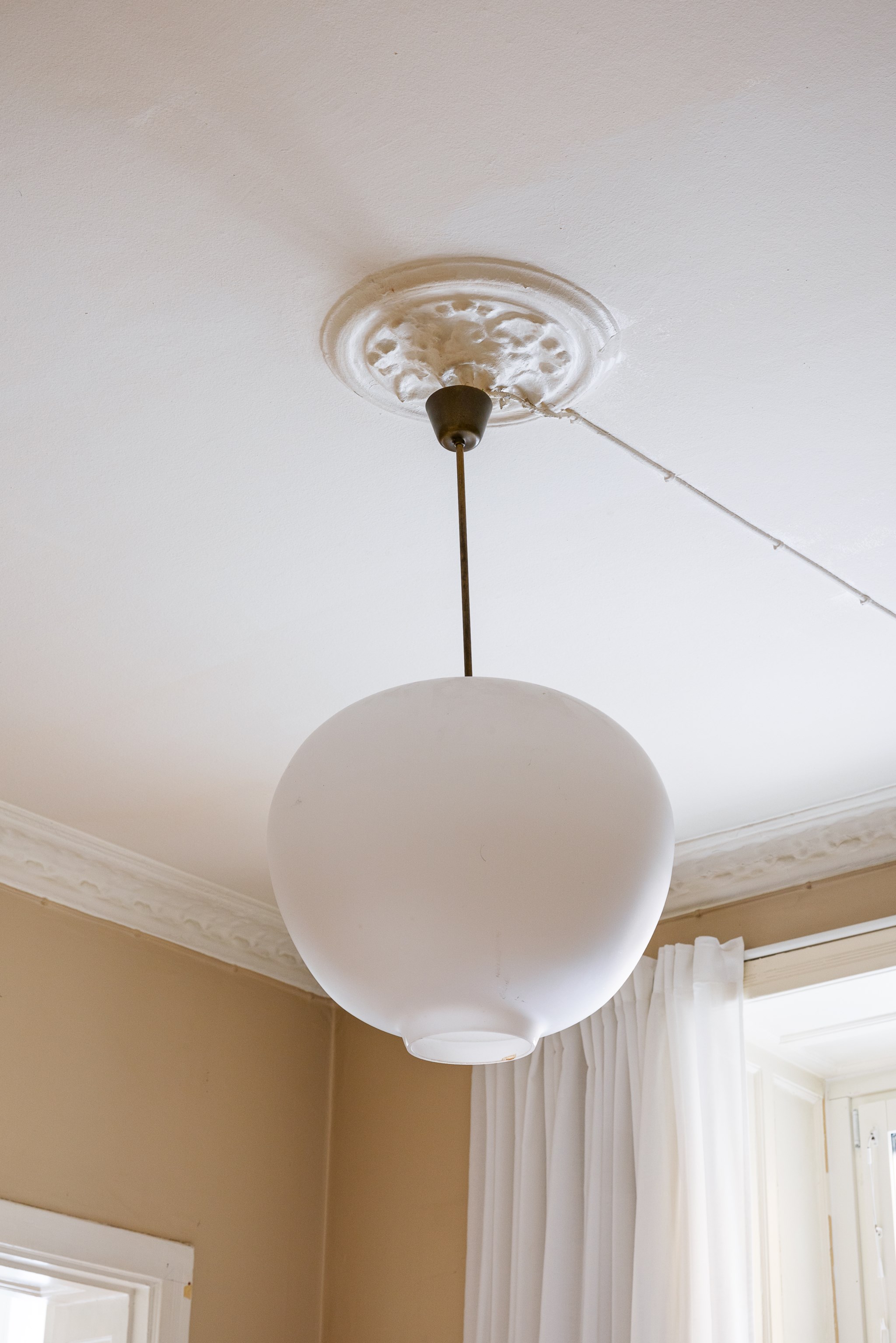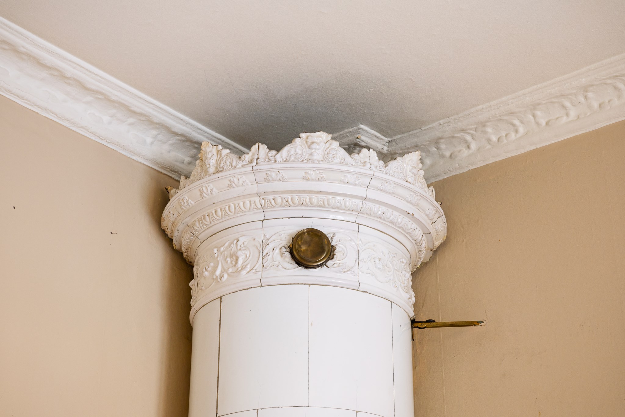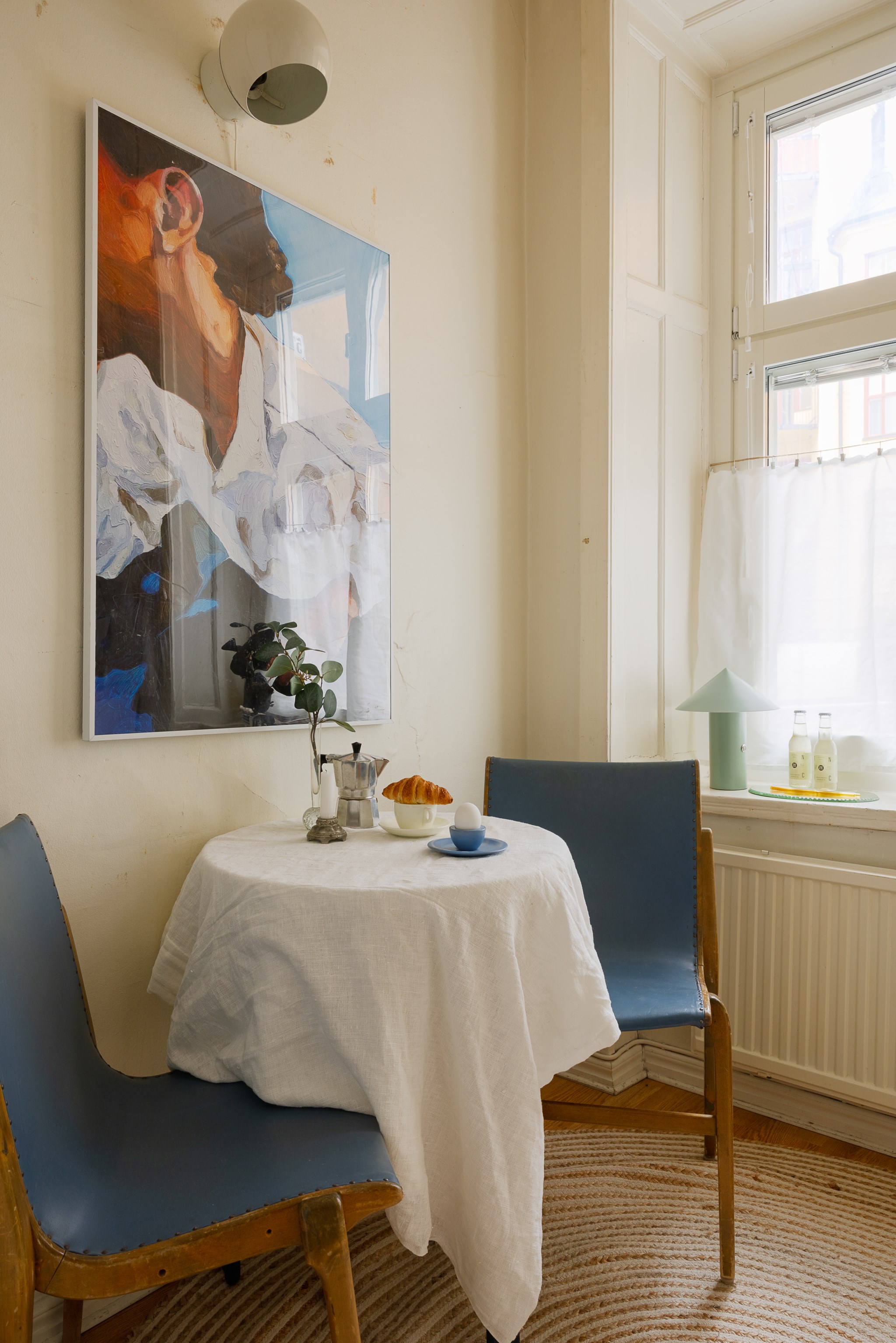 Ljust och harmoniskt vardagsrum med beige väggar, högt i tak och vackra originaldetaljer. En vit kakelugn blir rummets naturliga blickfång och skapar karaktär. Stora fönster med ljusa gardiner släpper in rikligt med dagsljus. Rummet rymmer soffgrupp och sittplatser på mjuk matta, och har en varm, ombonad känsla med trägolv och stilrena möbler.