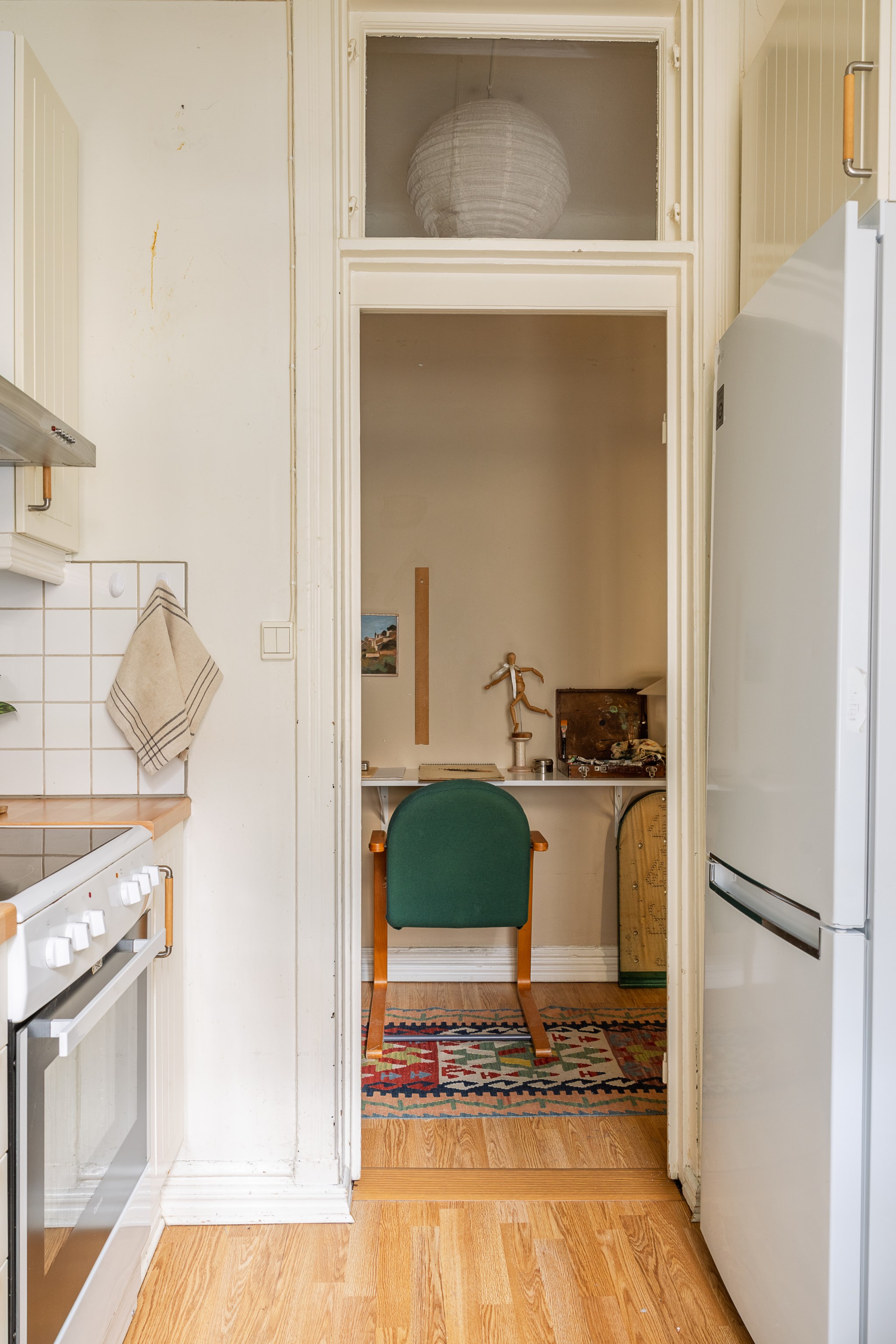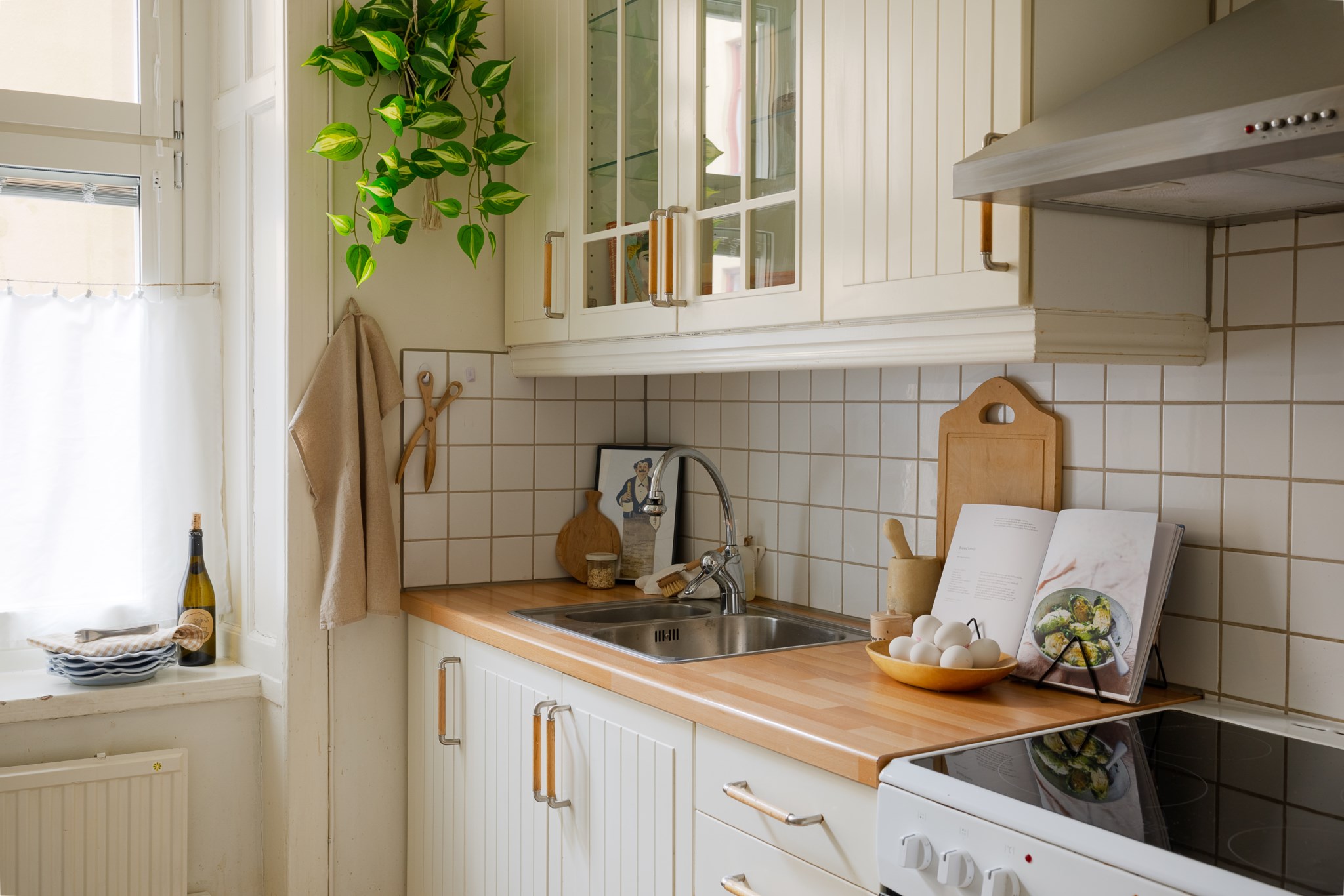 Ljust och trivsamt kök med vita skåpluckor, träbänkskiva och kaklat stänkskydd. Köket är utrustat med spis med ugn, fläkt, diskho med blandare samt fullstor kyl och frys. Gott om förvaring finns i över- och underskåp, varav flera med glasluckor.
