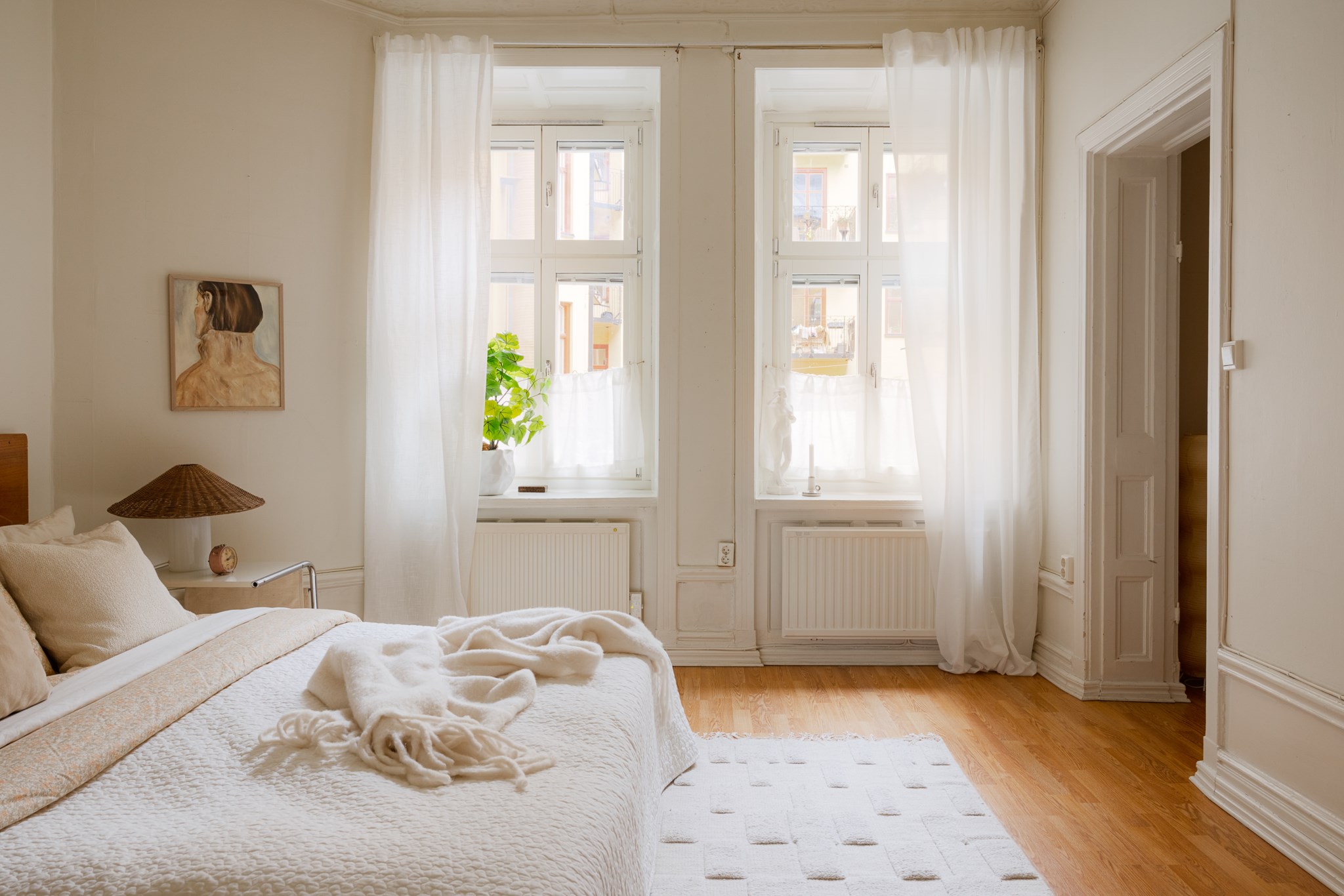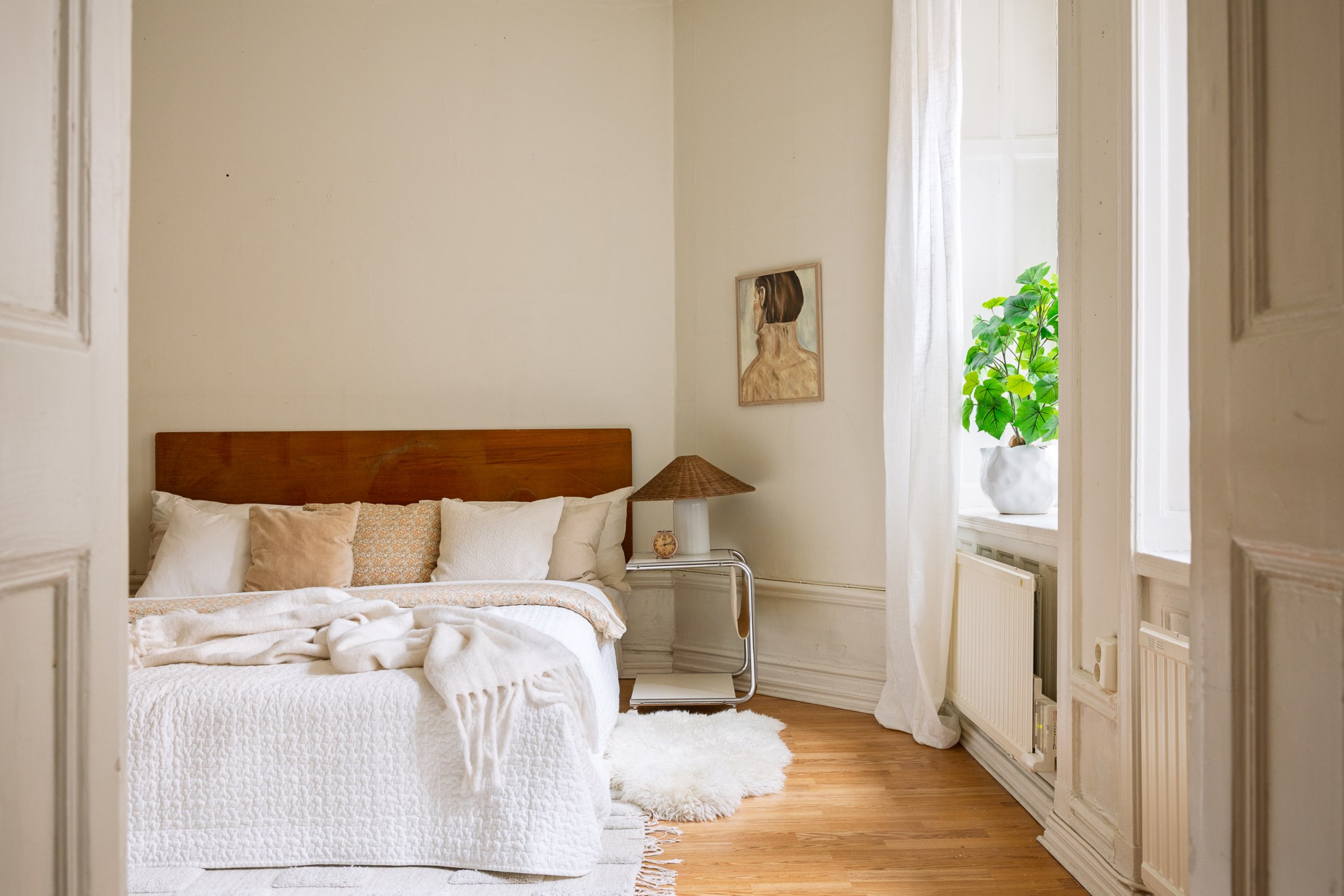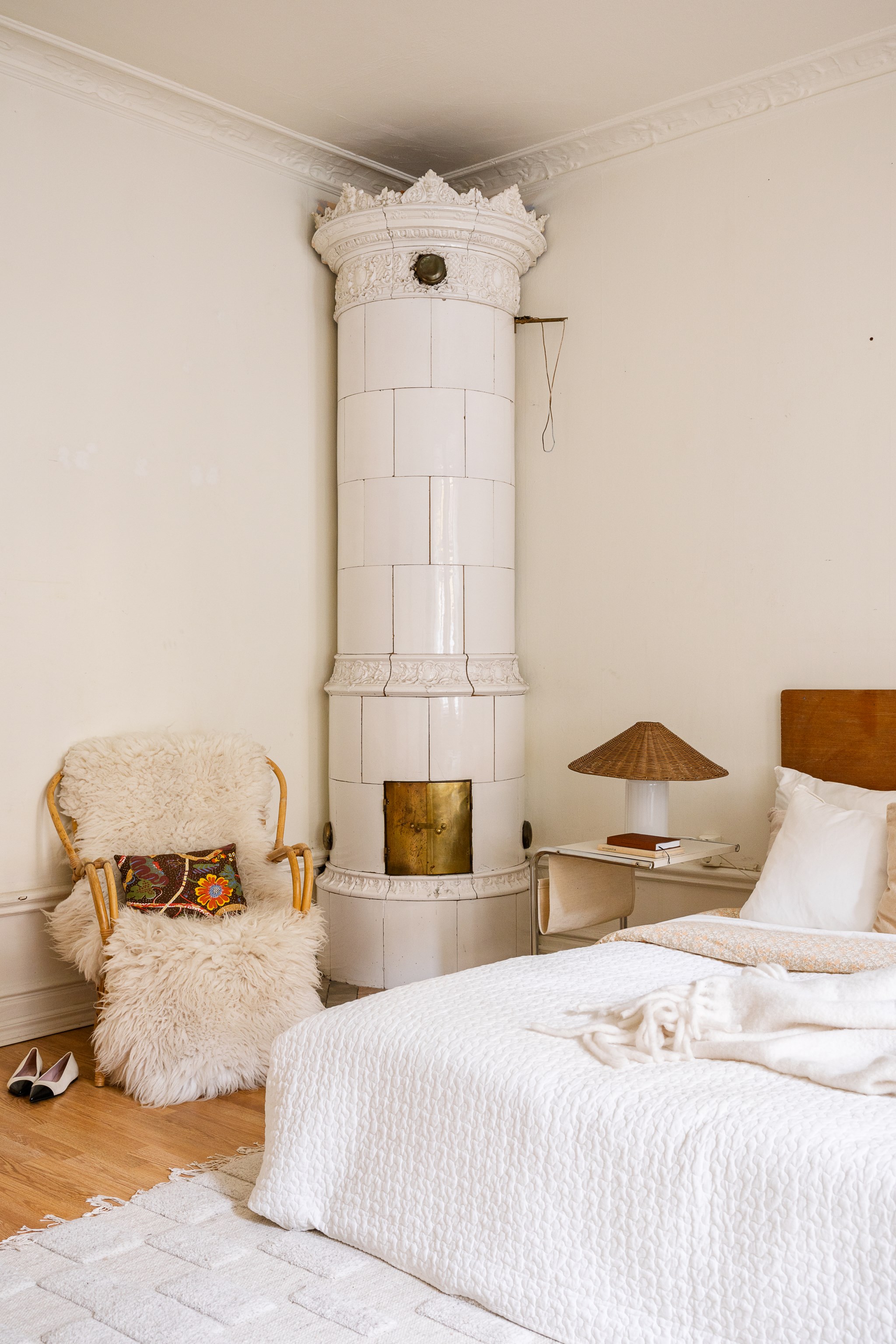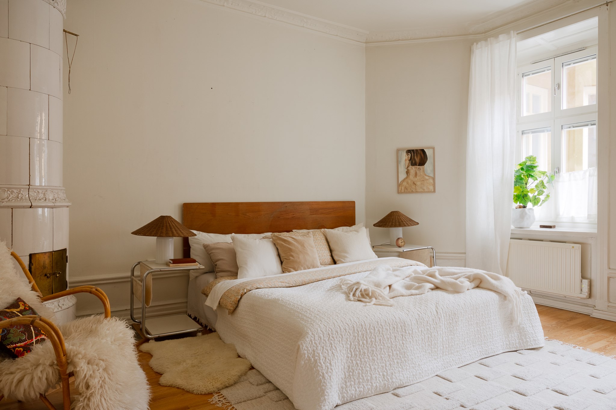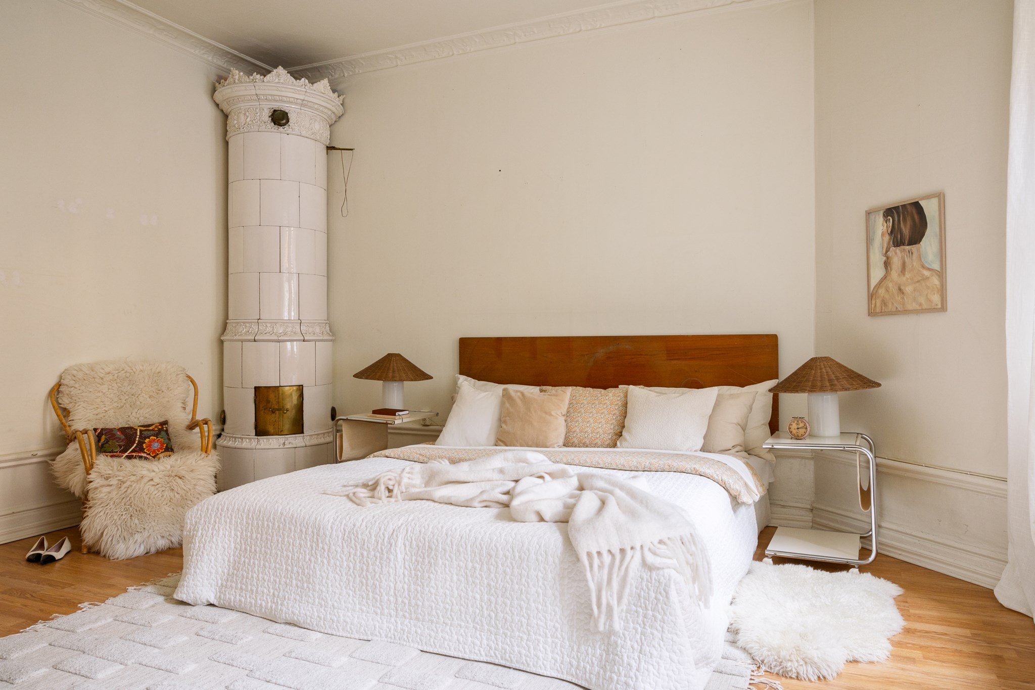 Generöst sovrum med lugn och harmonisk atmosfär. Rummet präglas av vackra snickerier, högt i tak och en ståtlig kakelugn som ger unik karaktär. Här finns gott om plats för dubbelsäng med tillhörande sängbord samt en mindre sittplats. De stora fönsterpartierna ger rummet en luftig känsla och bidrar till en behaglig rymd. Ett rofyllt rum med klassisk charm och varm helhet.