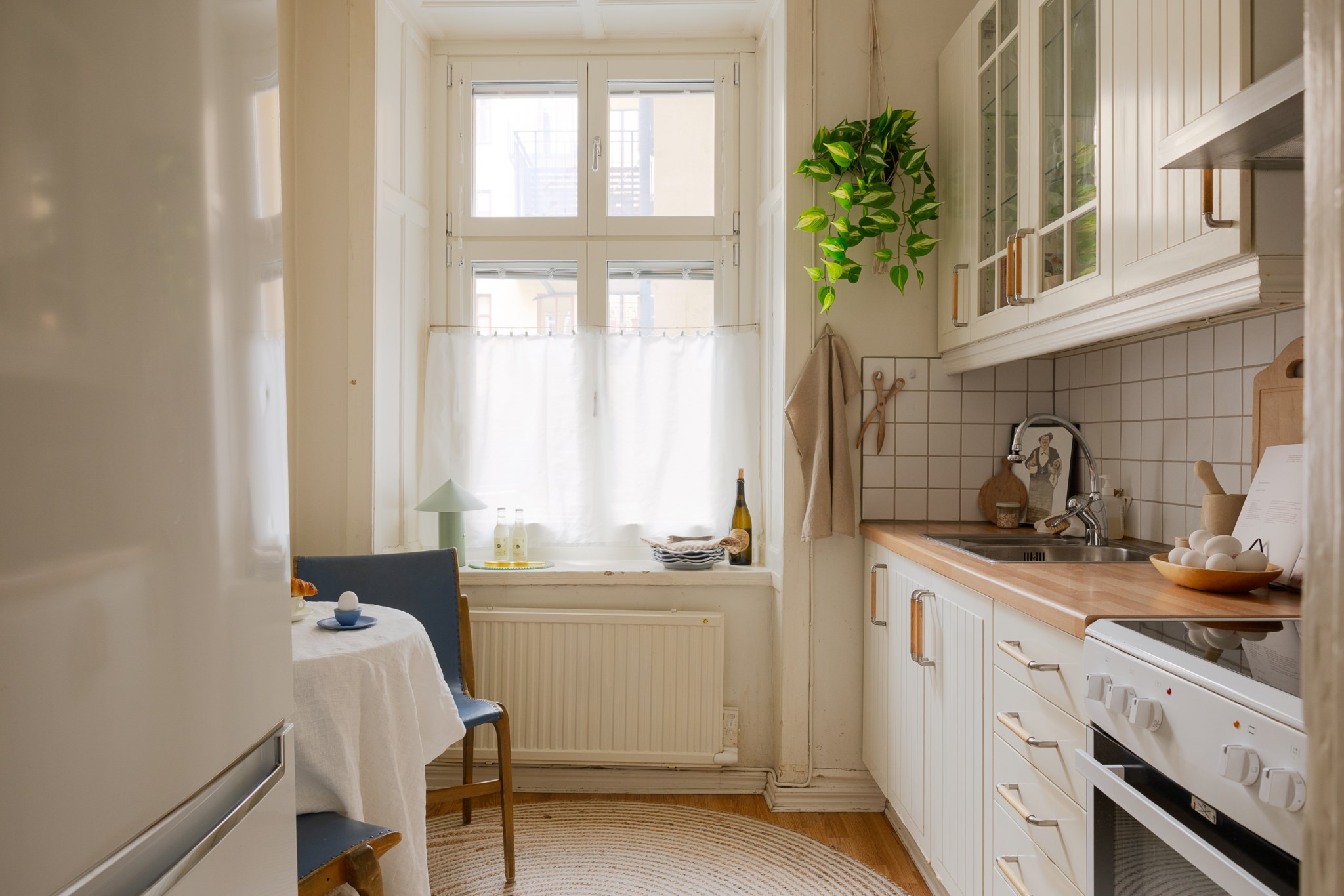 Vid fönstret finns en matplats för två personer. Köket har även arbetsbelysning, öppna avställningsytor och plats för mindre köksutrustning. Ett funktionellt och hemtrevligt kök med bra ljusinsläpp.