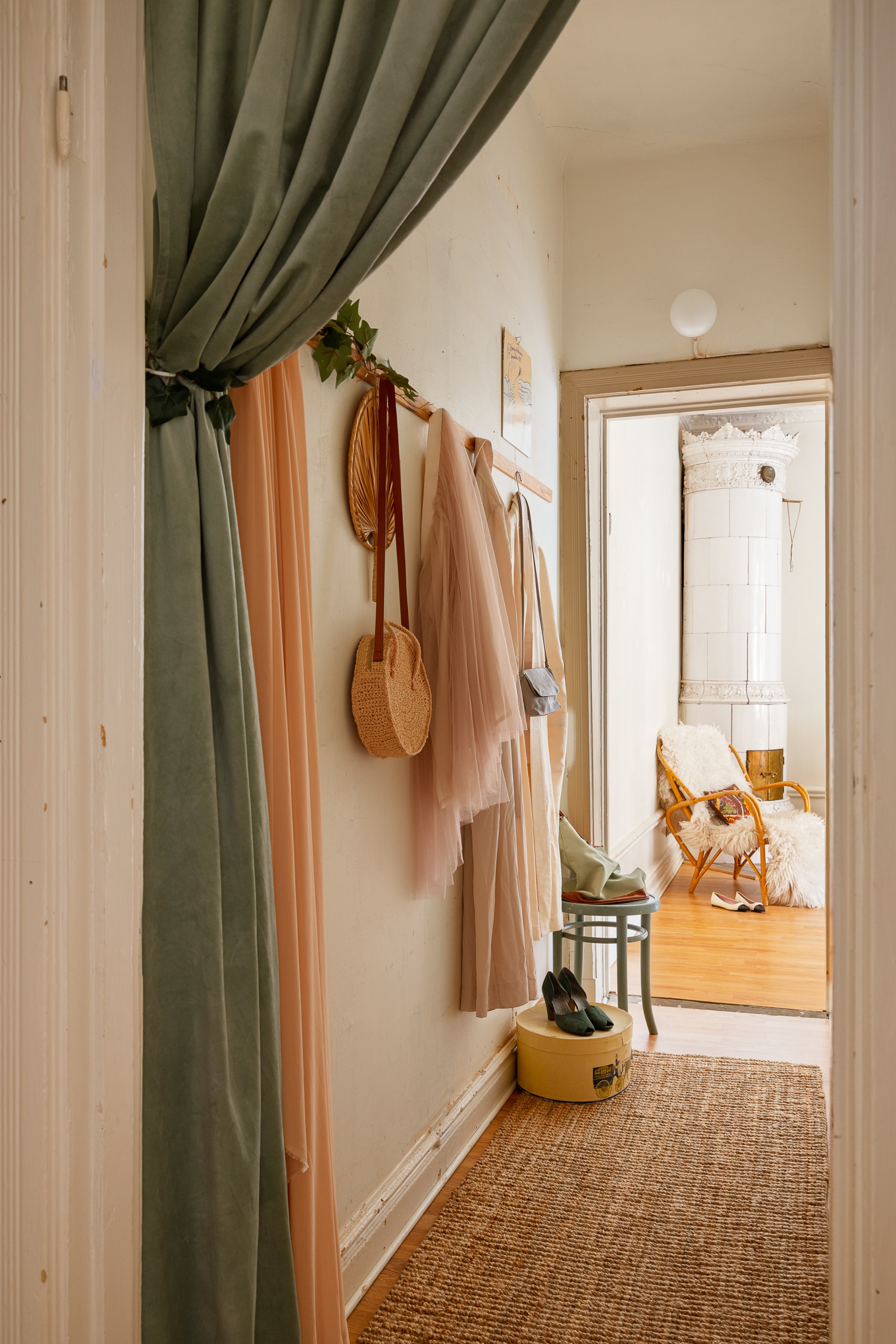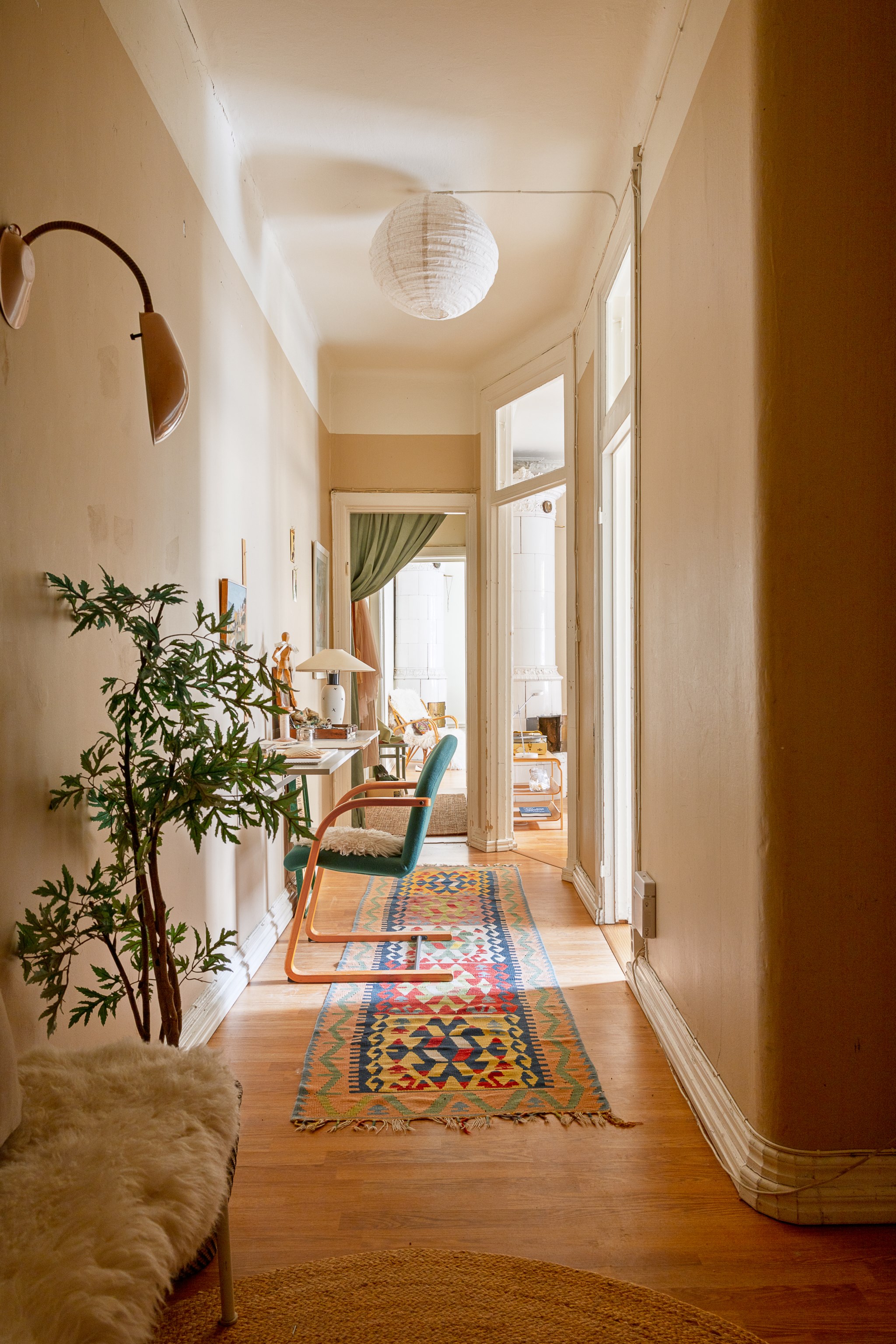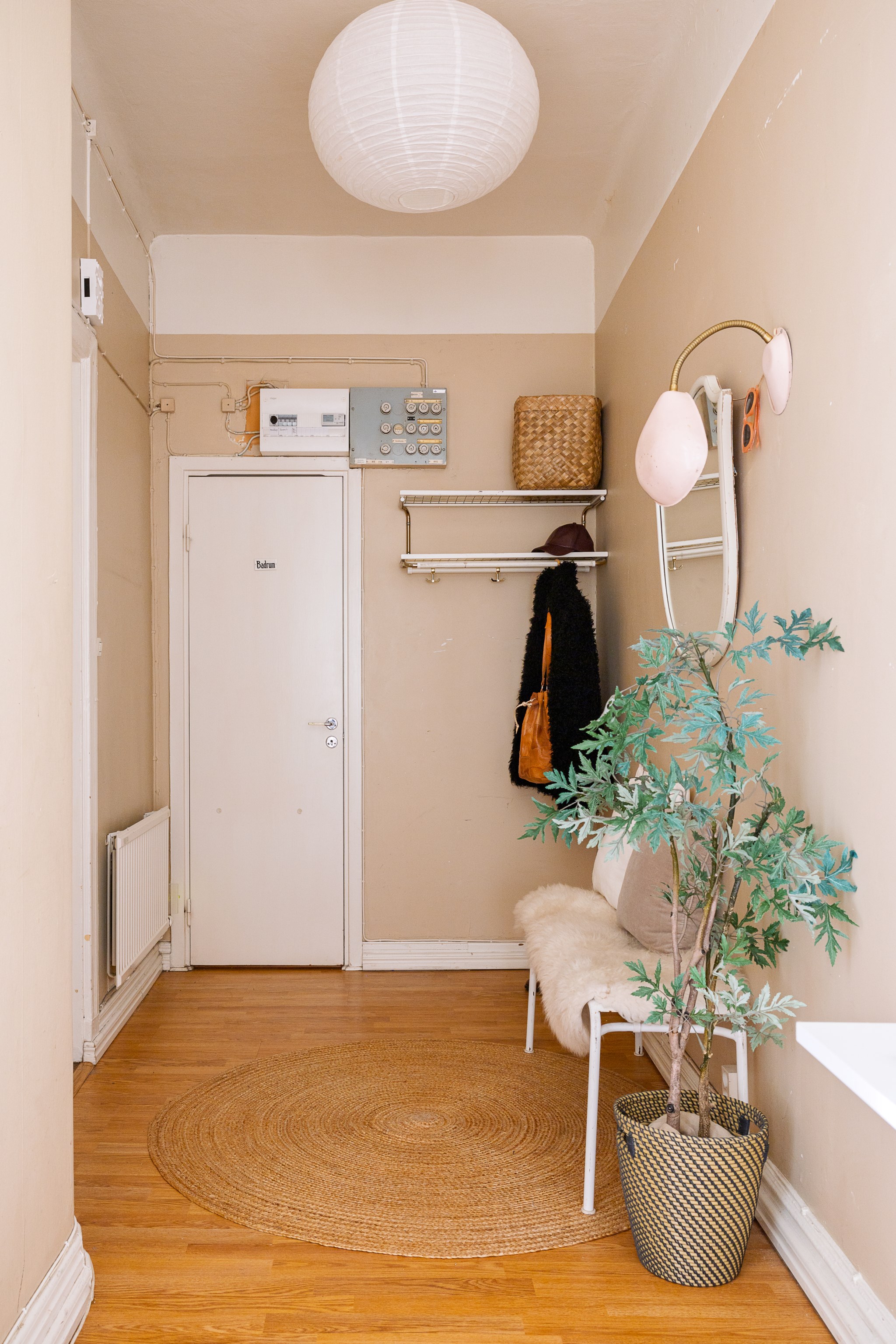 Ljus och inbjudande hall med beige väggar och ljust trägolv. Här finns praktisk förvaring i form av hatthylla och krokar samt en sittbänk med mjukt fårskinn. En rund matta och en mönstrad gångmatta skapar värme, medan växter och små tavlor ger rummet en personlig och hemtrevlig känsla.