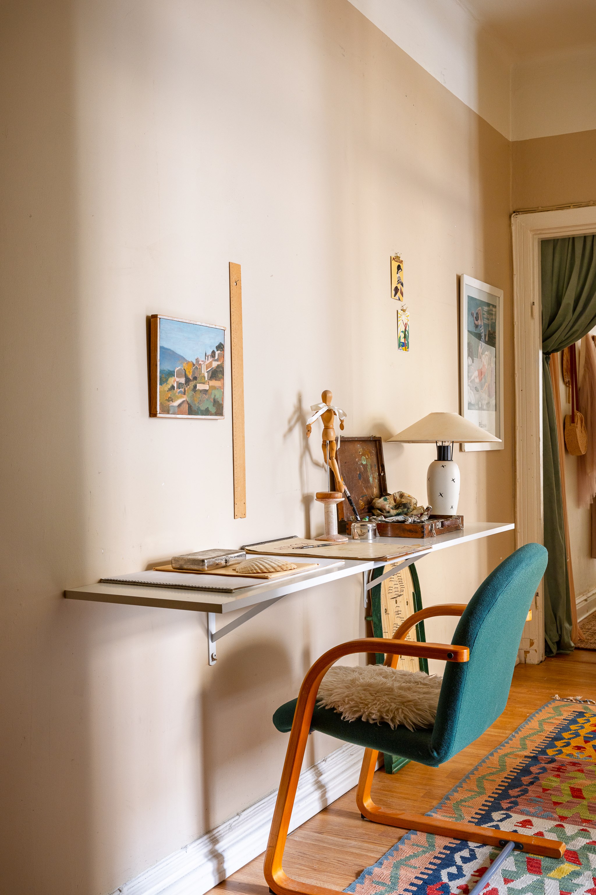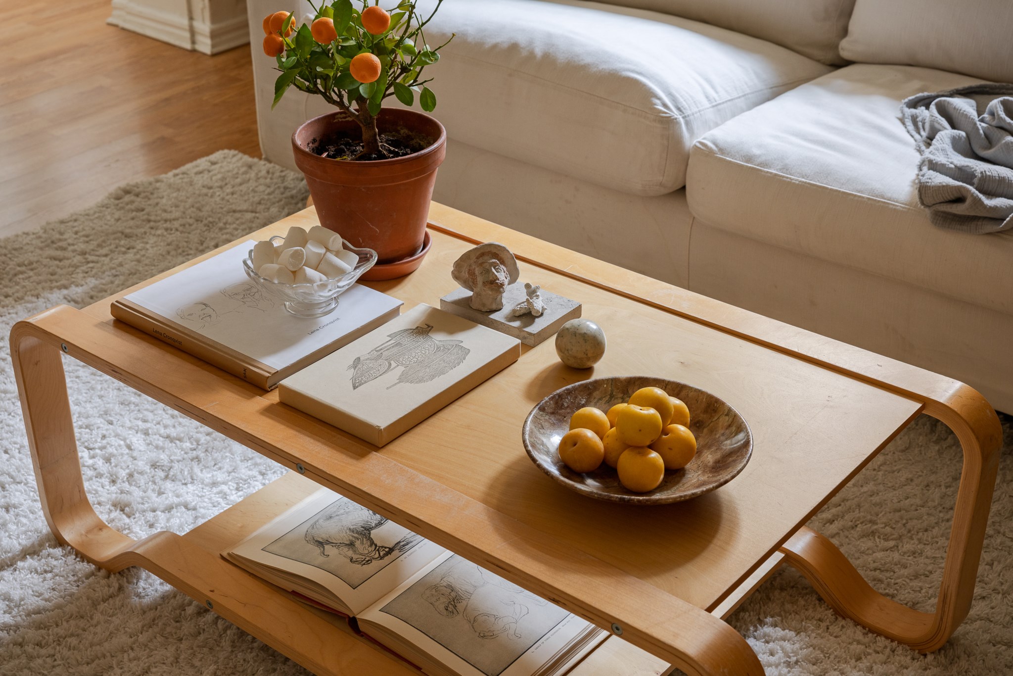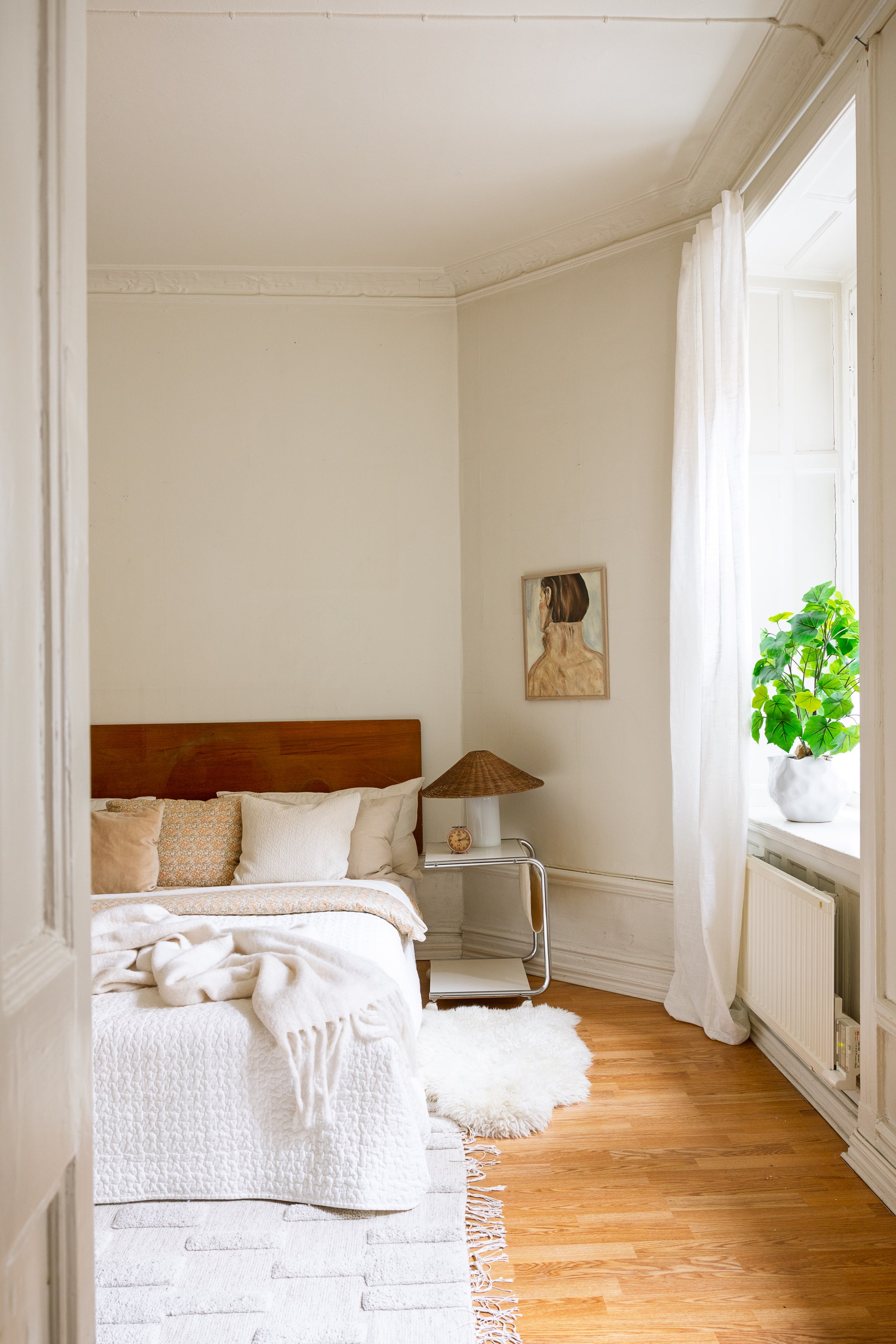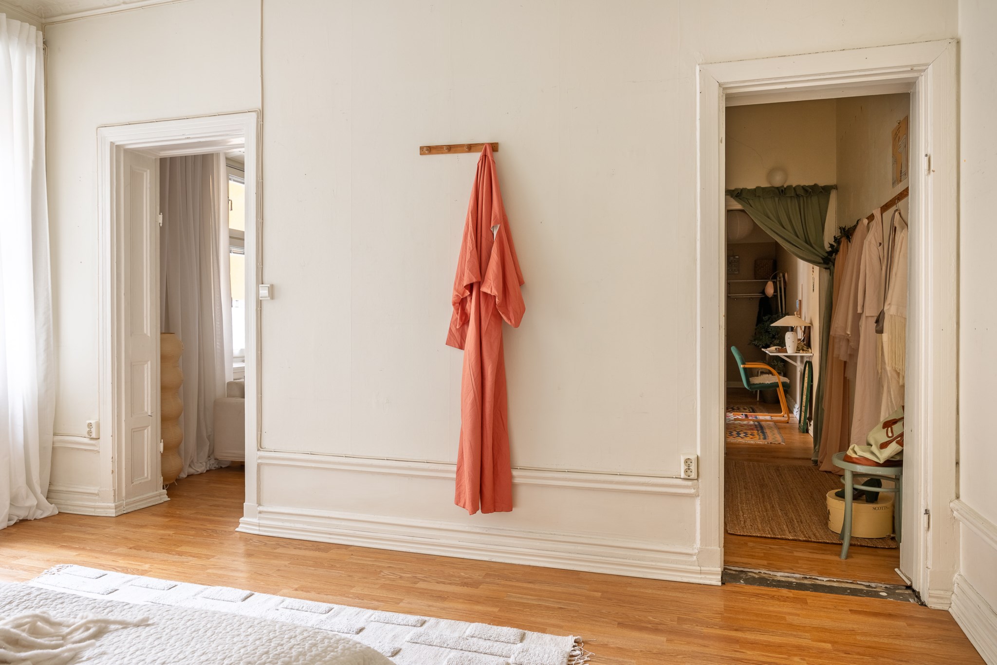 Ljus och inbjudande hall med beige väggar och ljust trägolv. Här finns praktisk förvaring i form av hatthylla och krokar samt en sittbänk med mjukt fårskinn. En rund matta och en mönstrad gångmatta skapar värme, medan växter och små tavlor ger rummet en personlig och hemtrevlig känsla.