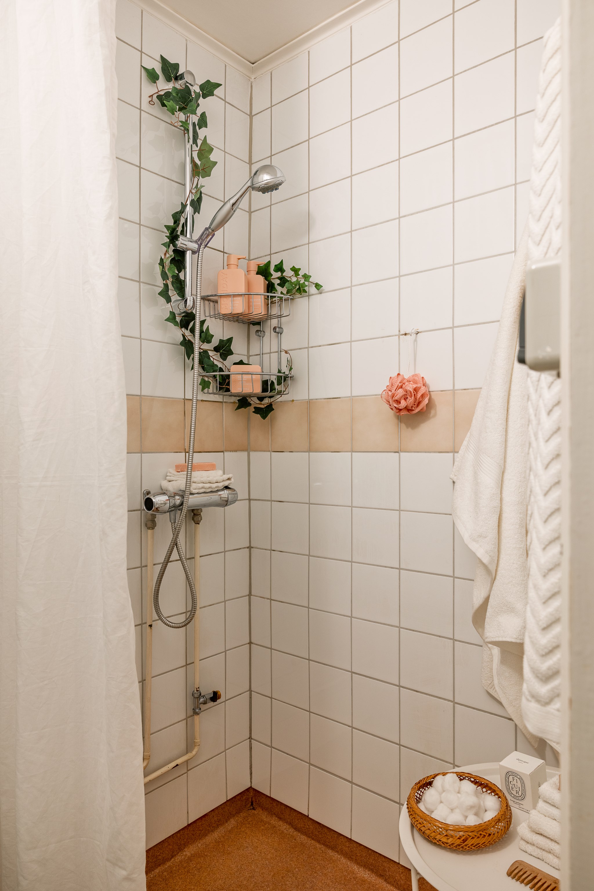 Praktiskt badrum med helkaklade väggar i vitt och duschhörna med duschdraperi. Utrustat med WC, handfat med spegelskåp samt handdukstork. Här finns även förvaringshyllor i duschen och goda upphängningsmöjligheter. Ett funktionellt badrum med ljus och fräsch känsla.