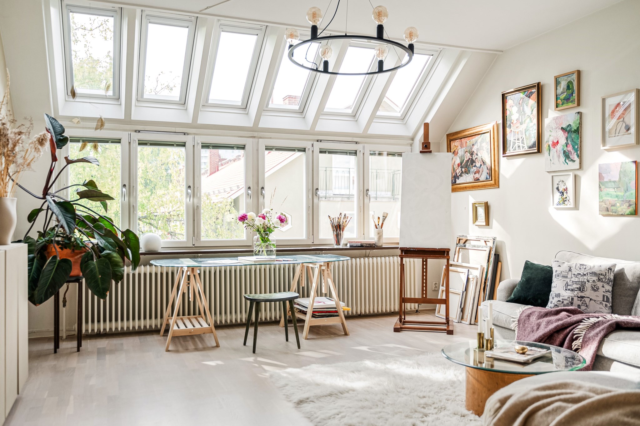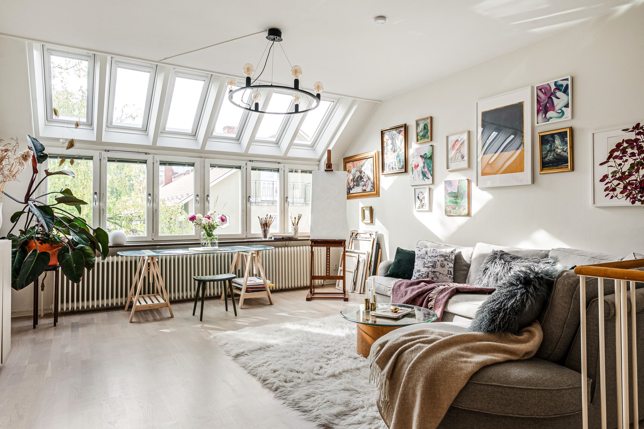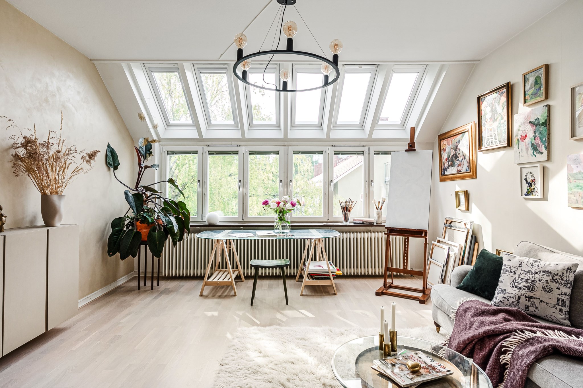 En trappa upp finner ni det storslagna vardagsrummet med parkettgolv, ljusa väggar samt ett generöst ljusinsläpp från flertalet fönster samt takfönster. Rummet är inbjudande och kreativt med plats för större soffmöblemang, soffbord, bokhylla och arbetsbord. Rummet utformades med inspiration av en ateljé av arkitekten Ture Wennerholm.