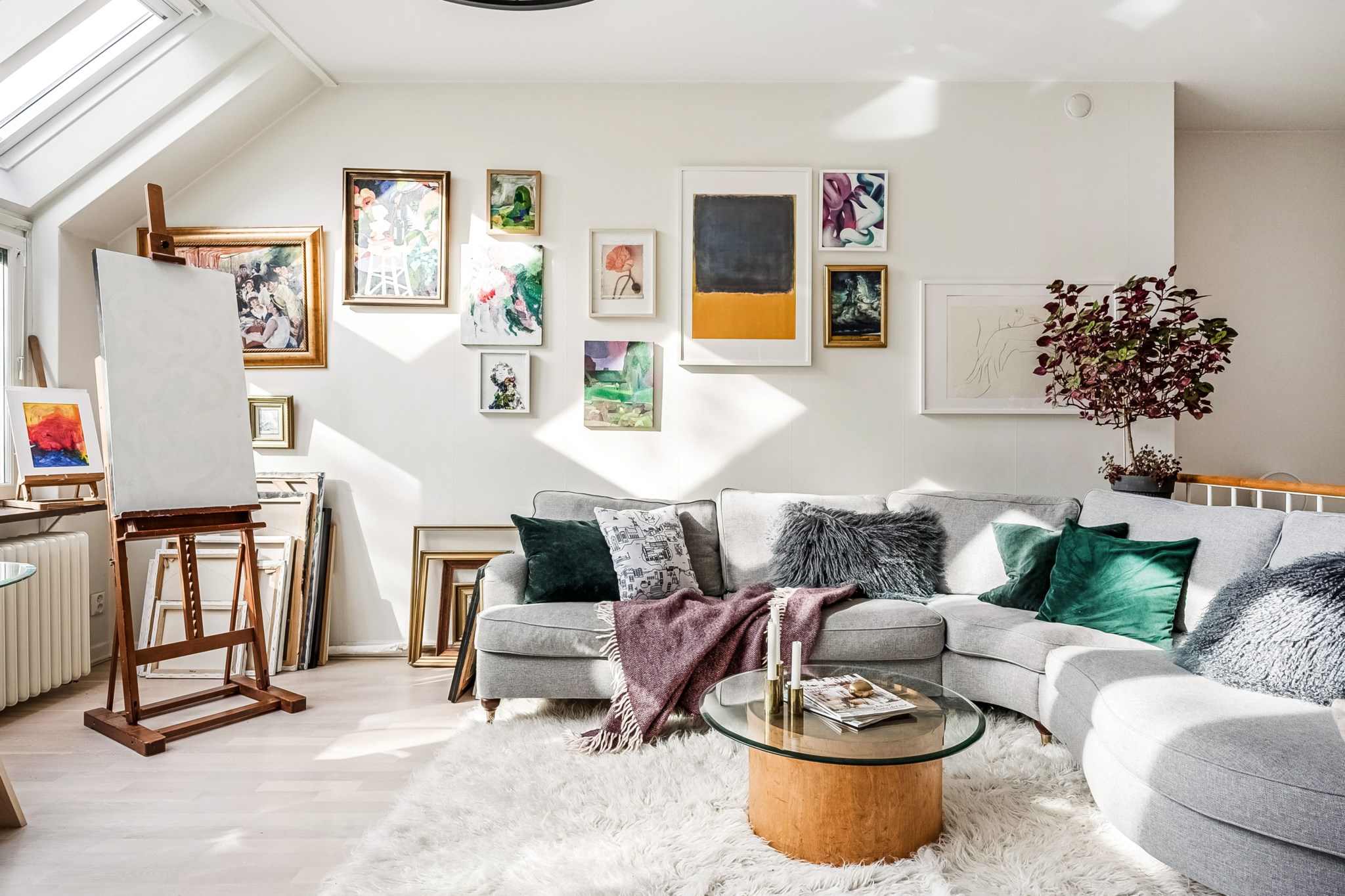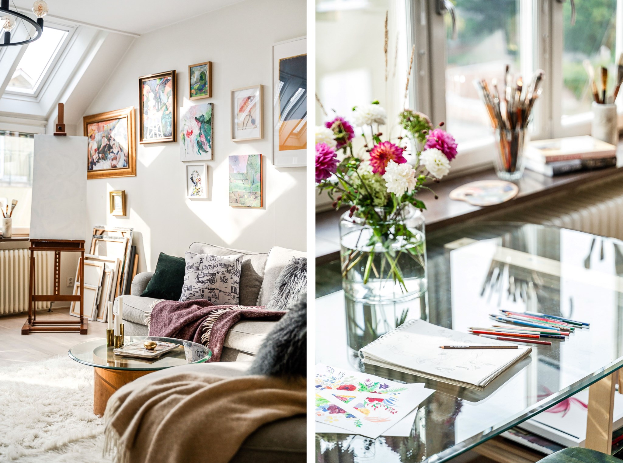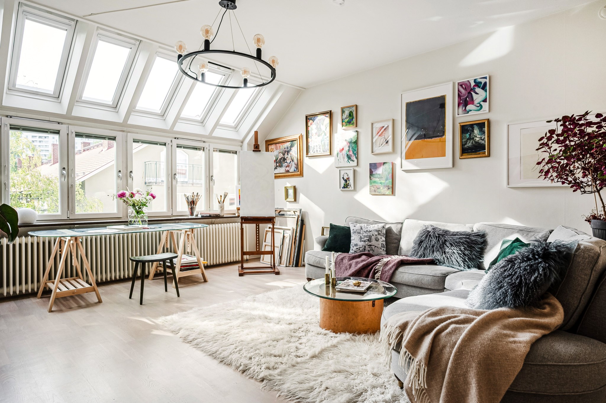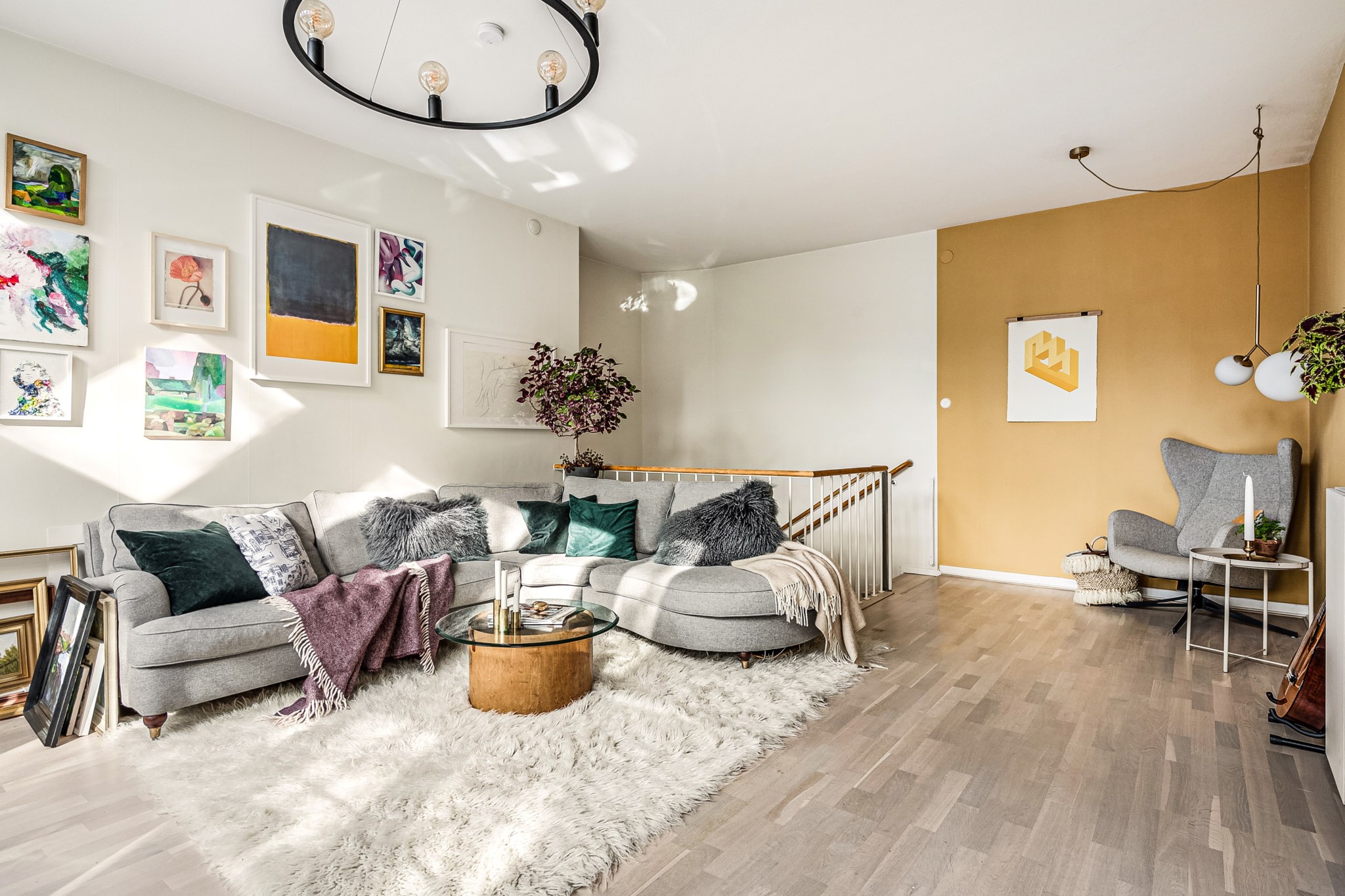 En trappa upp finner ni det storslagna vardagsrummet med parkettgolv, ljusa väggar samt ett generöst ljusinsläpp från flertalet fönster samt takfönster. Rummet är inbjudande och kreativt med plats för större soffmöblemang, soffbord, bokhylla och arbetsbord. Rummet utformades med inspiration av en ateljé av arkitekten Ture Wennerholm.