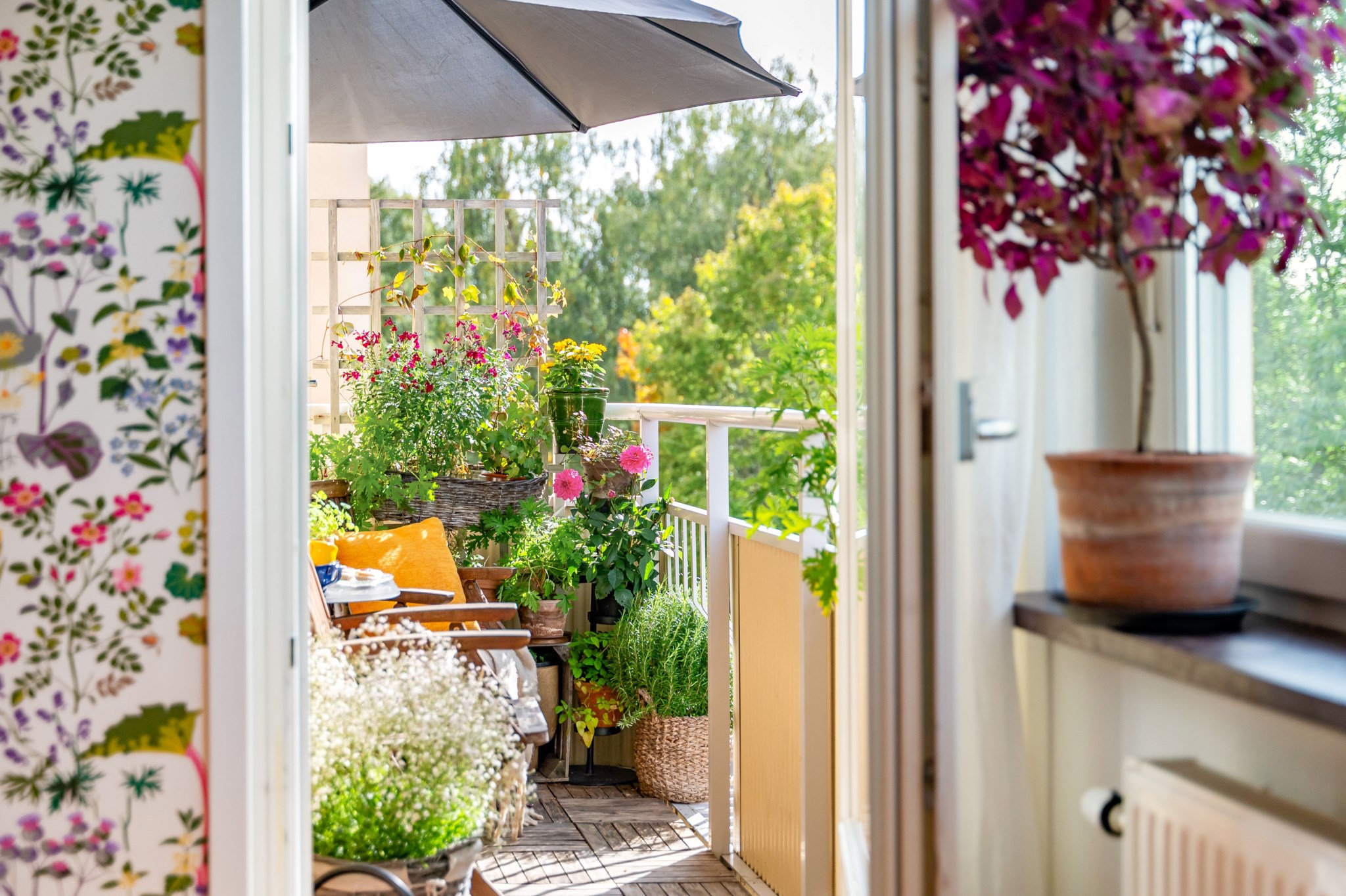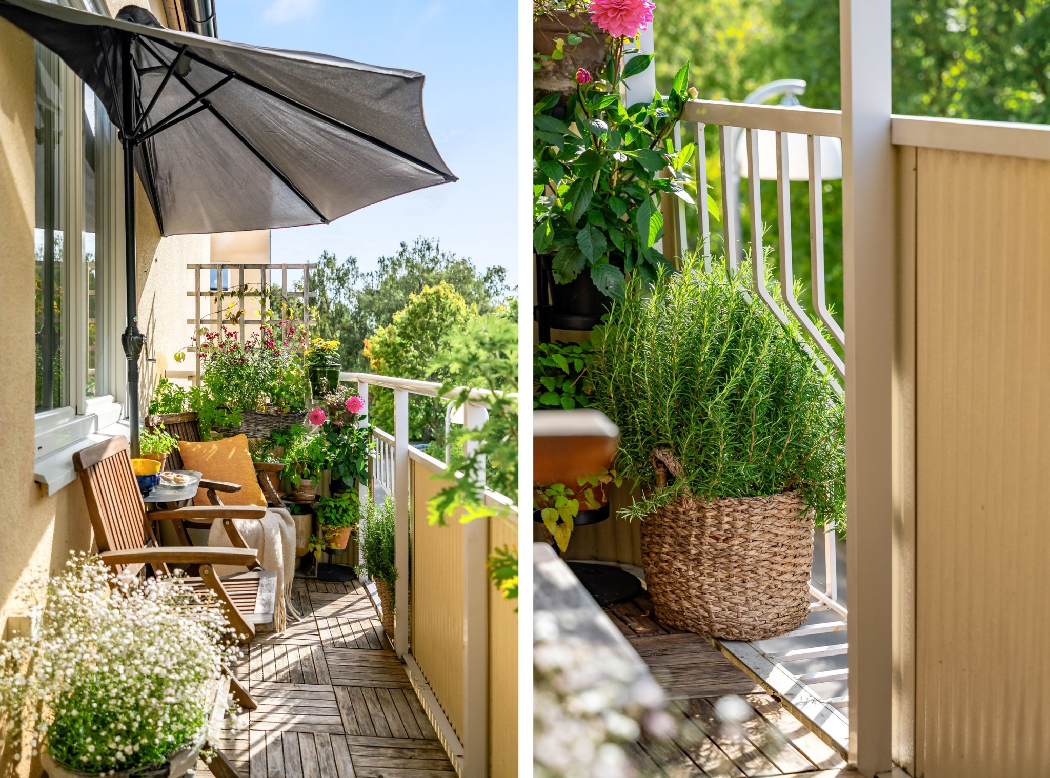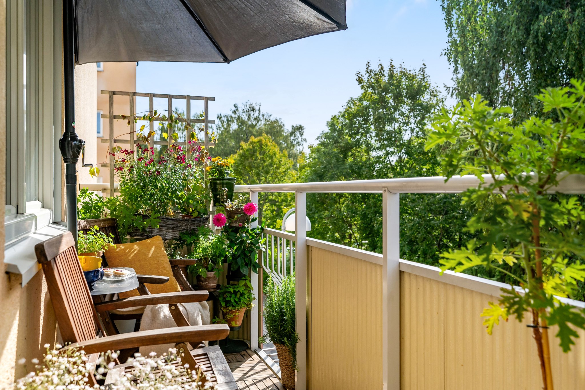 Solig balkong i sydväst-läge med trätrall och plats för utemöbler. Välkomna att bilda er egen oas!