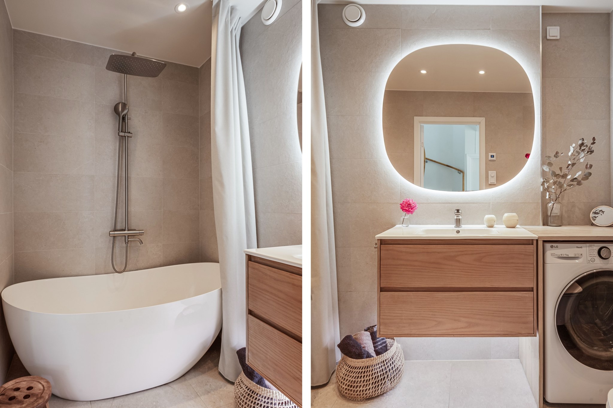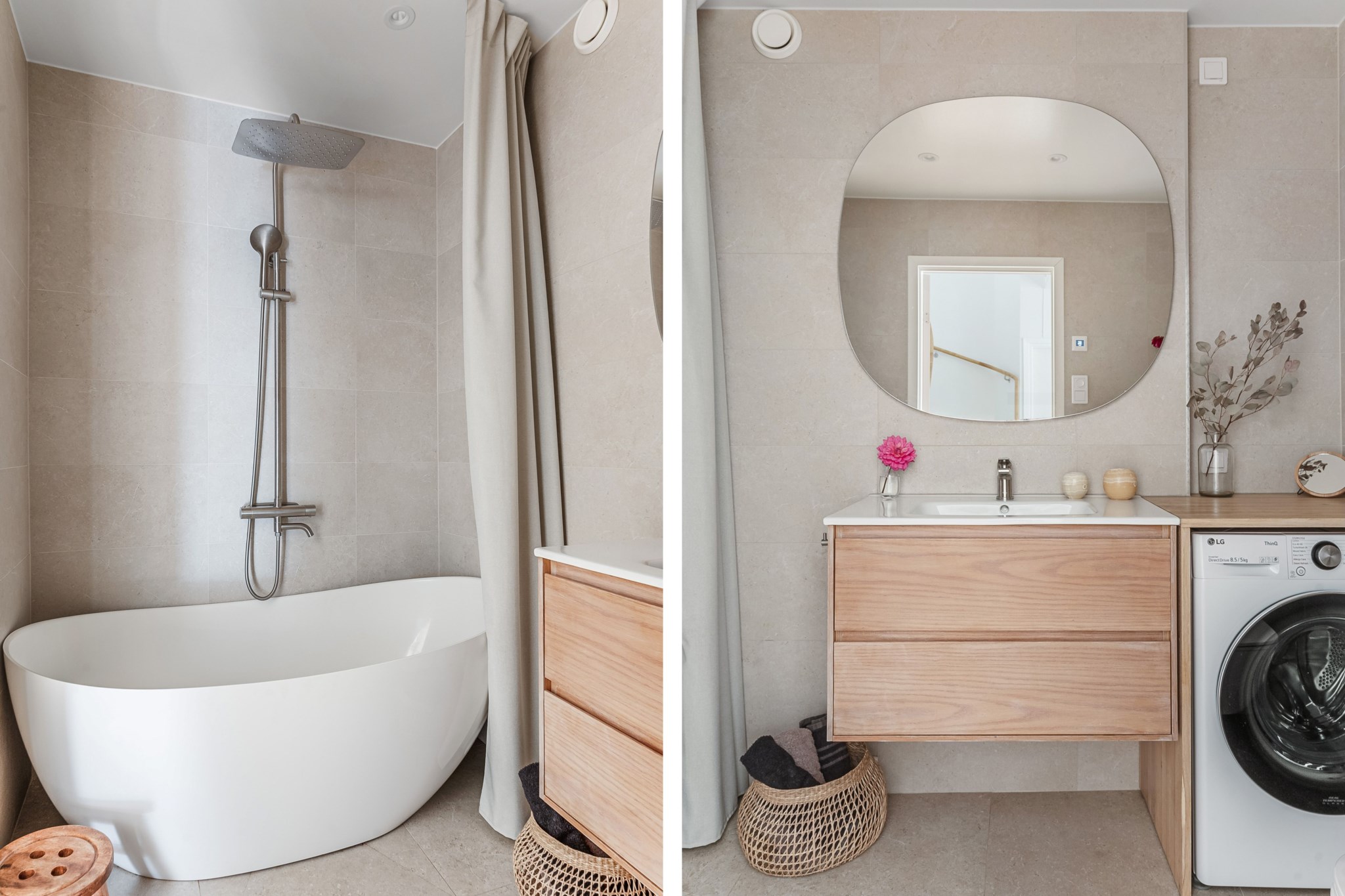Nyrenoverat badrum i smakfullt sandfärgade toner med detaljer av borstat stål. Komplett utrustat med spegel från Haven ovan kommod, generöst ovalt badkar med stor takdusch, golvvärme, spotlights med tempererat ljus, wc, handdukstork samt kombinerad tvätt och torktumlare.