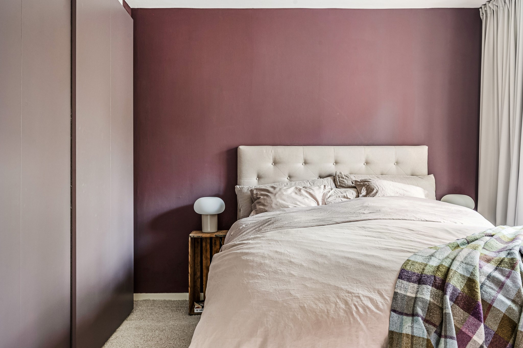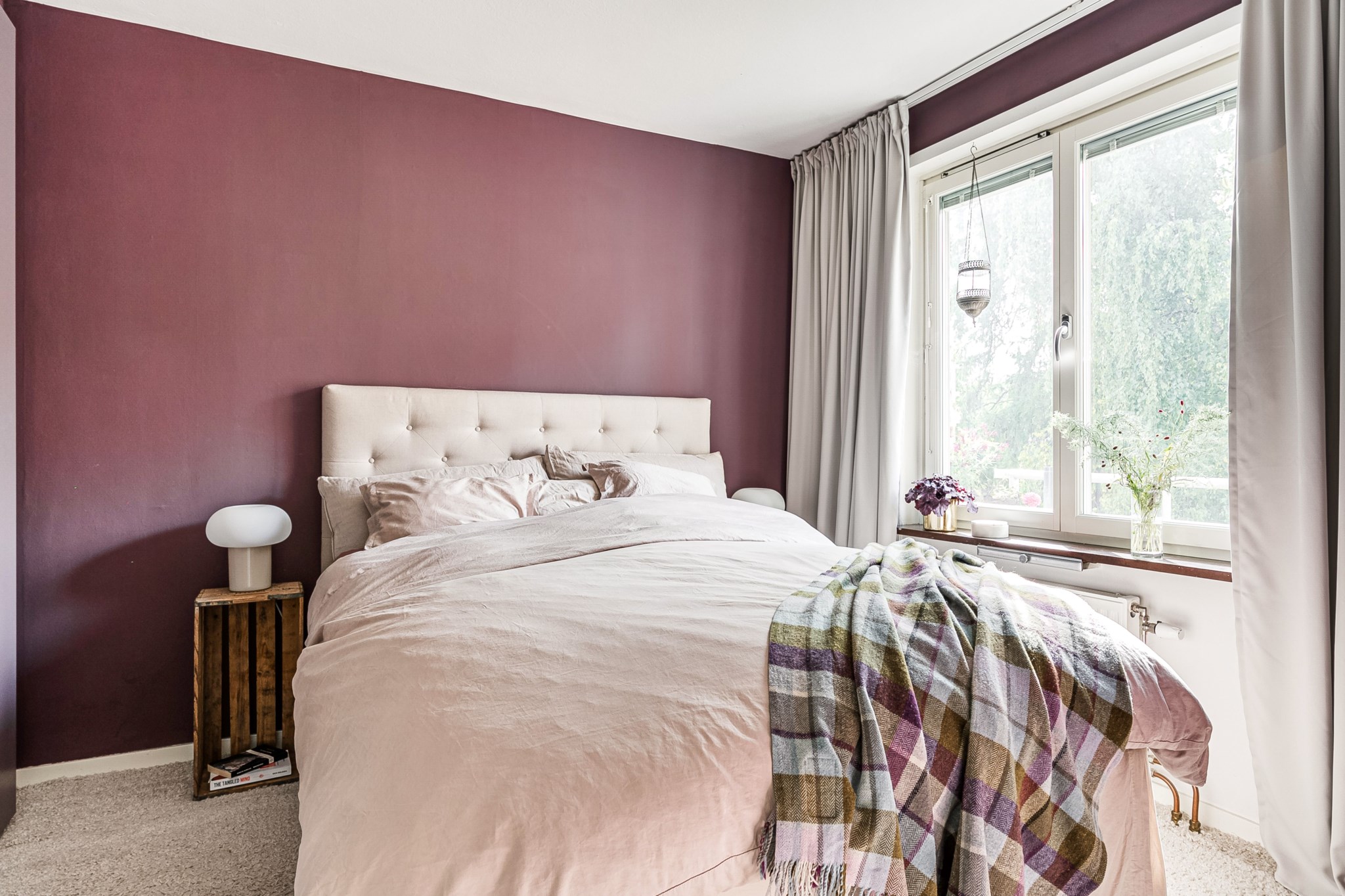 Inbjudande sovrum med parkettgolv och väggar målade i en rogivande ton. Plats för dubbelsäng och nattduksbord. Förvaring i garderober längs hela ena väggen och ett stort fönsterparti för naturligt ljusinsläpp.
