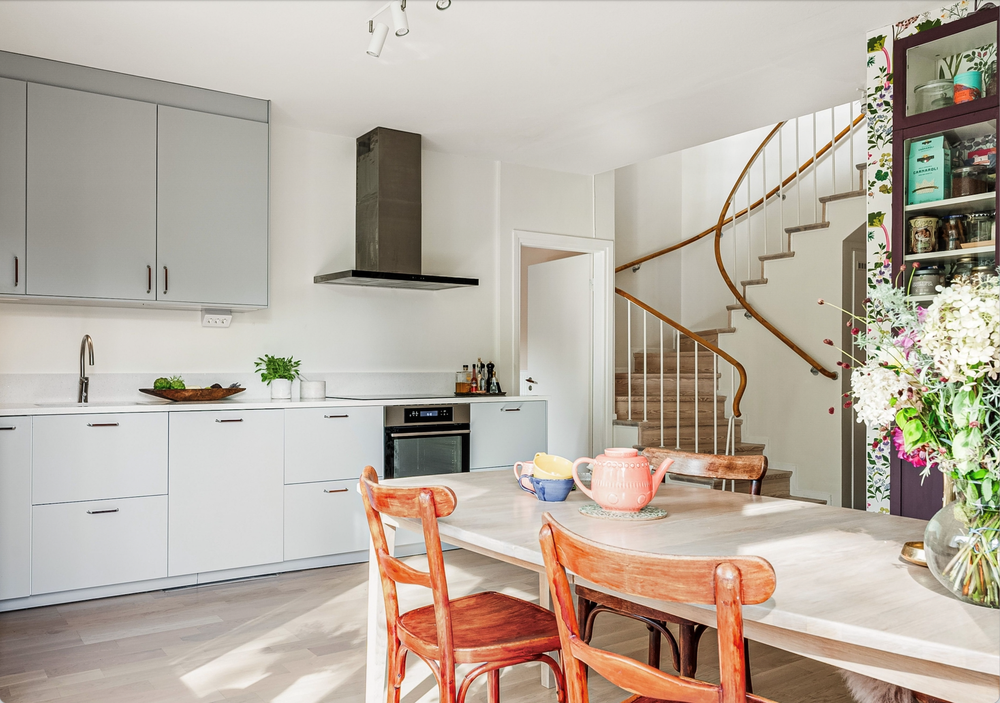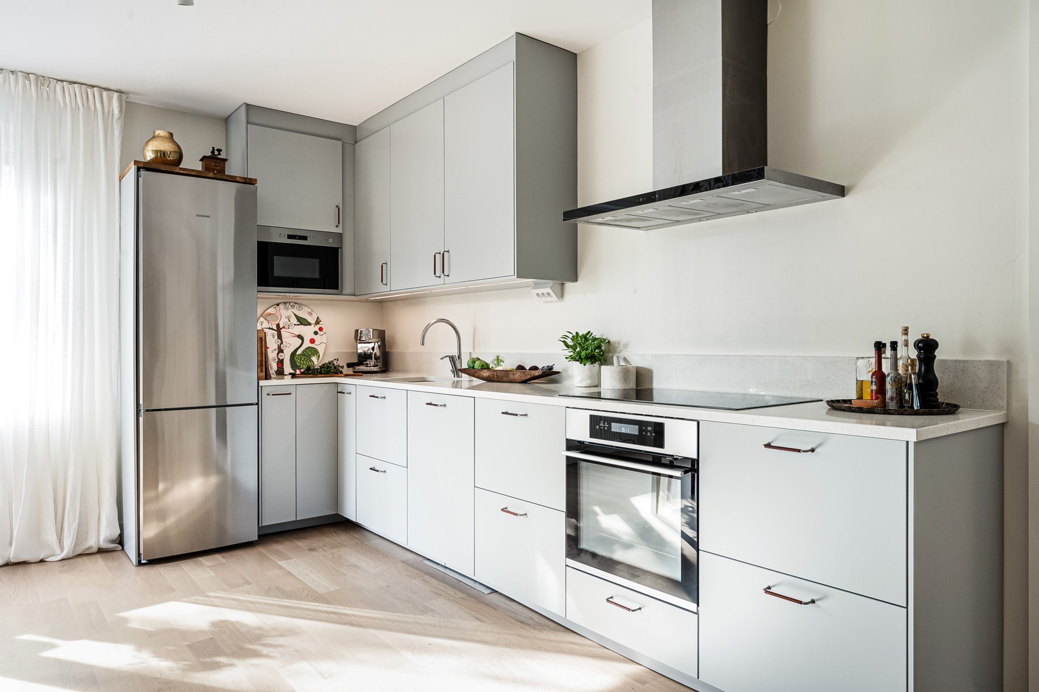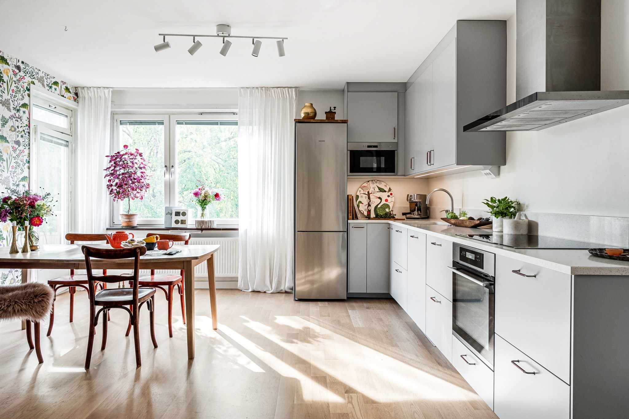 Stilrent kök med parkettgolv, ljusa väggar, en färgsprakande fondvägg och utgång till bostadens balkong. Vacker ljus bänkskiva med god arbetsyta. God förvaring i skåp med ljusgrå fronter med fina beslag med läderdetaljer. Köket är välutrustat med bred spishäll, ugn, fläkt, mikro, diskmaskin och kyl/frys. Gott om plats för en större matgrupp.