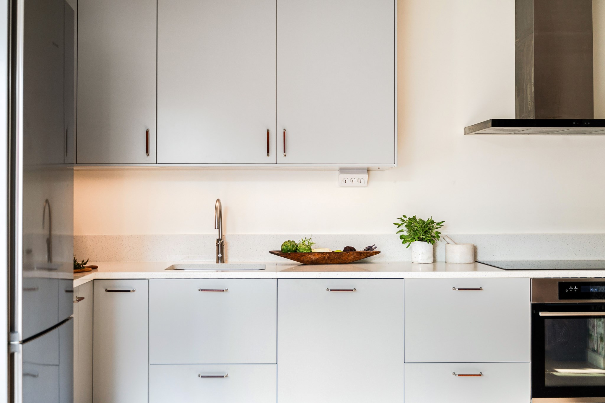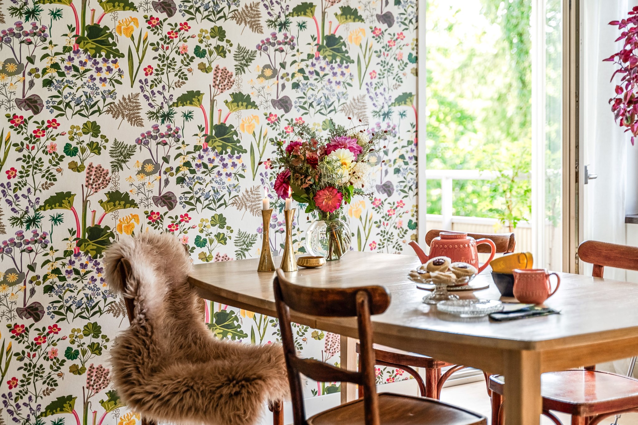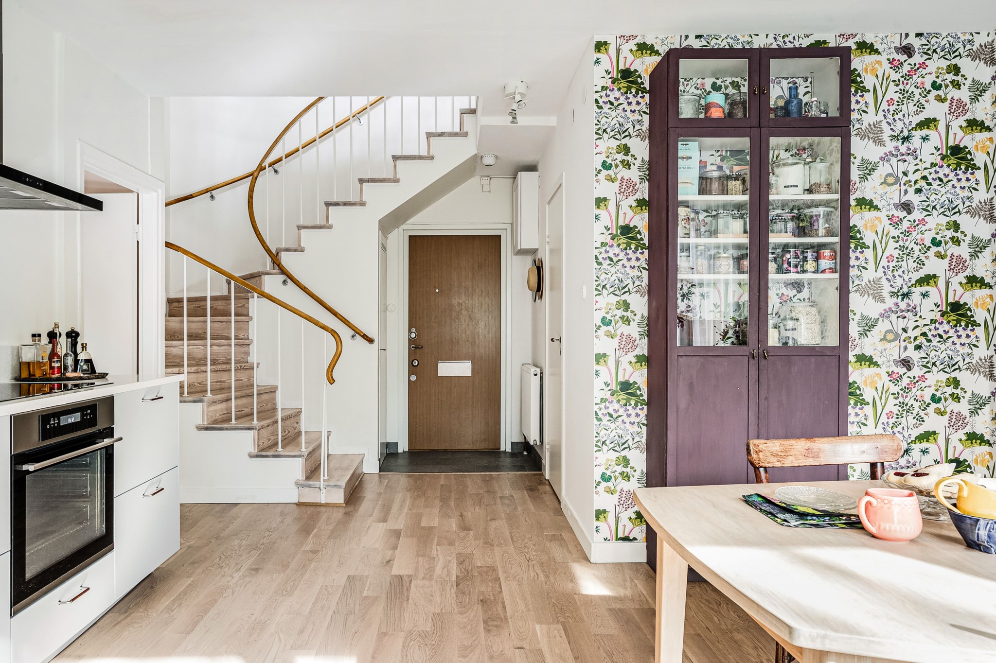 Stilrent kök med parkettgolv, ljusa väggar, en färgsprakande fondvägg och utgång till bostadens balkong. Vacker ljus bänkskiva med god arbetsyta. God förvaring i skåp med ljusgrå fronter med fina beslag med läderdetaljer. Köket är välutrustat med bred spishäll, ugn, fläkt, mikro, diskmaskin och kyl/frys. Gott om plats för en större matgrupp.