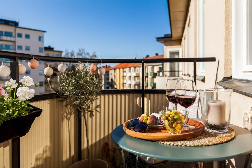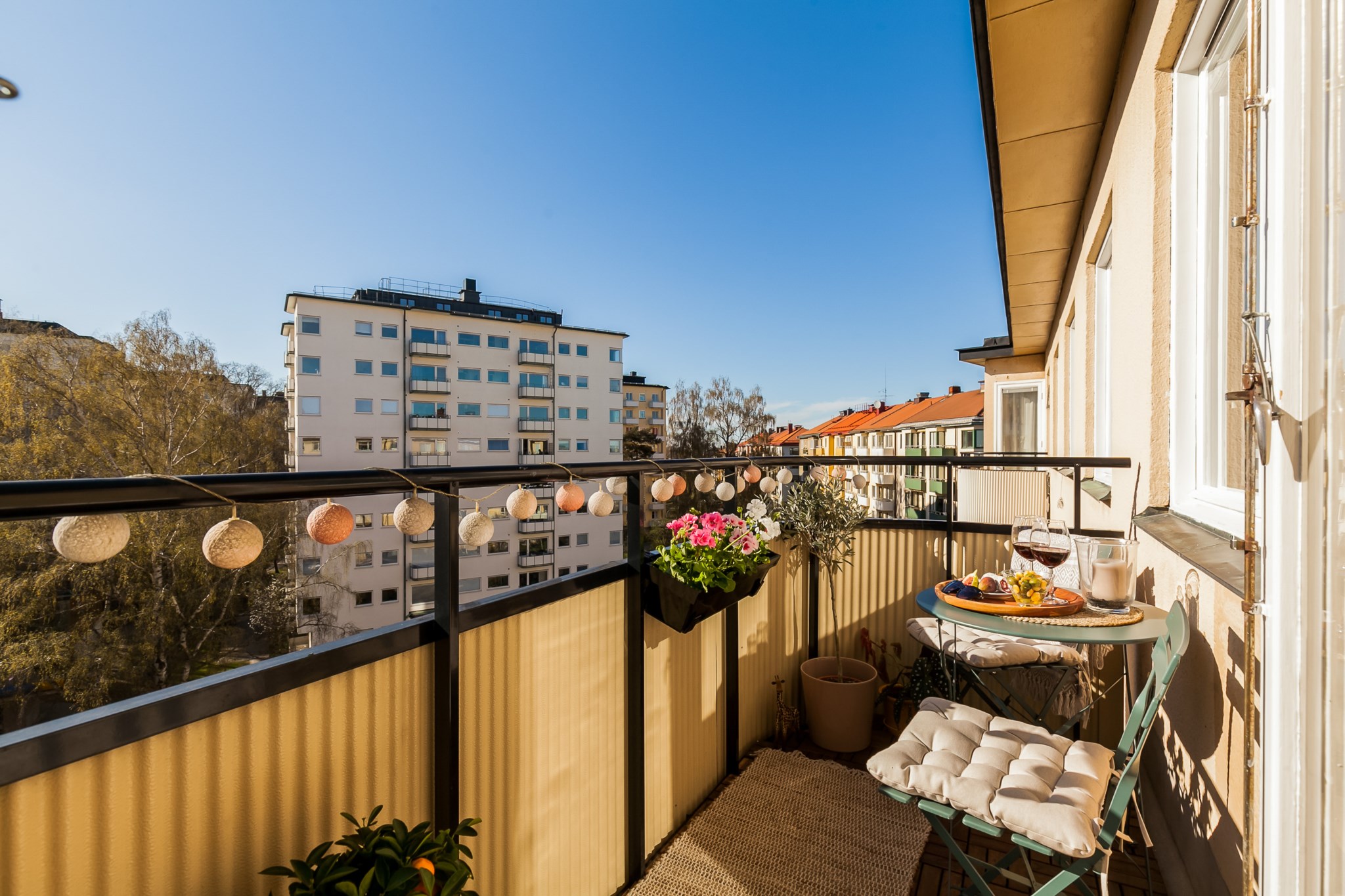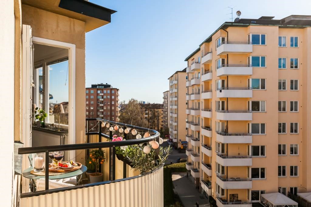 Högt belägen balkong med plats för trevligt möblemang. Här kan ni njuta av solen under stora delar av både dagen och kvällen.