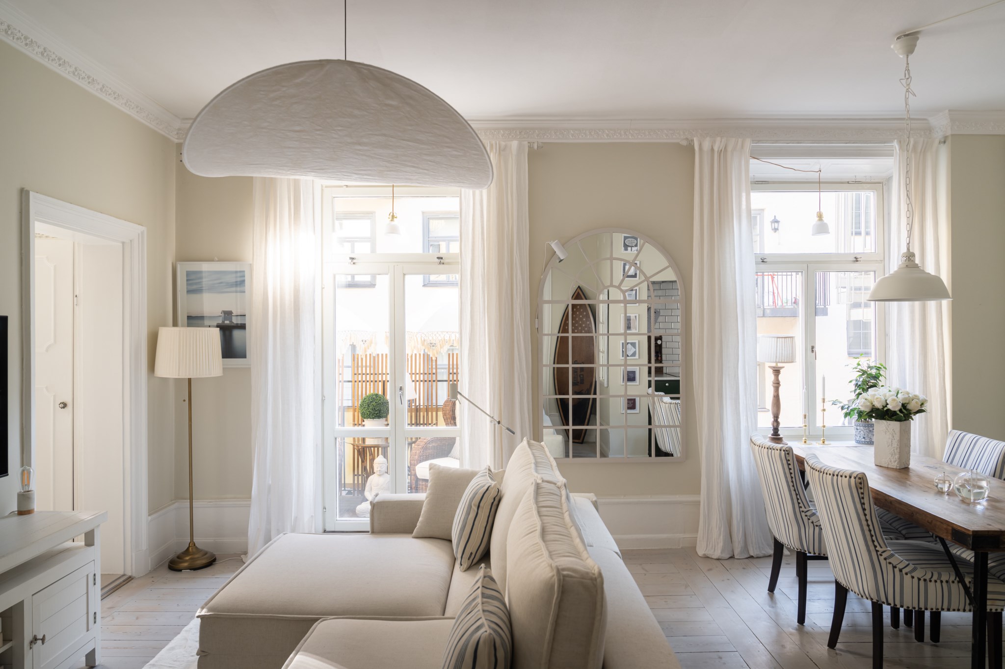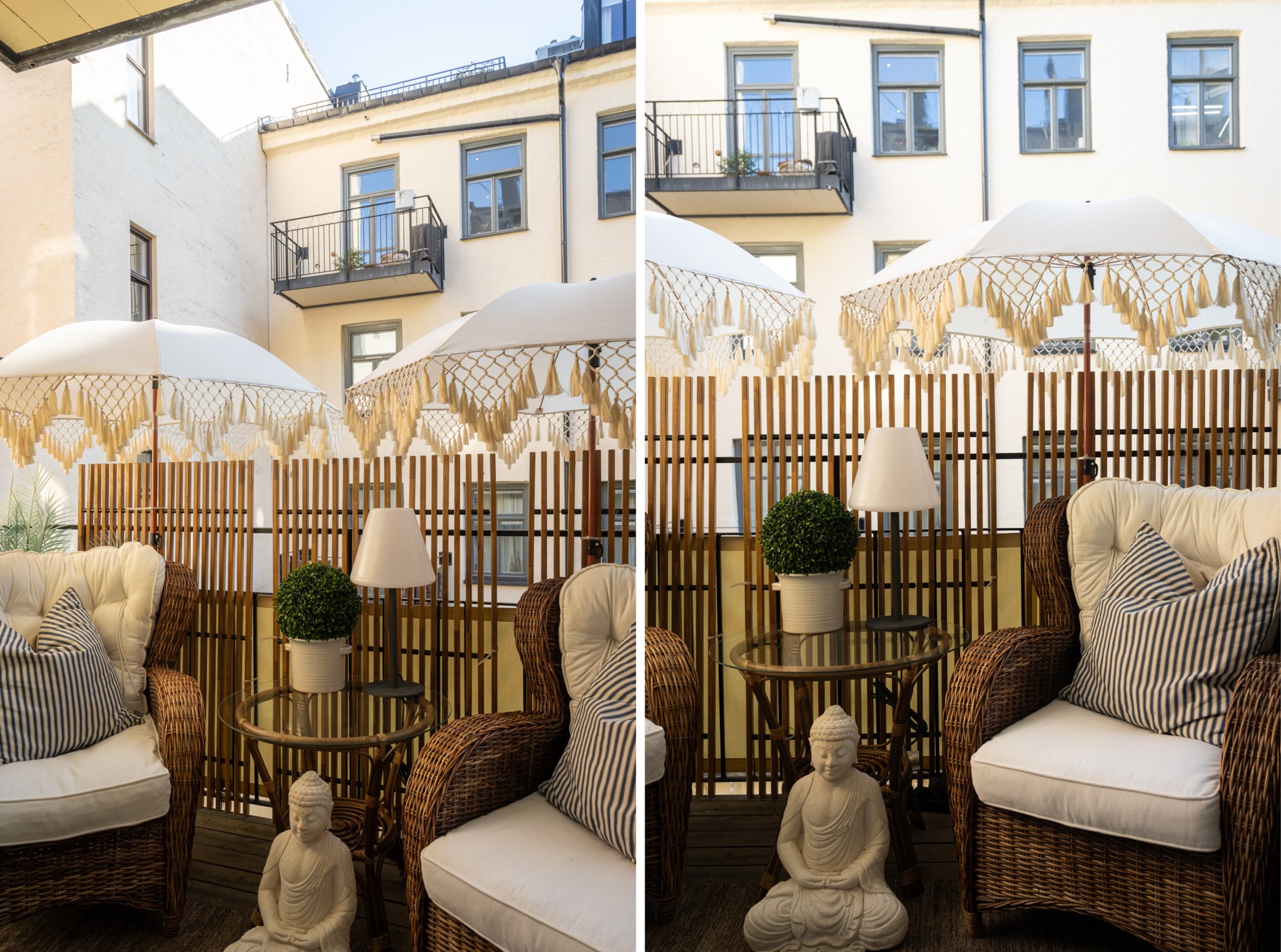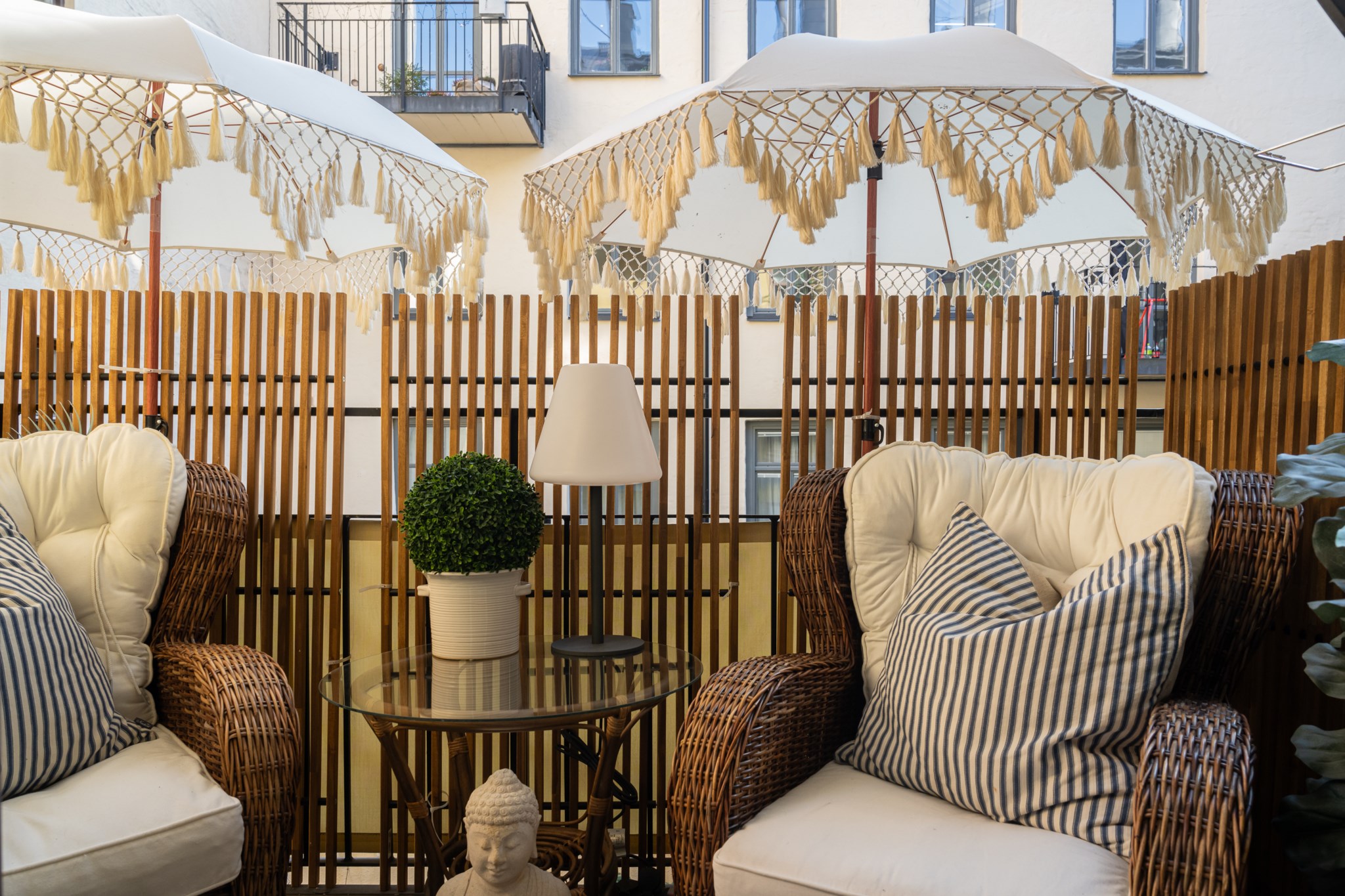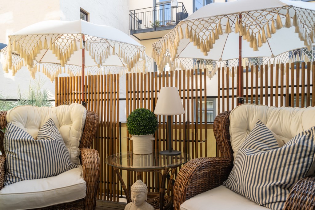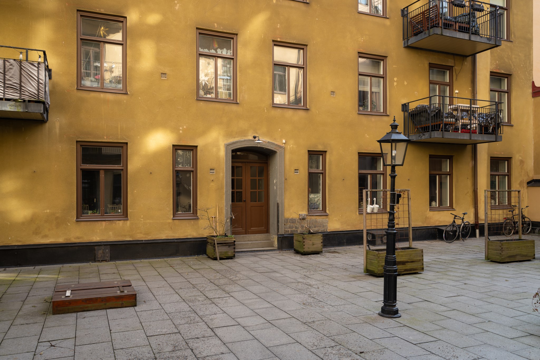 Den stora balkongen mot gården blir en naturlig förlängning av bostaden under årets varmare månader!