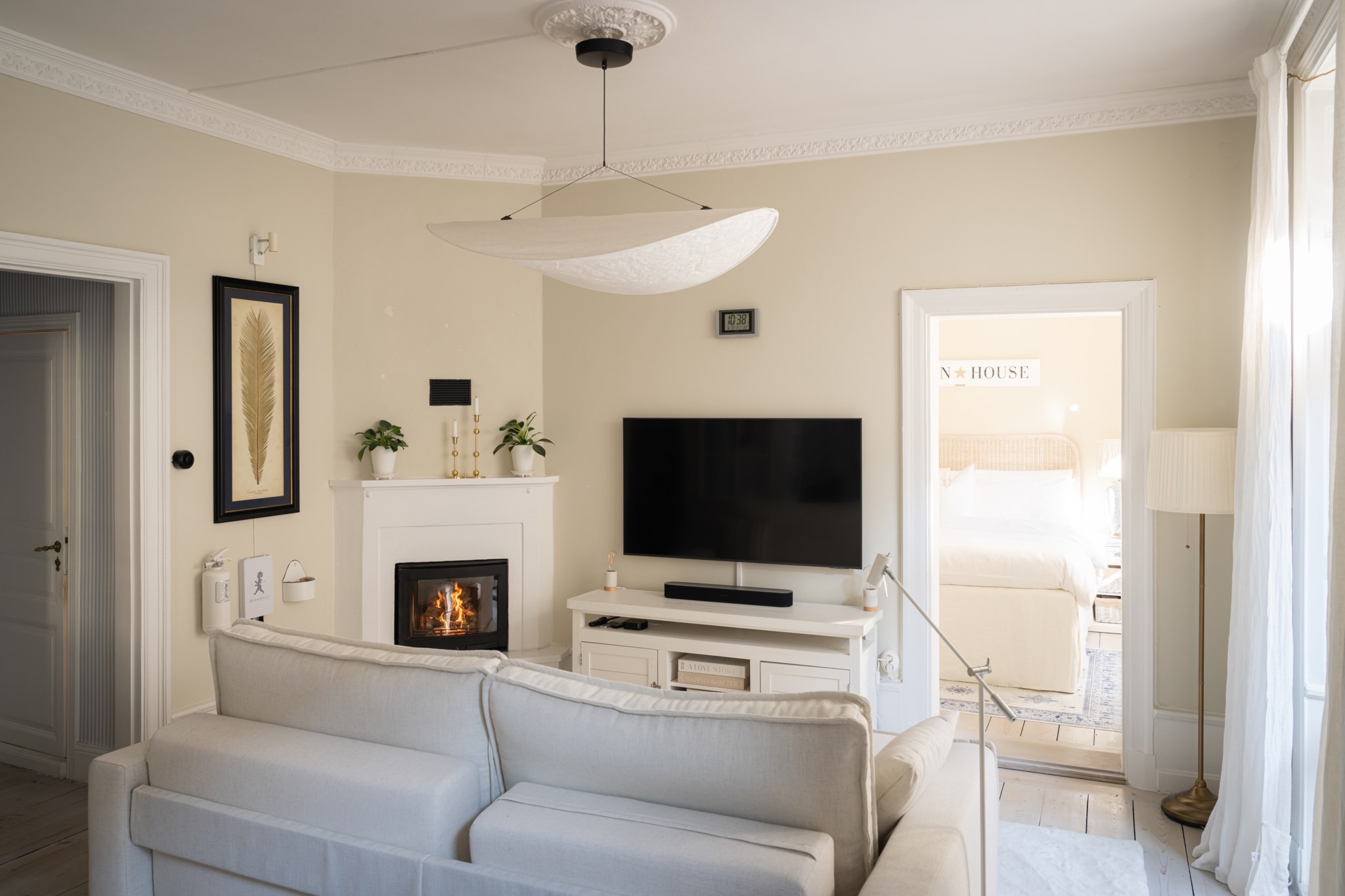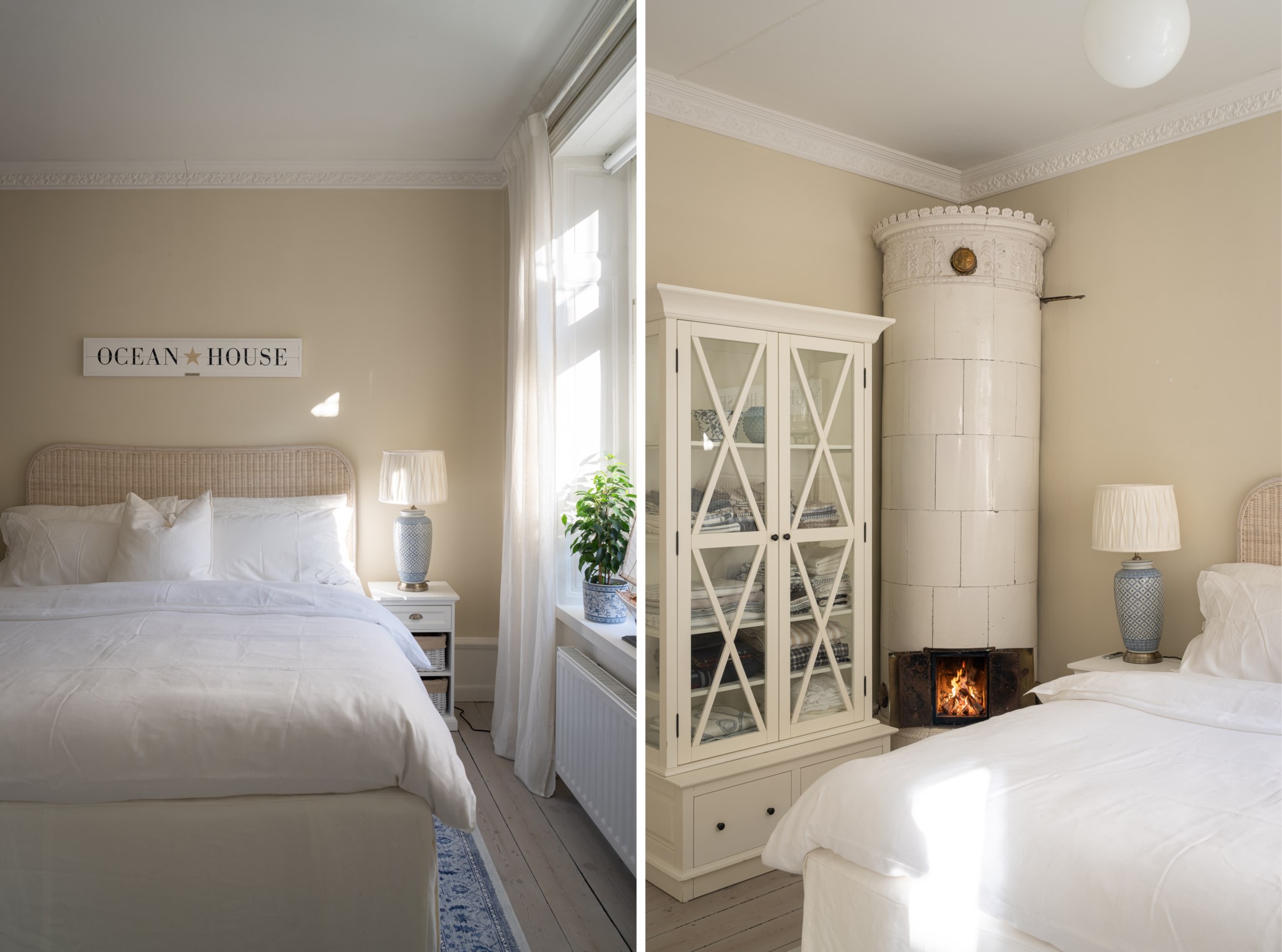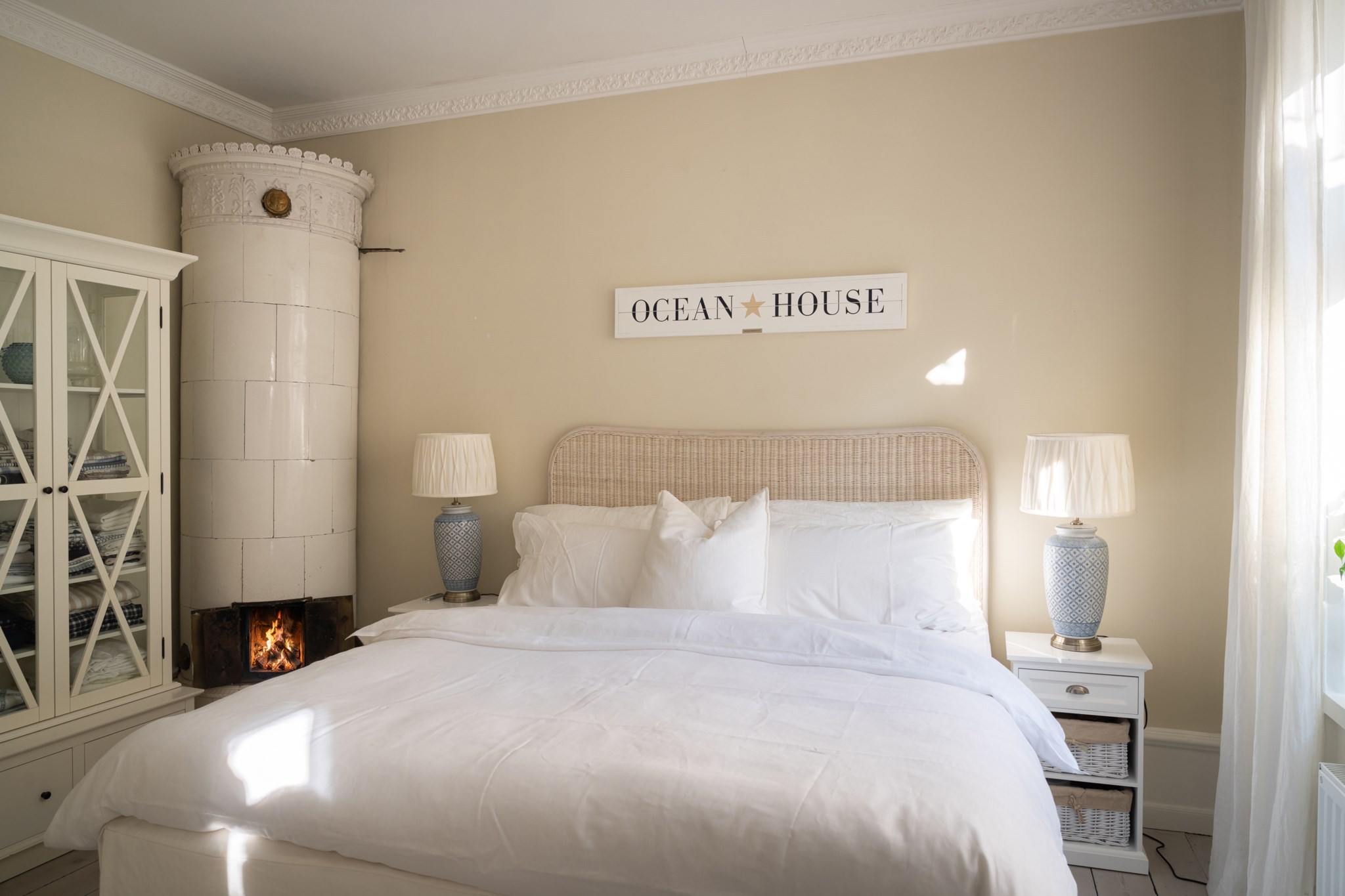 Rogivande sovrum med ljusa ytskikt och ljust golv. Naturligt ljusinsläpp från fönster ger rummet en behaglig atmosfär. En vacker kakelugn pryder sovrummets hörn och skapar en varm och trivsam känsla. Här finns plats för säng och sängbord, samt annan önskad förvaring.