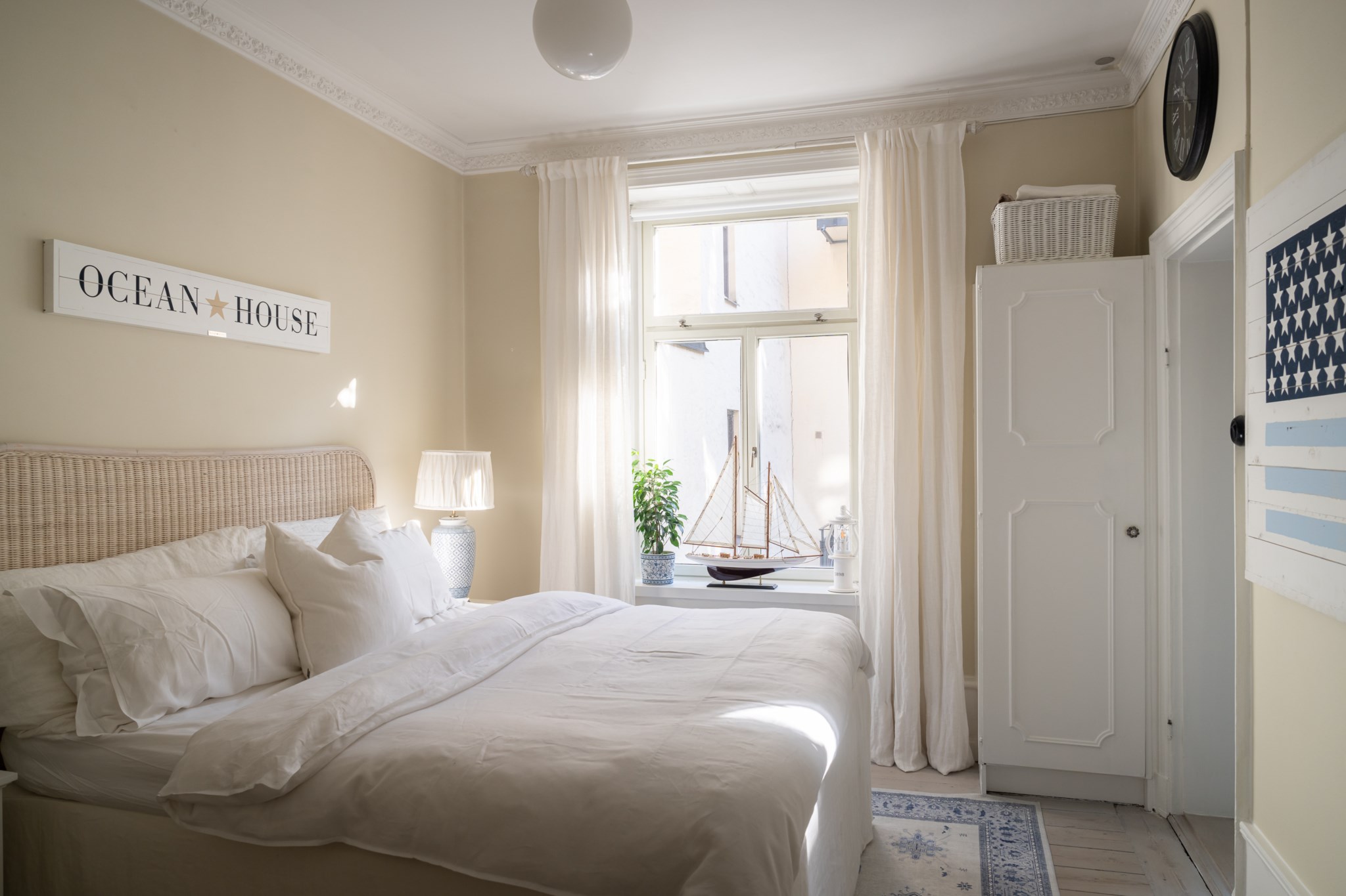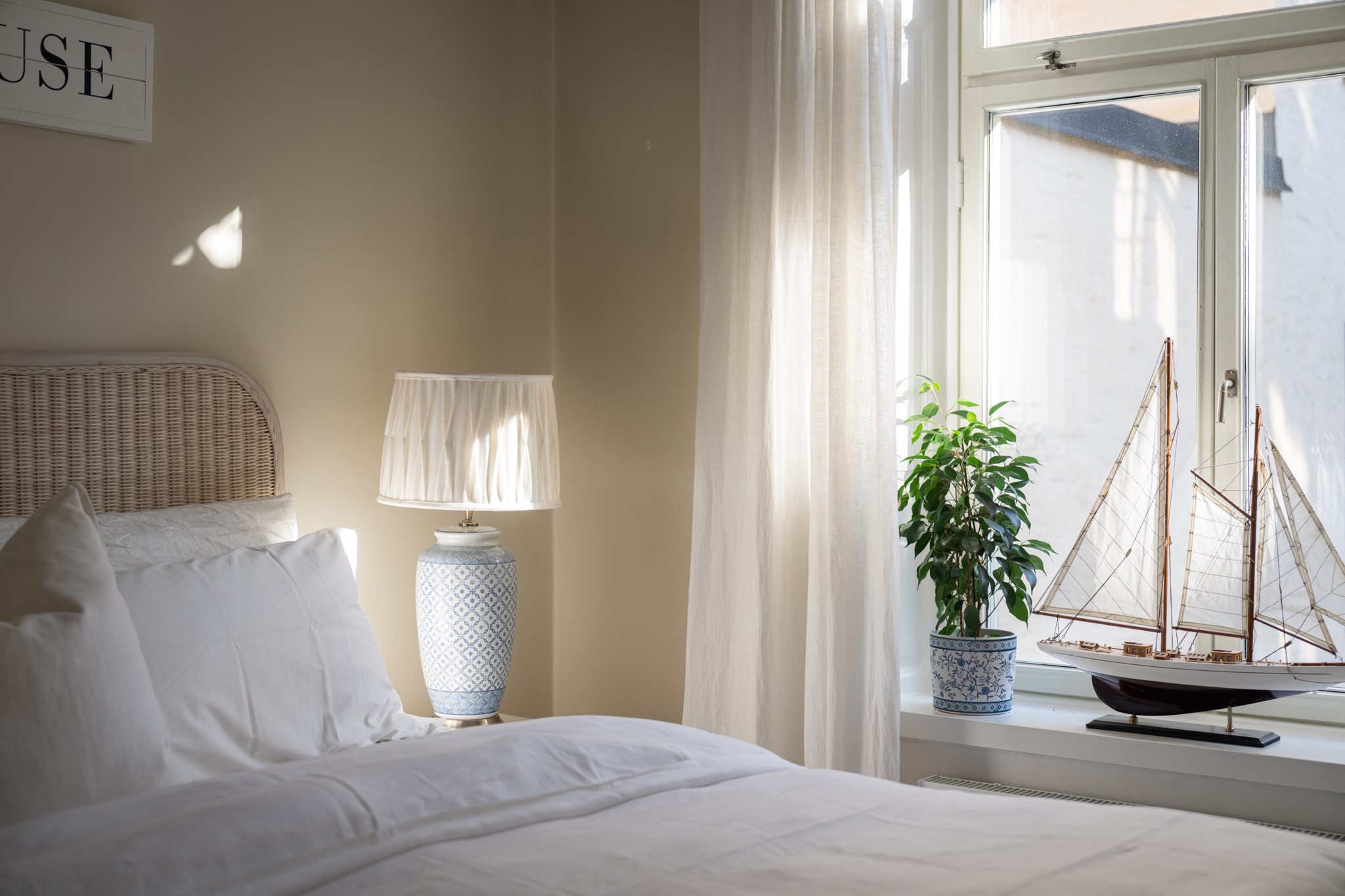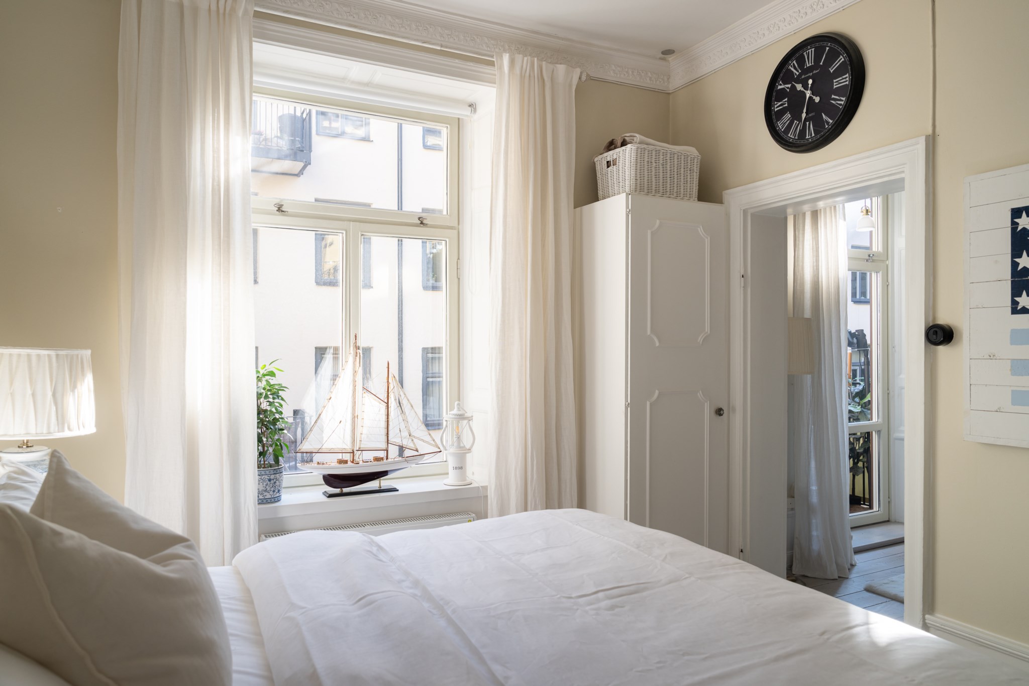 Rogivande sovrum med ljusa ytskikt och ljust golv. Naturligt ljusinsläpp från fönster ger rummet en behaglig atmosfär. En vacker kakelugn pryder sovrummets hörn och skapar en varm och trivsam känsla. Här finns plats för säng och sängbord, samt annan önskad förvaring.