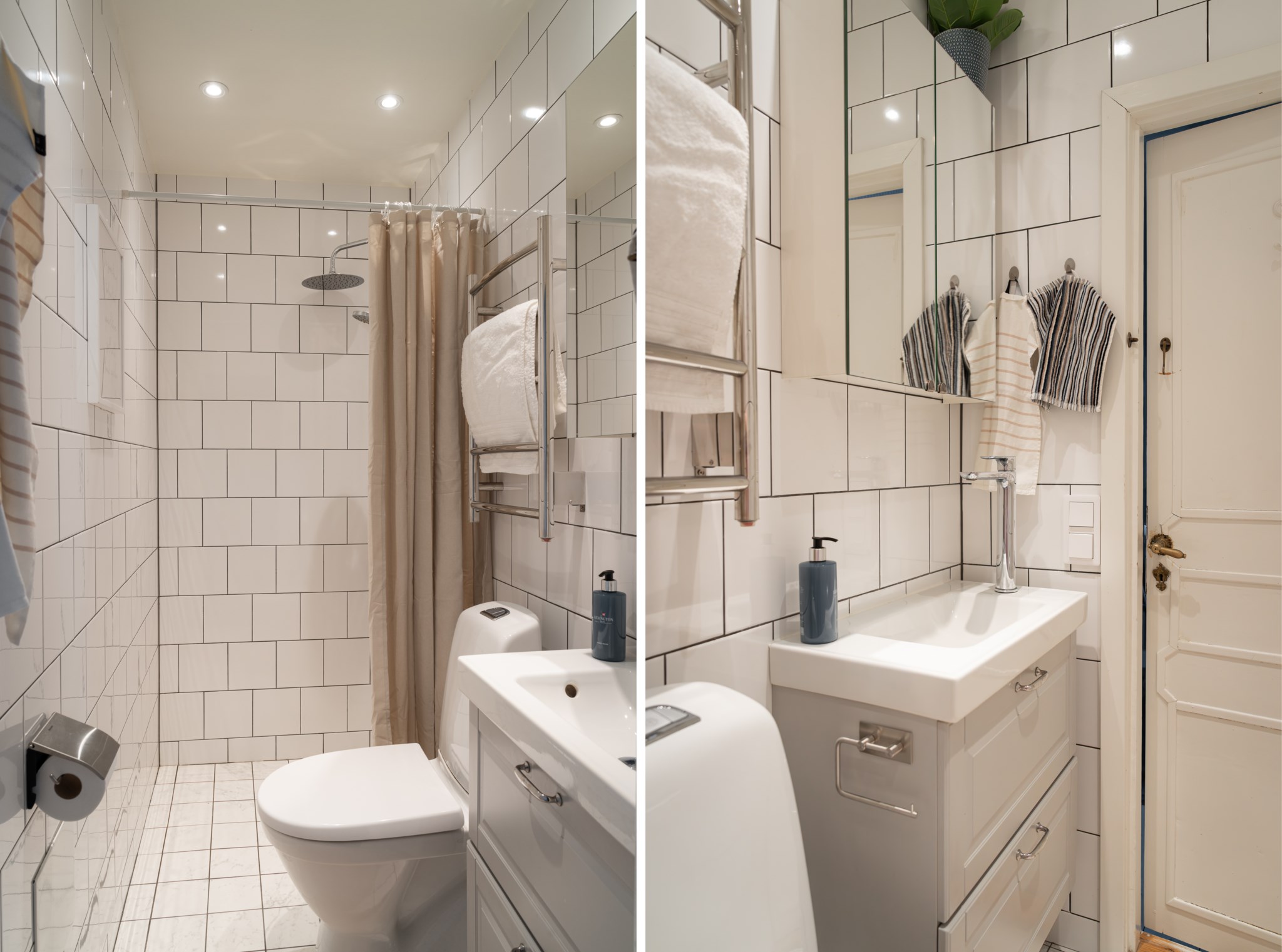 Helkaklat och ljust badrum, utrustat med WC, takdusch, kommod samt spegelskåp.