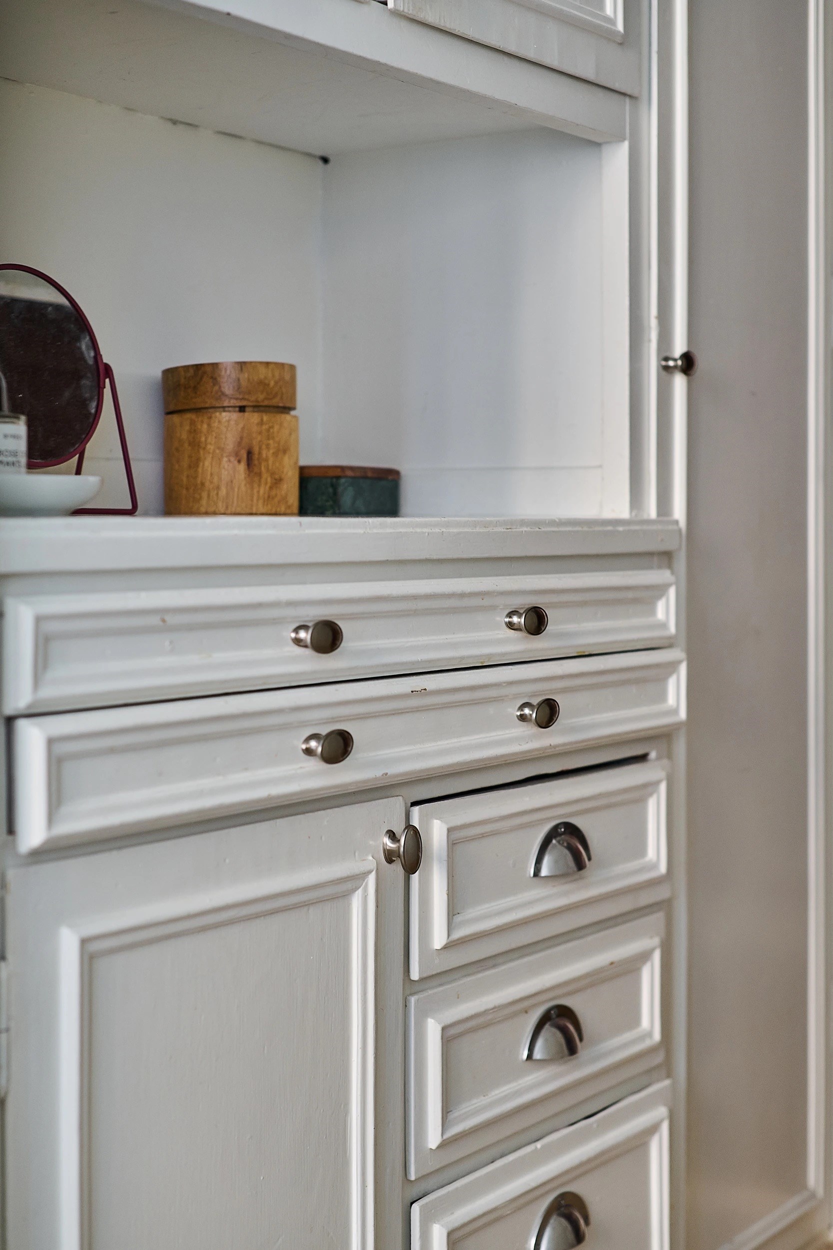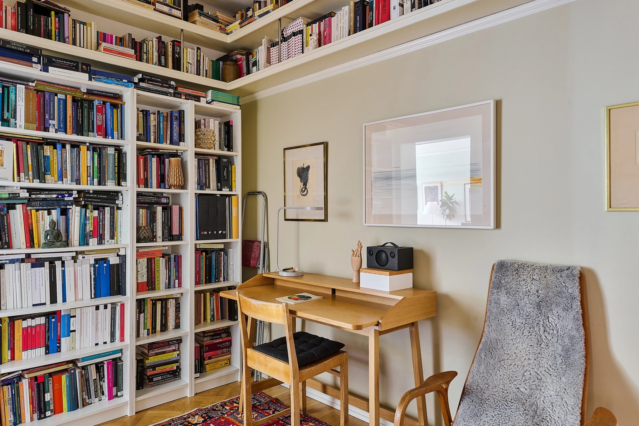 ramas in av vackra detaljer såsom inbyggda bokhyllor, dekorativa nischer och