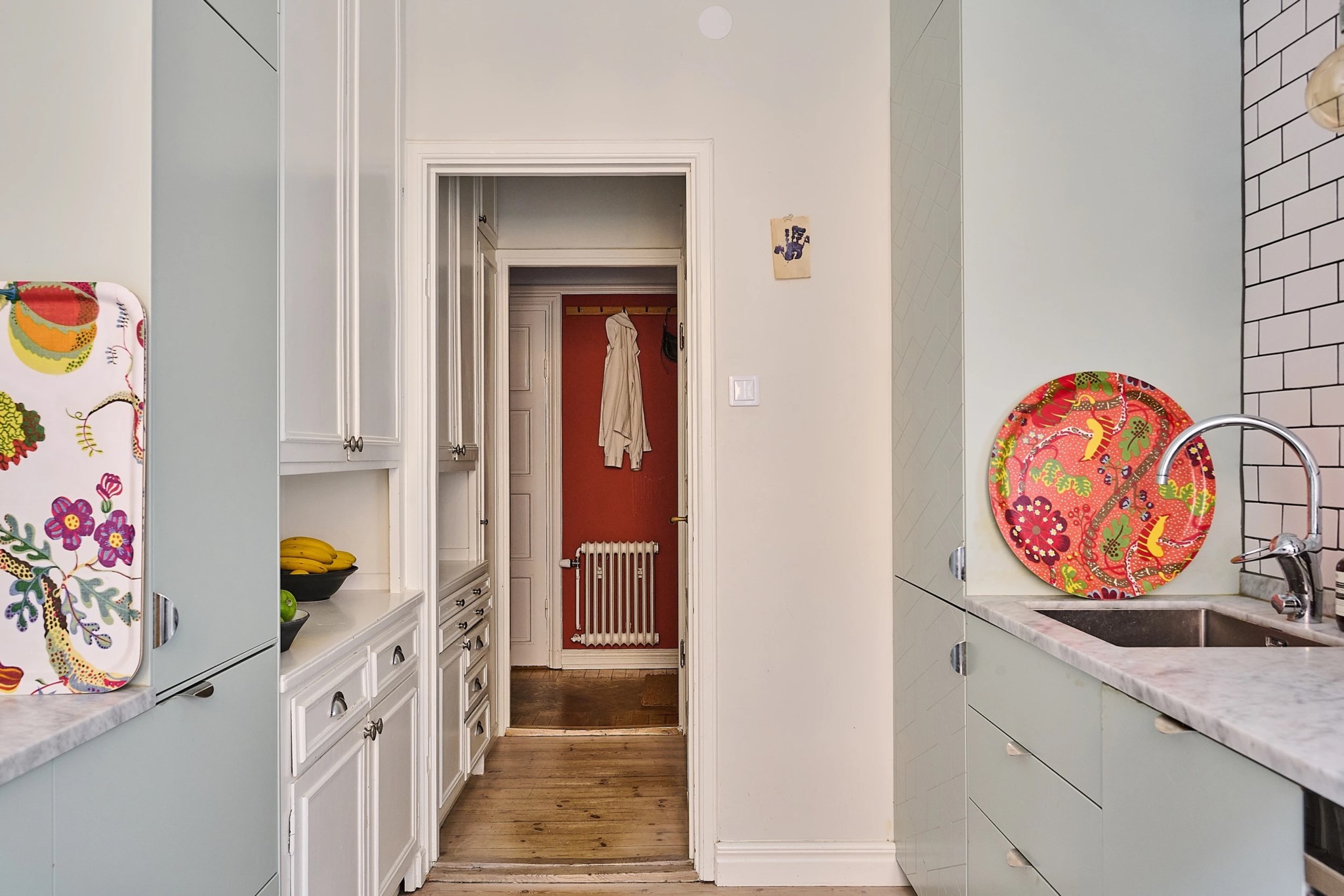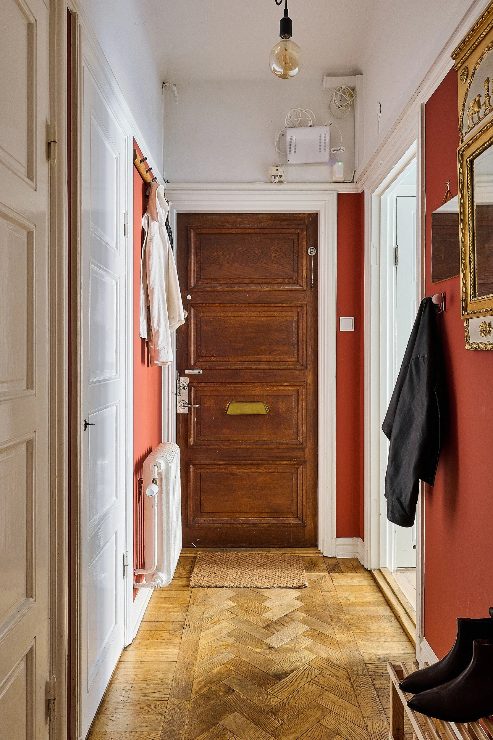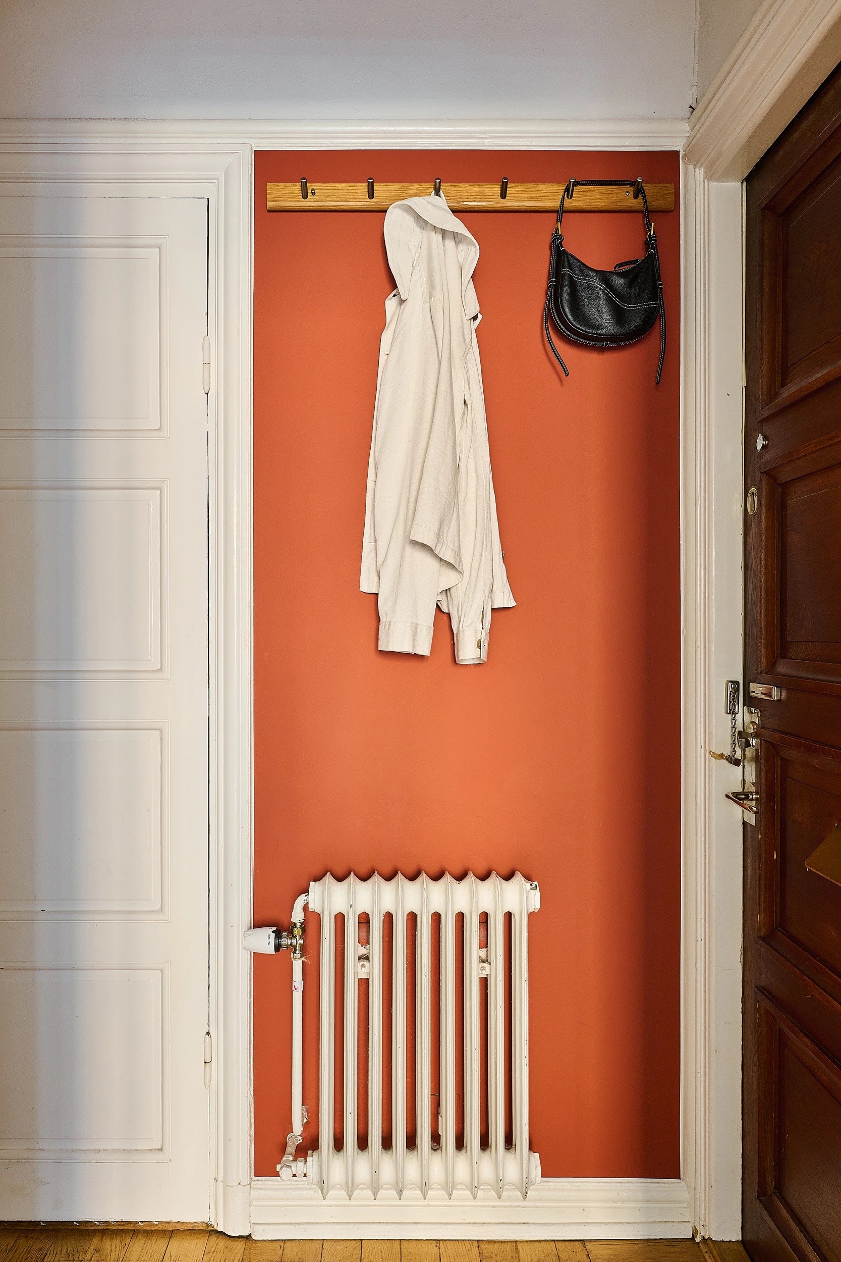 Välkomnande hall med plats för avhängning och förvaring. Här finns en tidstypisk radiator och bevarade originaldetaljer som sätter tonen direkt vid entrén. I anslutning till hallen finns dessutom en praktisk klädkammare som ger extra förvaringsmöjligheter.