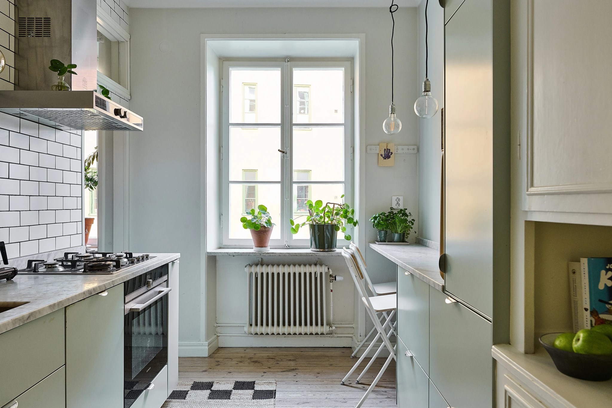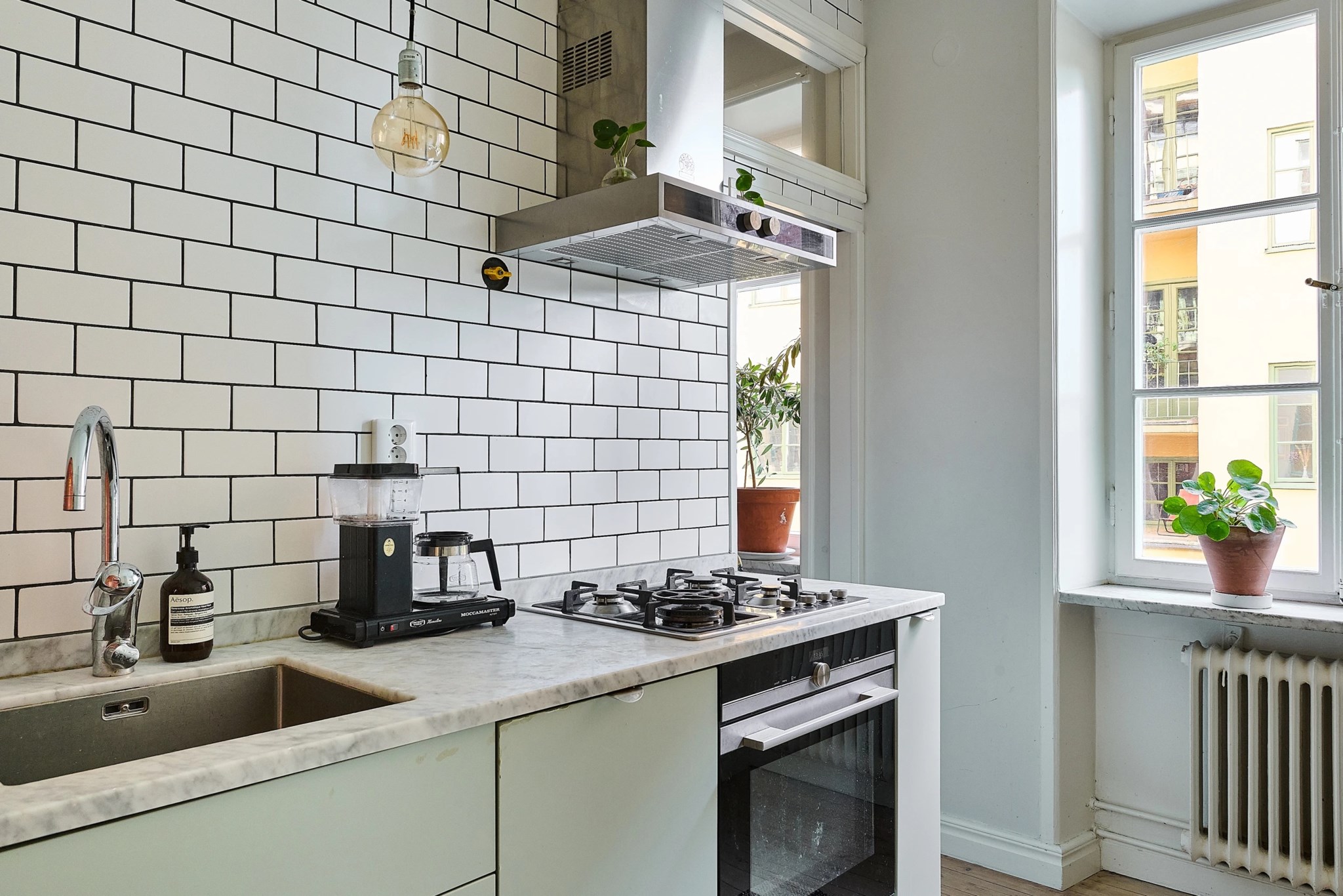 Stilrent kök (2019) utrustat med ugn, gasspis, kyl/frys och diskmaskin. Moderna materialval i kombination med klassiskt kakel skapar en tidlös känsla. Det generösa ljusinsläppet gör köket både inbjudande och funktionellt.