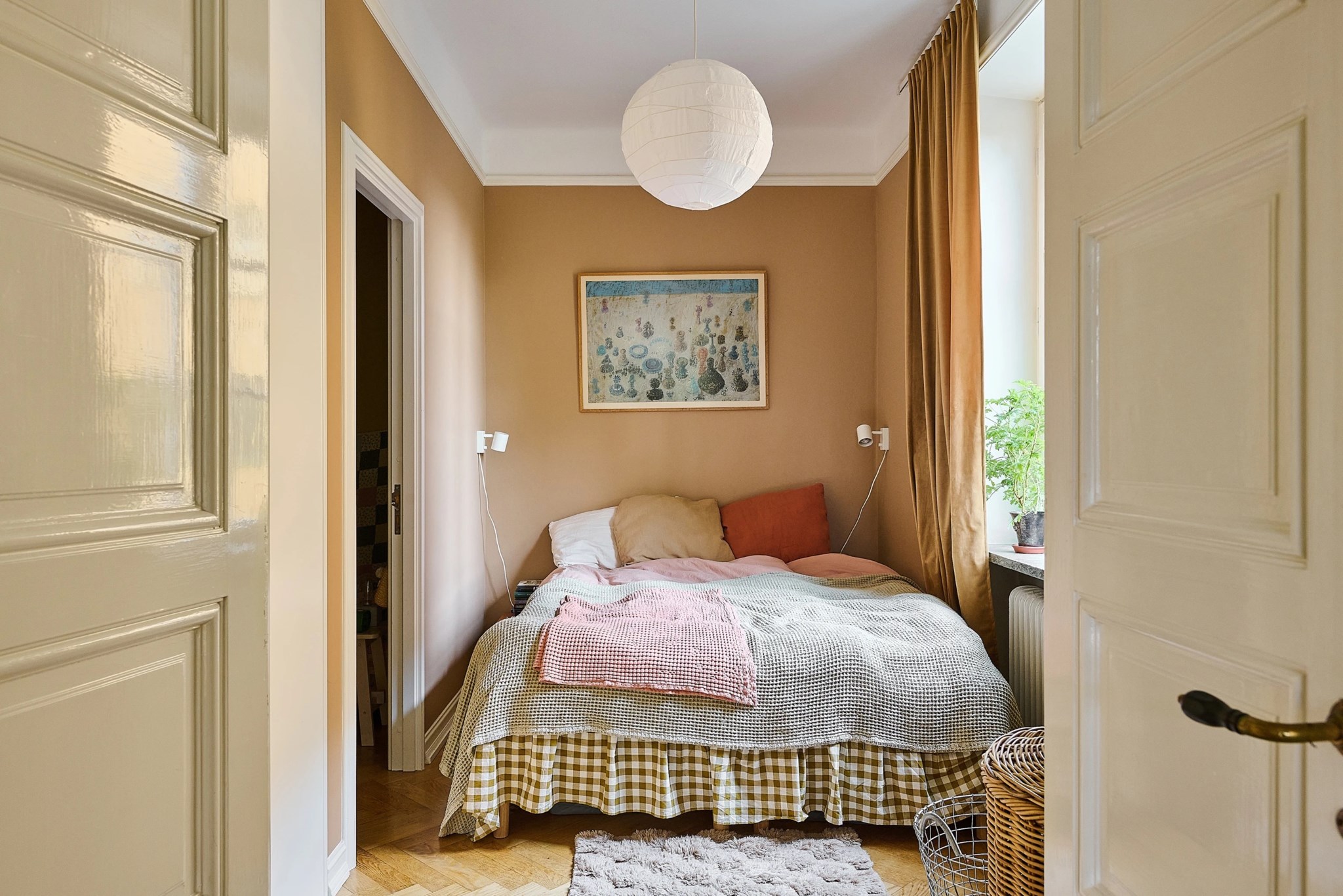 Rofyllt sovrum med plats för säng, sängbord och övrigt möblemang. Ett fönster ger fint ljusinsläpp och bevarade detaljer bidrar till rummets charm.