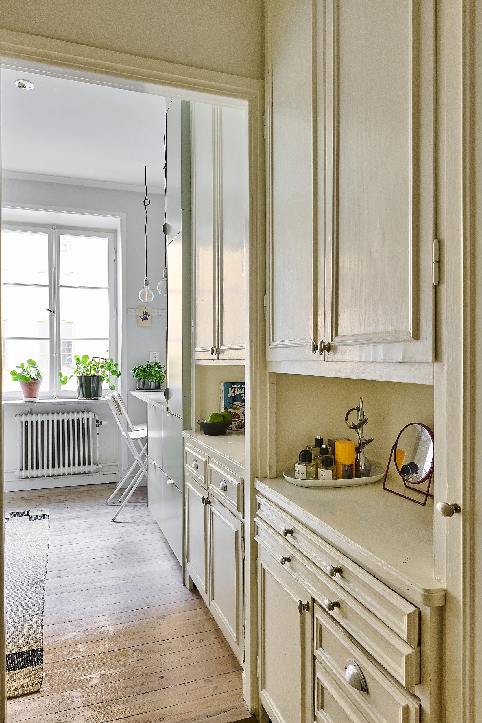 klassiskt parkettgolv som förstärker bostadens tidstypiska karaktär.Kök