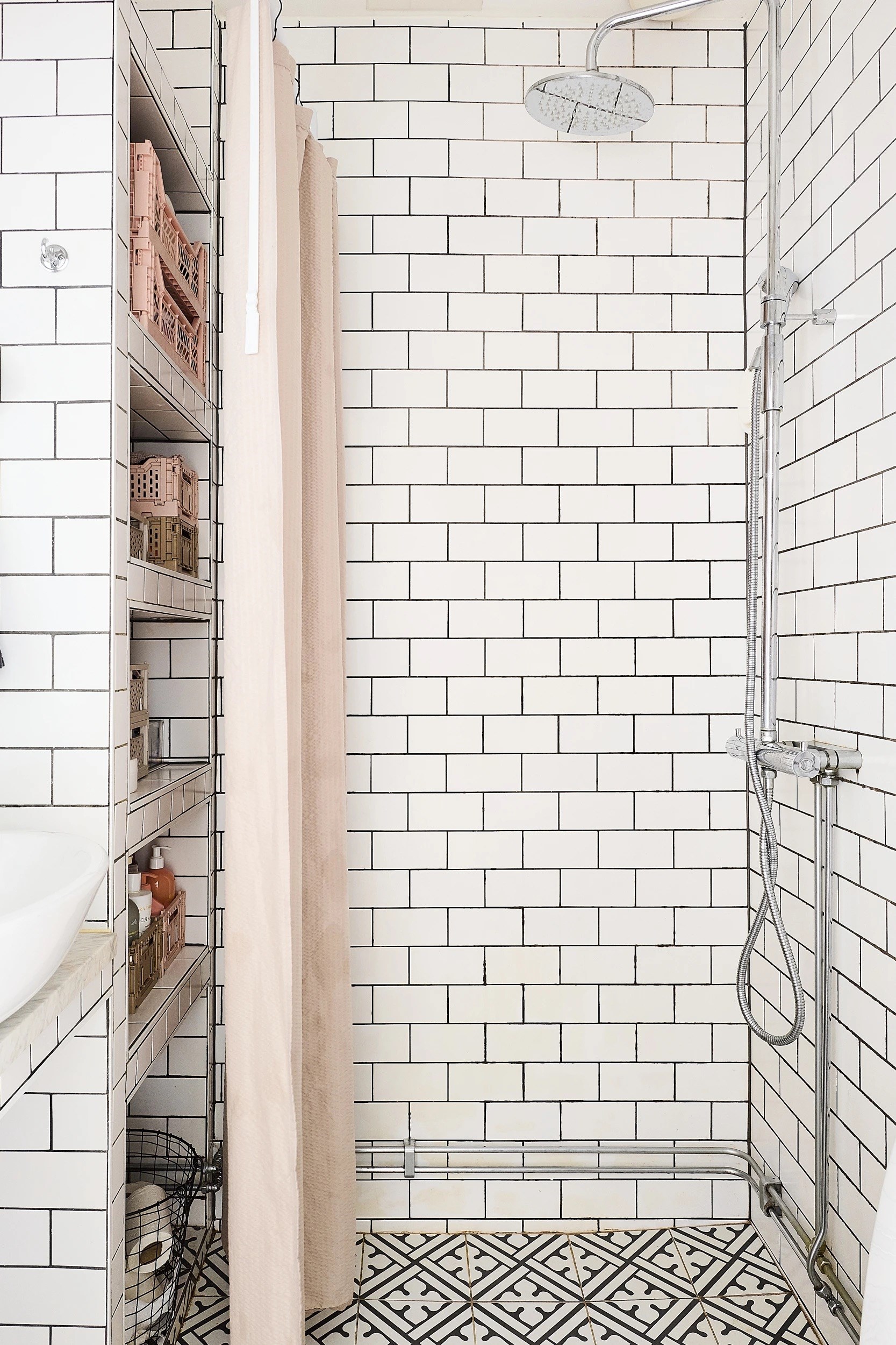 Fräscht badrum (2019) med WC, dusch, handfat och platsbyggda hyllor som ger