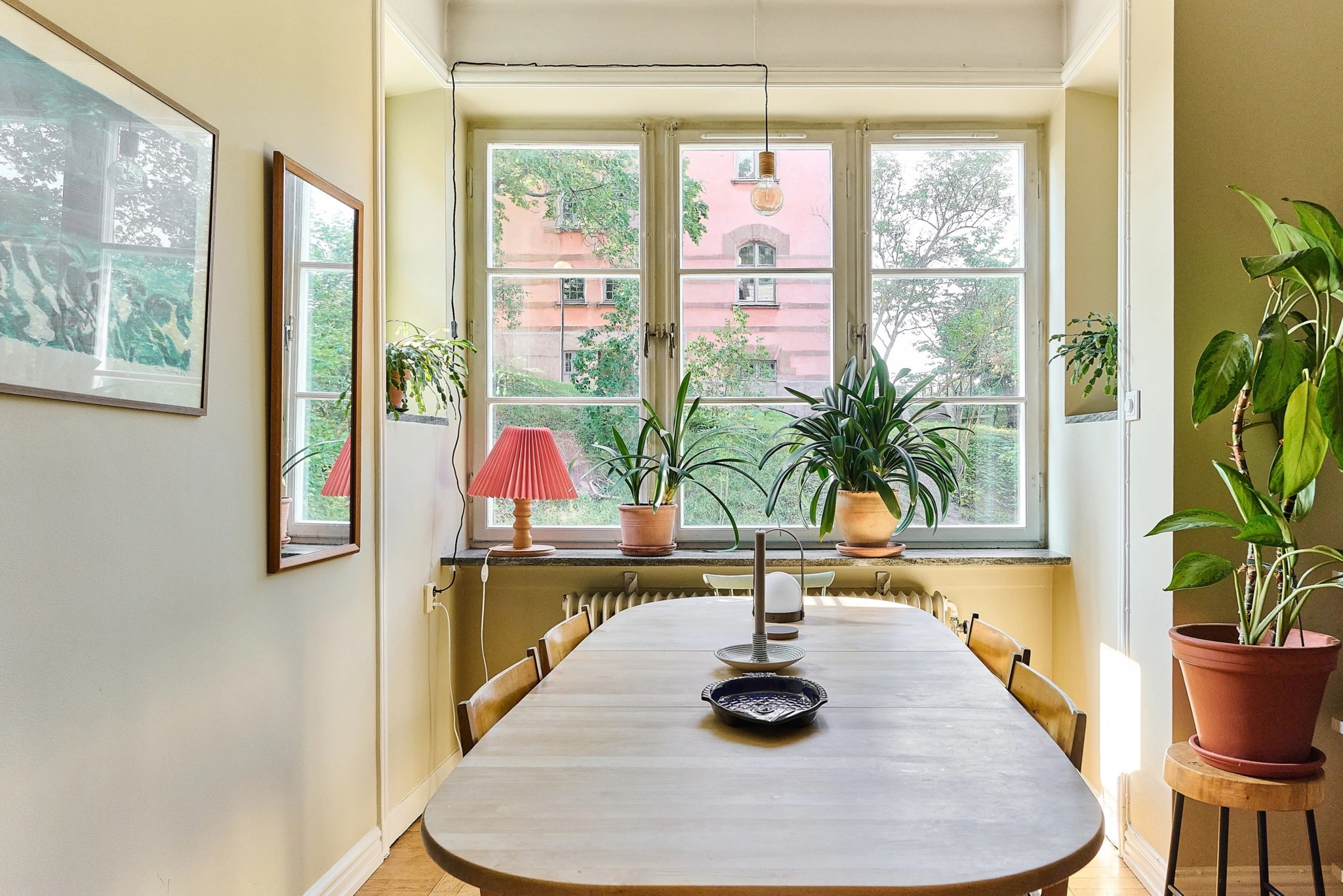 Ljust och luftigt vardagsrum med generöst fönsterparti och ett vackert burspråk som släpper in rikligt med dagsljus. Rummet har en trivsam rymd med plats för både soffgrupp och matsalsmöbel. Fiskbensparkett och tidstypiska detaljer i form av djupa fönsternischer och vackra snickerier skapar en harmonisk atmosfär. Ett socialt rum som inbjuder till umgänge och avkoppling.